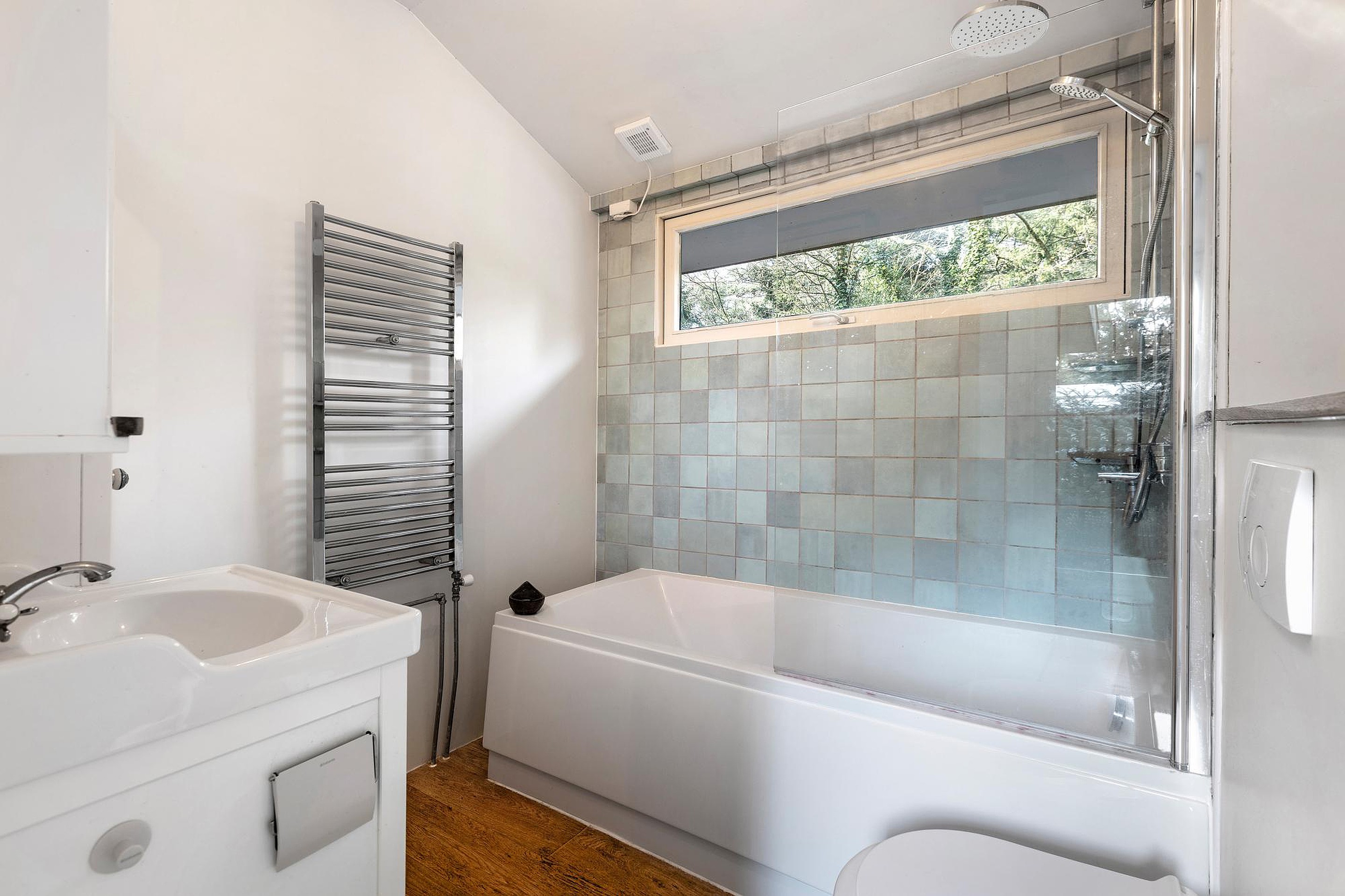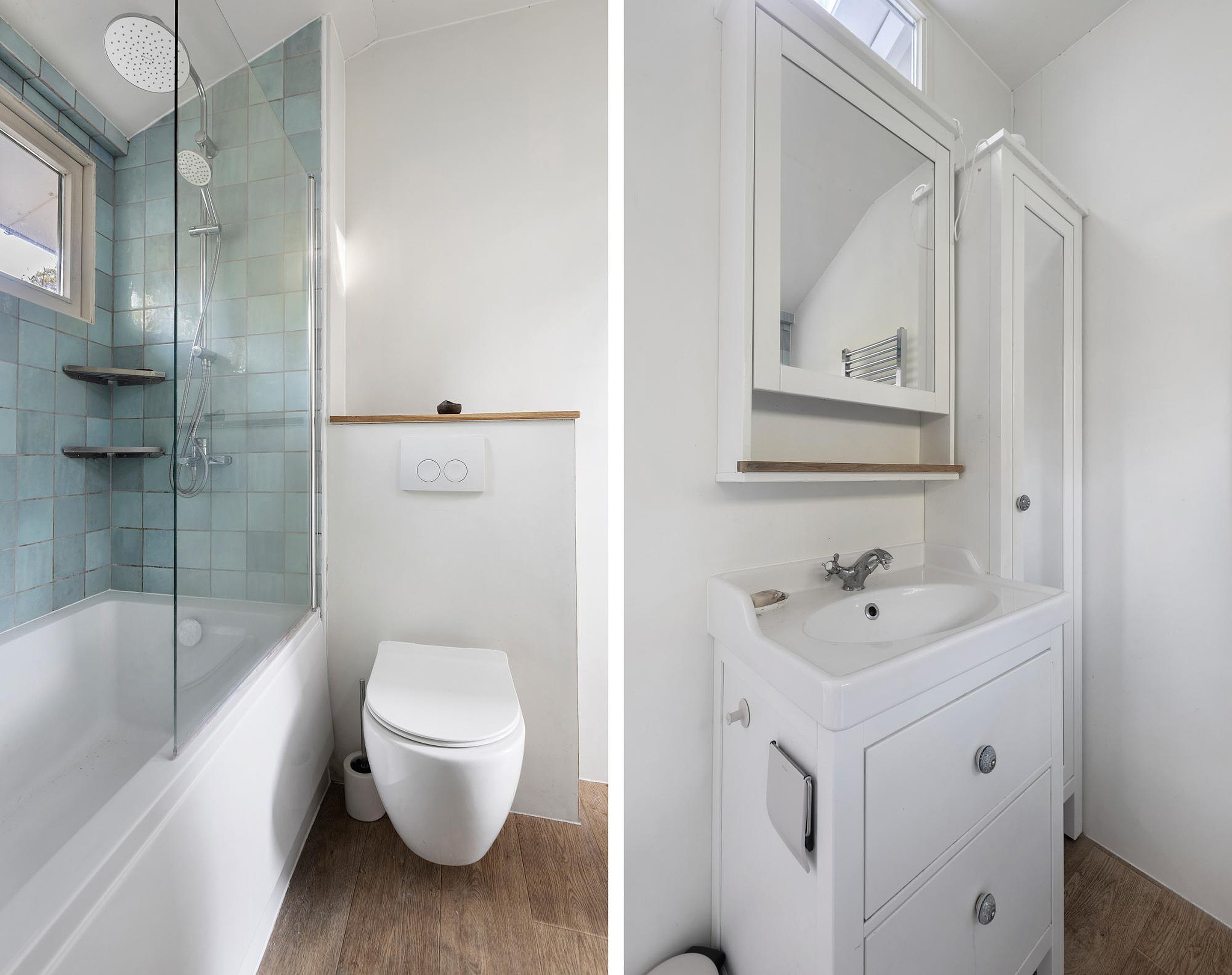 Aangrenzend bevindt zich de badkamer, die recent is vernieuwd en beschikt over een nieuw ligbad. De woning wordt verwarmd door een nieuwe cv-ketel en is volledig voorzien van dubbel glas, wat zorgt voor goede isolatie en energiezuinig wonen. Ook is er airconditioning in de woning aanwezig.