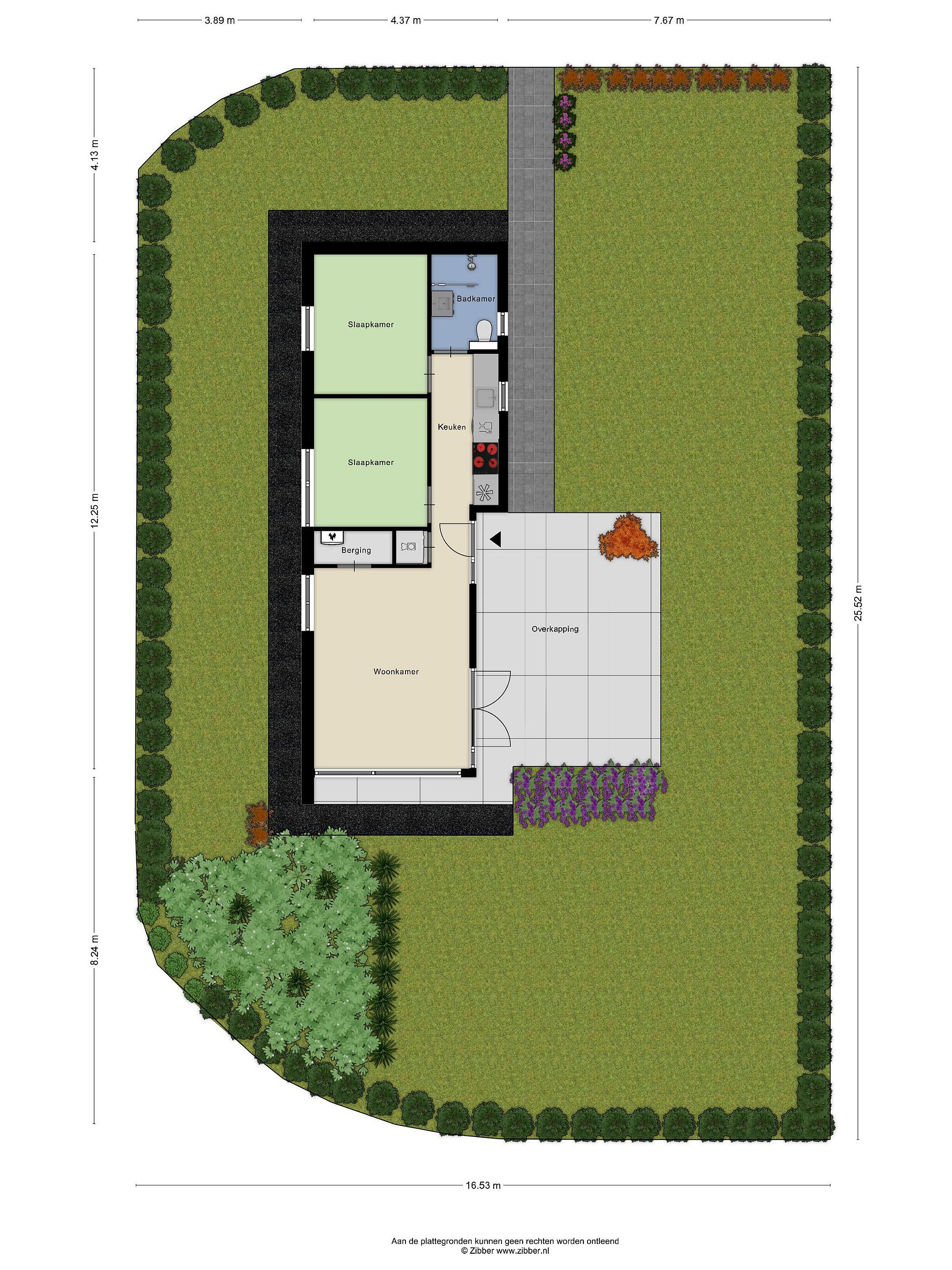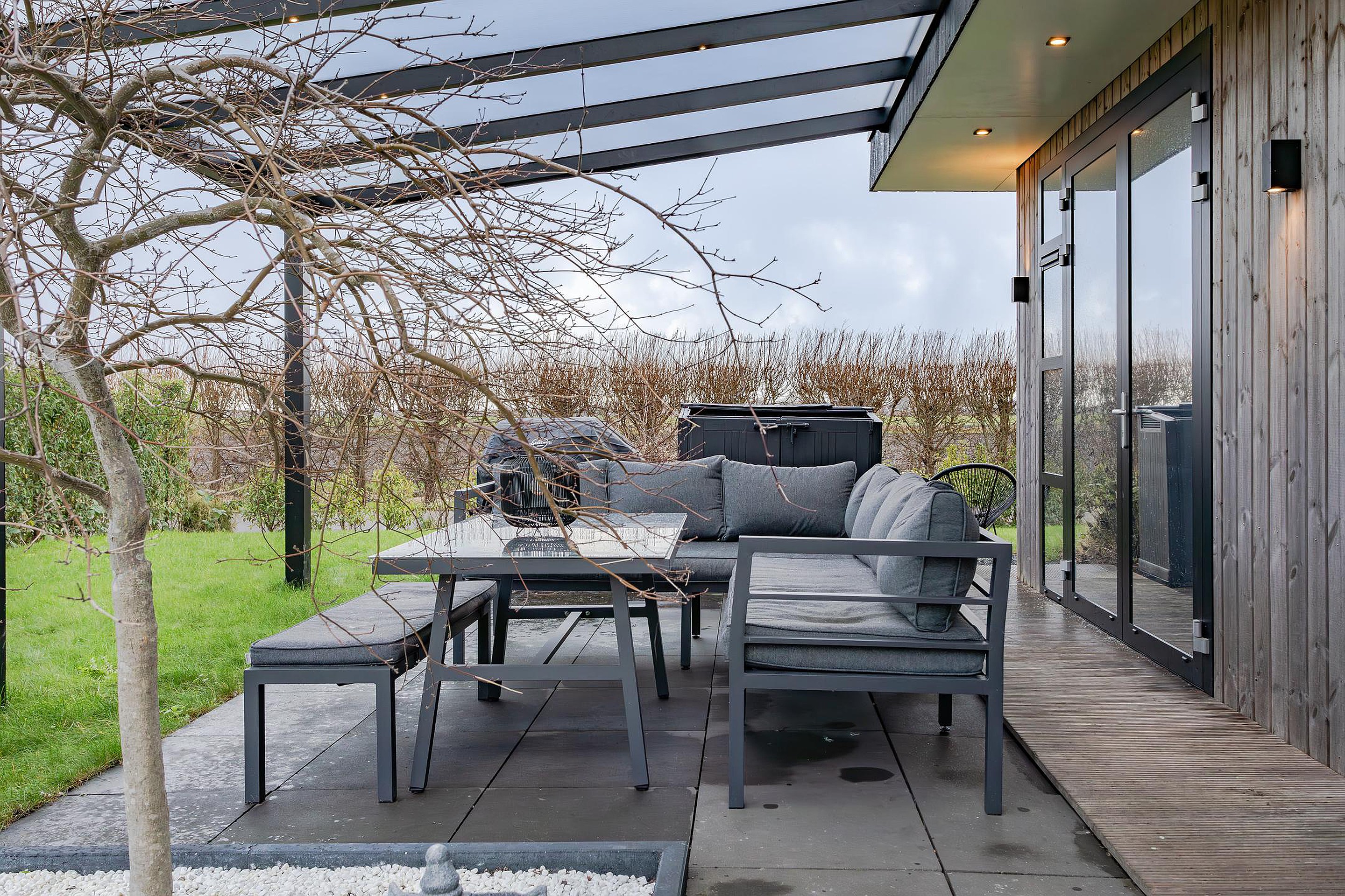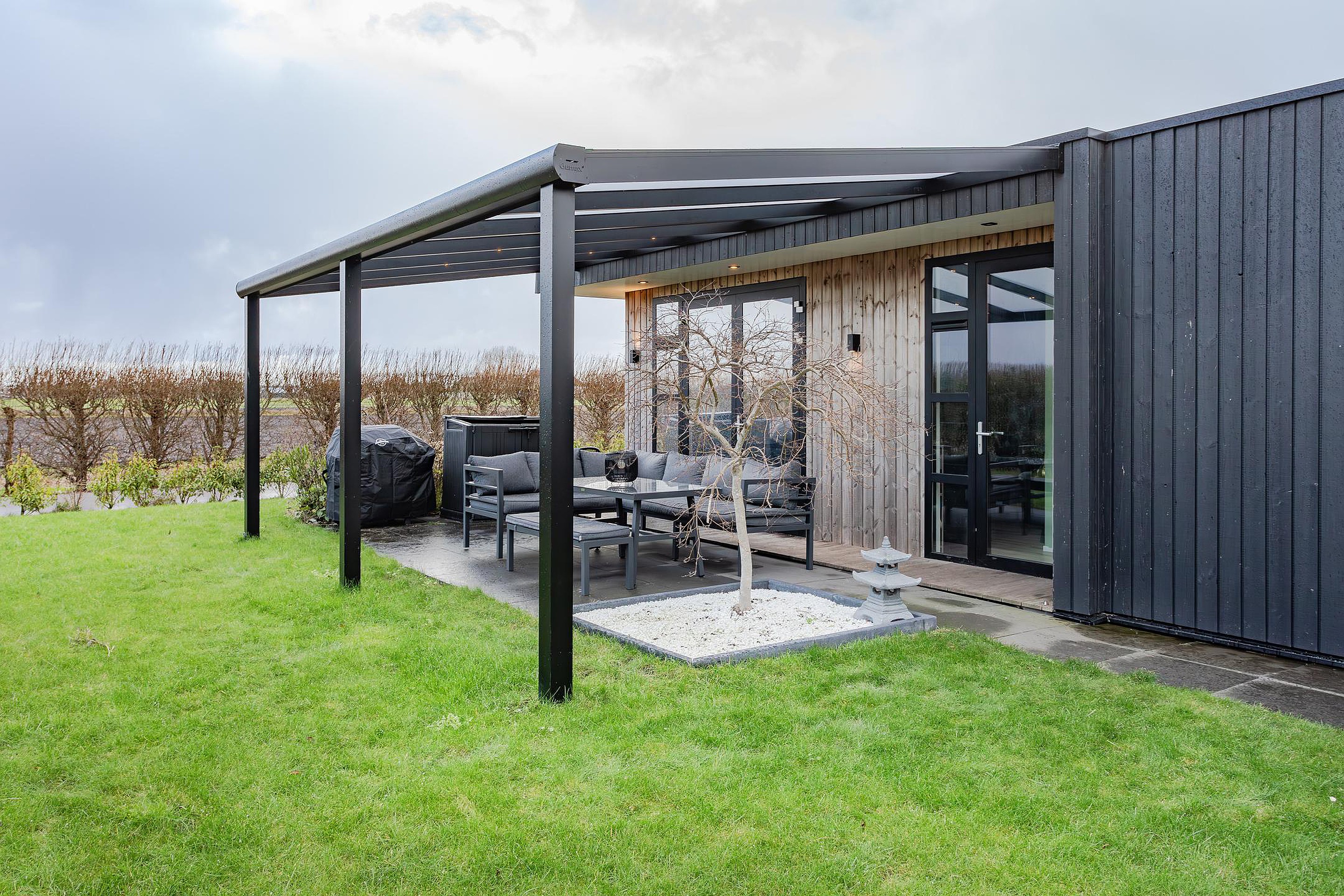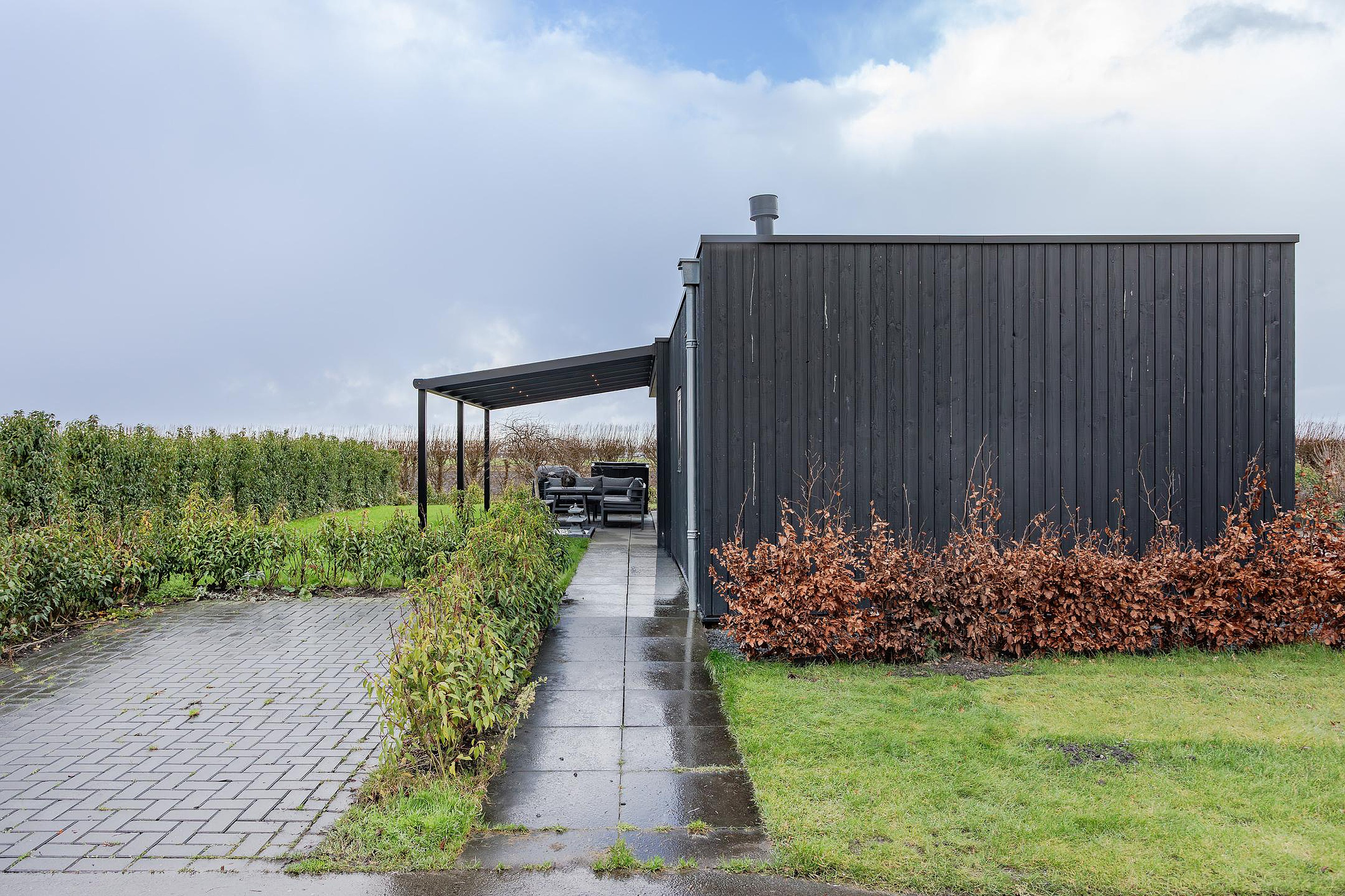 Fijne en zonnig gelegen tuin waar u de hele dag van de zon kan genieten. In de zomer van 2024 is de stijlvolle overkapping met verlichting geplaatst waar het ook ’s avonds heel prettig en gezellig vertoeven is. Rondom de woning is een grindpad aangelegd en de gevelbekleding is uitgevoerd in stijlvol gekleurd hout met buitenlampjes en een buitenkraan. Ook de verlichting in het overstek geeft een sfeervolle uitstraling aan de woning.