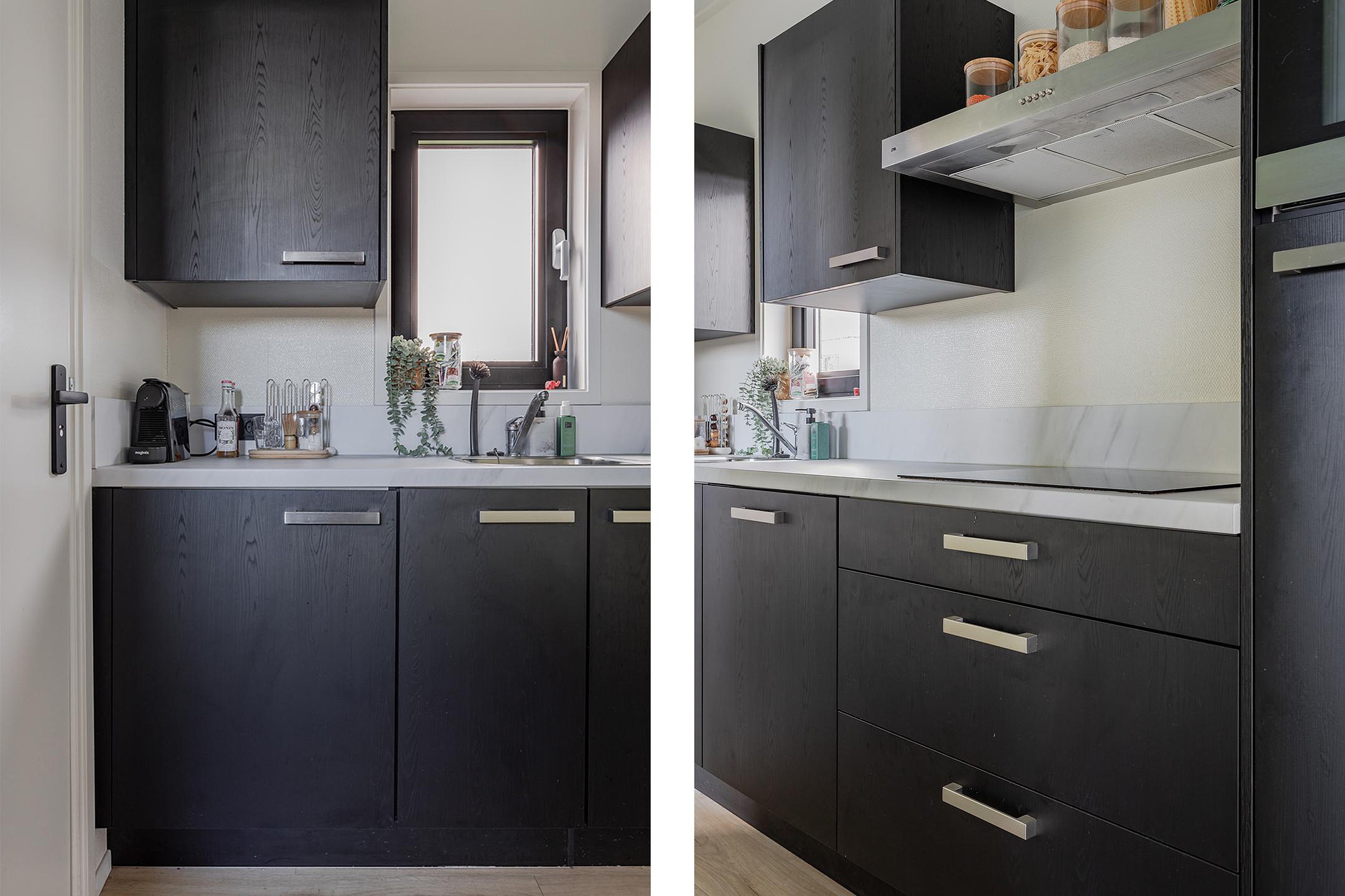 Moderne keuken in een rechte opstelling met composiet werkblad, draai/kiepraam boven het werkblad, laden, bovenkastjes en diverse inbouwapparatuur, zoals: de koelkast met vriesvak, combimagnetron, inductie kookplaat, afzuigkap met de afvoer naar buiten en de vaatwasser.