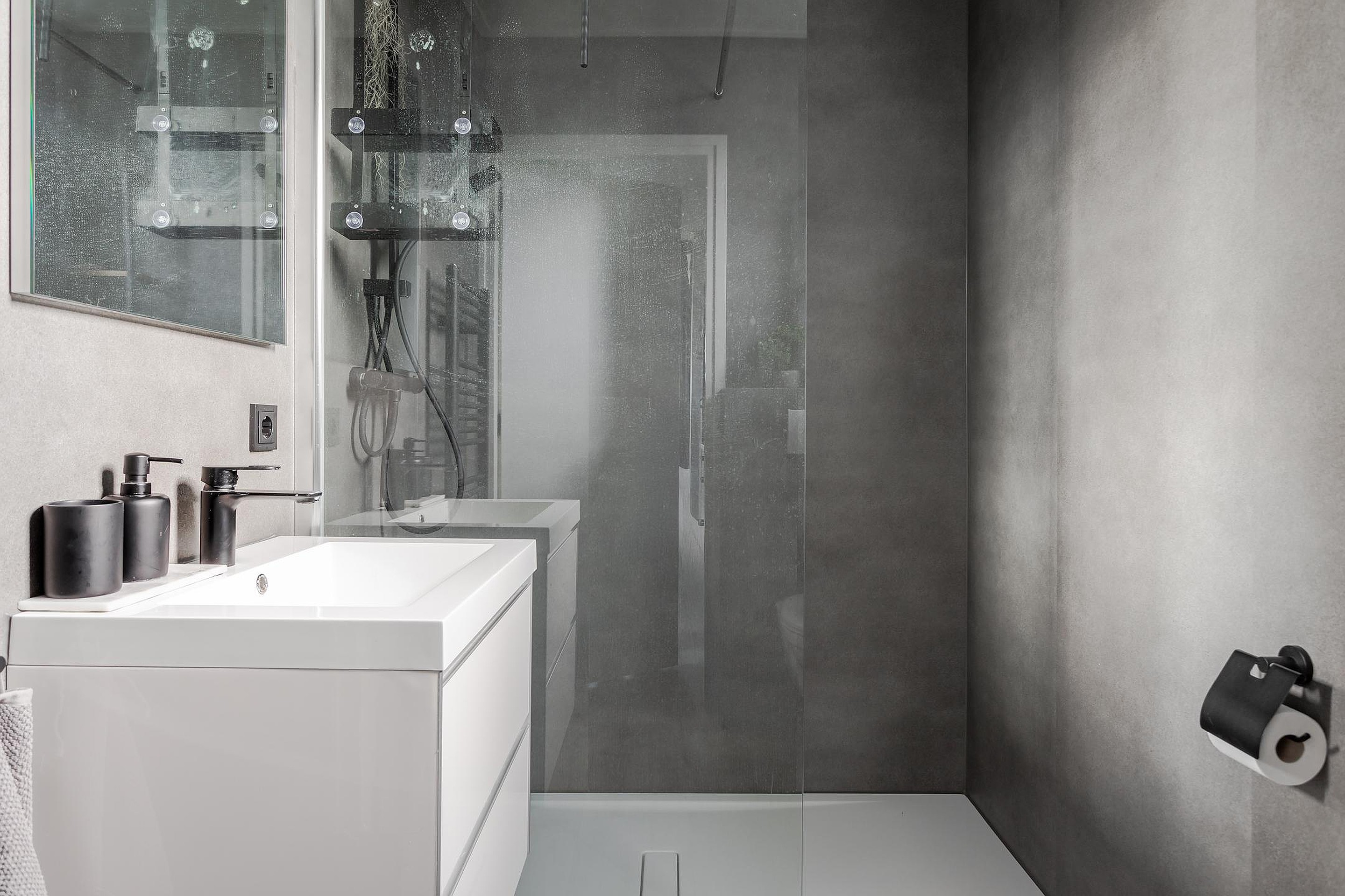 Ruime badkamer met een PVC vloer, lichte wandbekleding, mechanische afzuiger en een raam met ventilatierooster. U treft hier een inloopdouche met glazen wand, thermostaatkraan met hand- en regendouche, designradiator, een wandcloset , stopcontact en wastafelmeubel met 2 laden en spiegel en inbouwspots verlichten de badkamer.