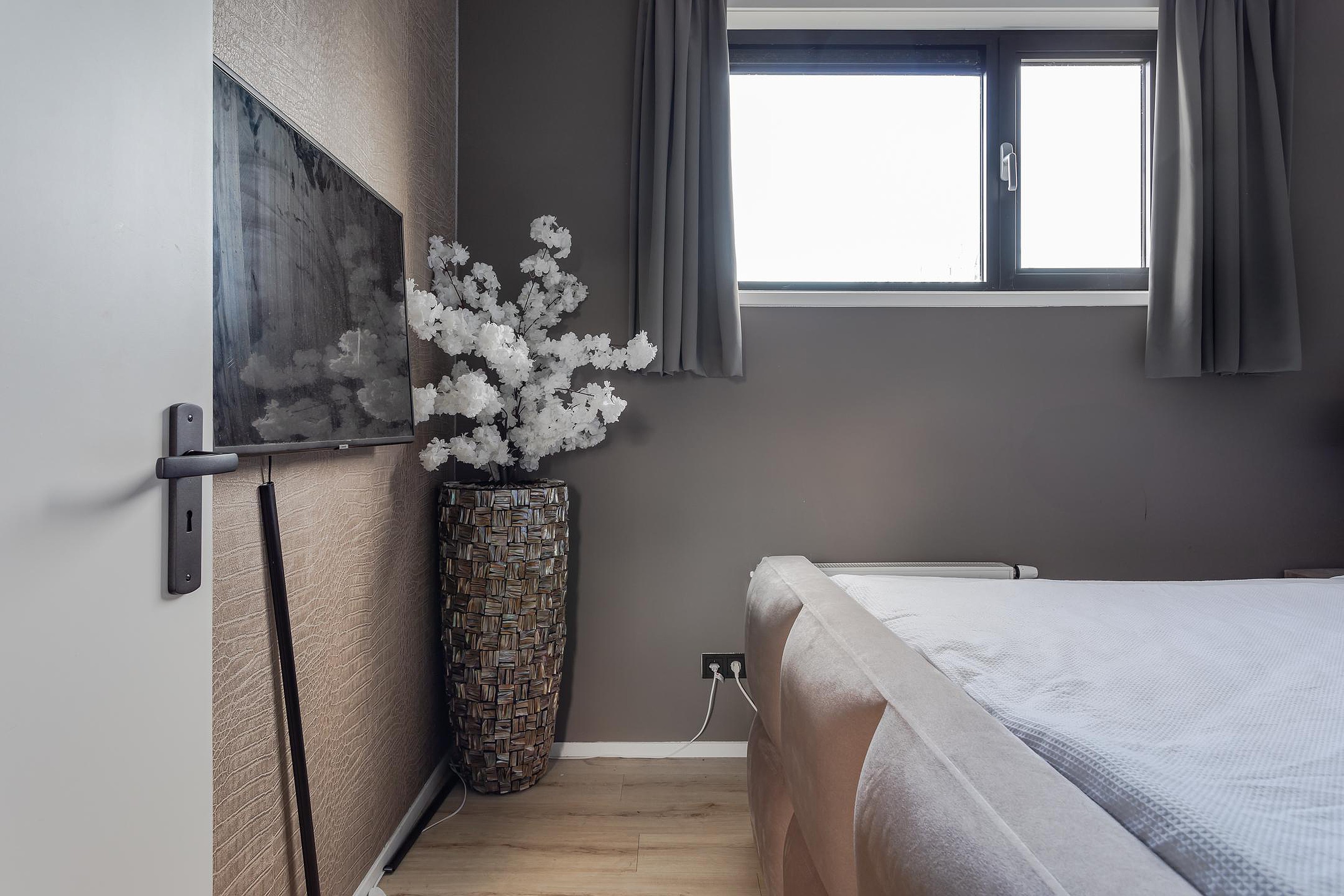 1e Slaapkamer – ruime kamer met hoge raampartij en draai/kiepraam. De PVC vloer is hier doorgelegd, tevens vliesbehang op de wanden en inbouwspots in het plafond.