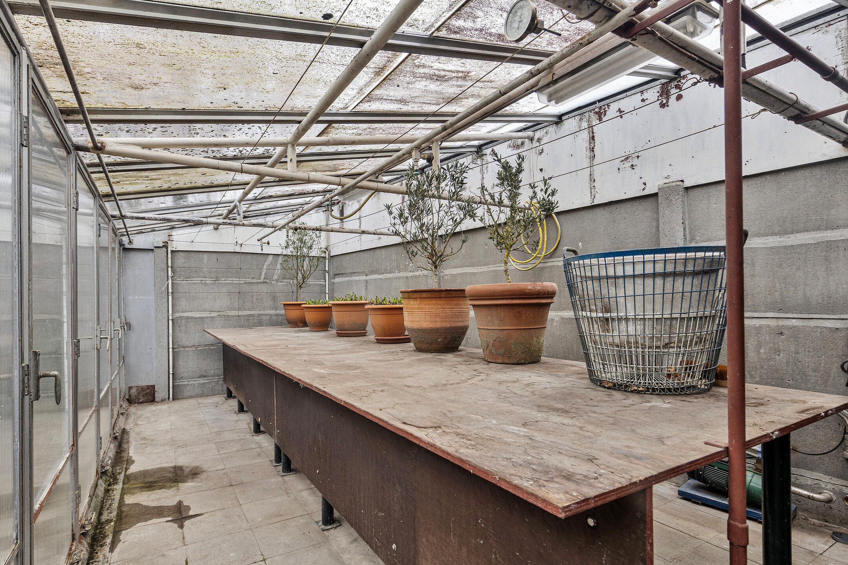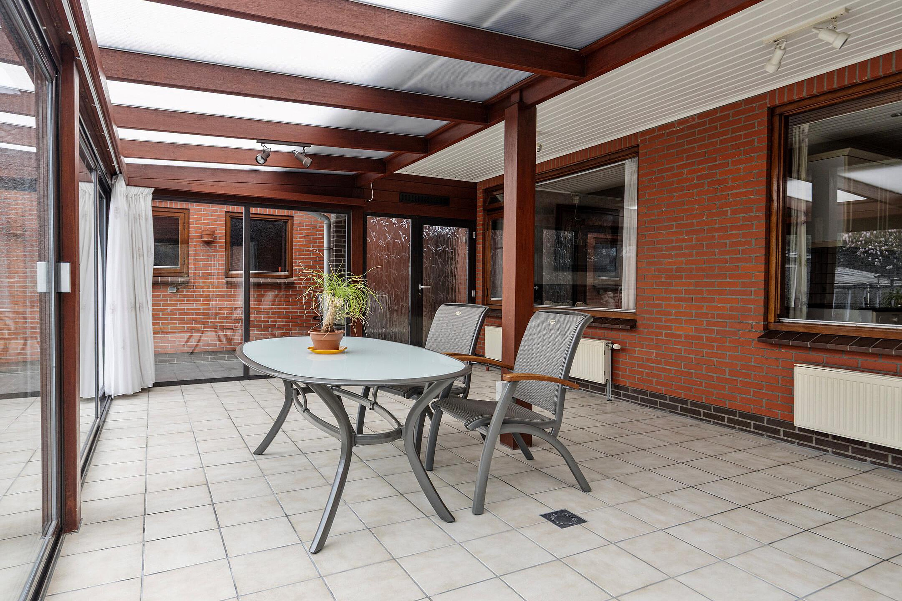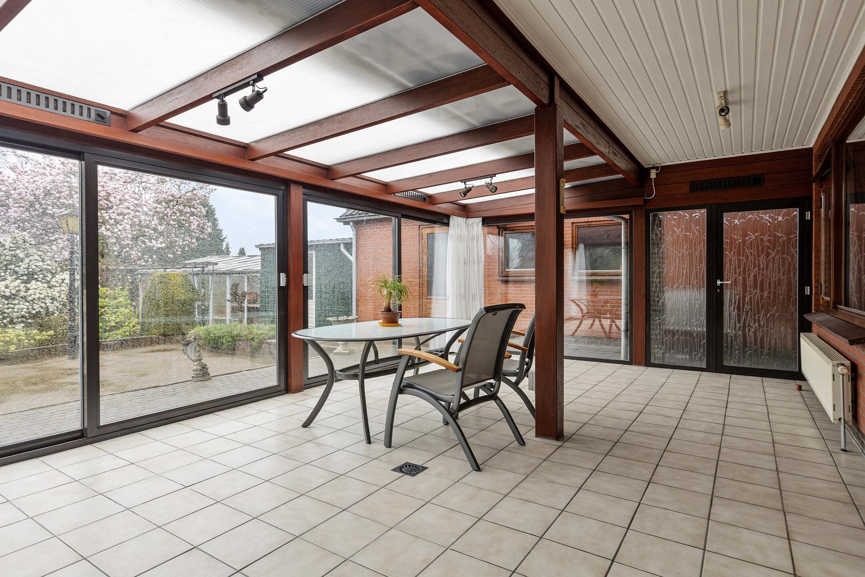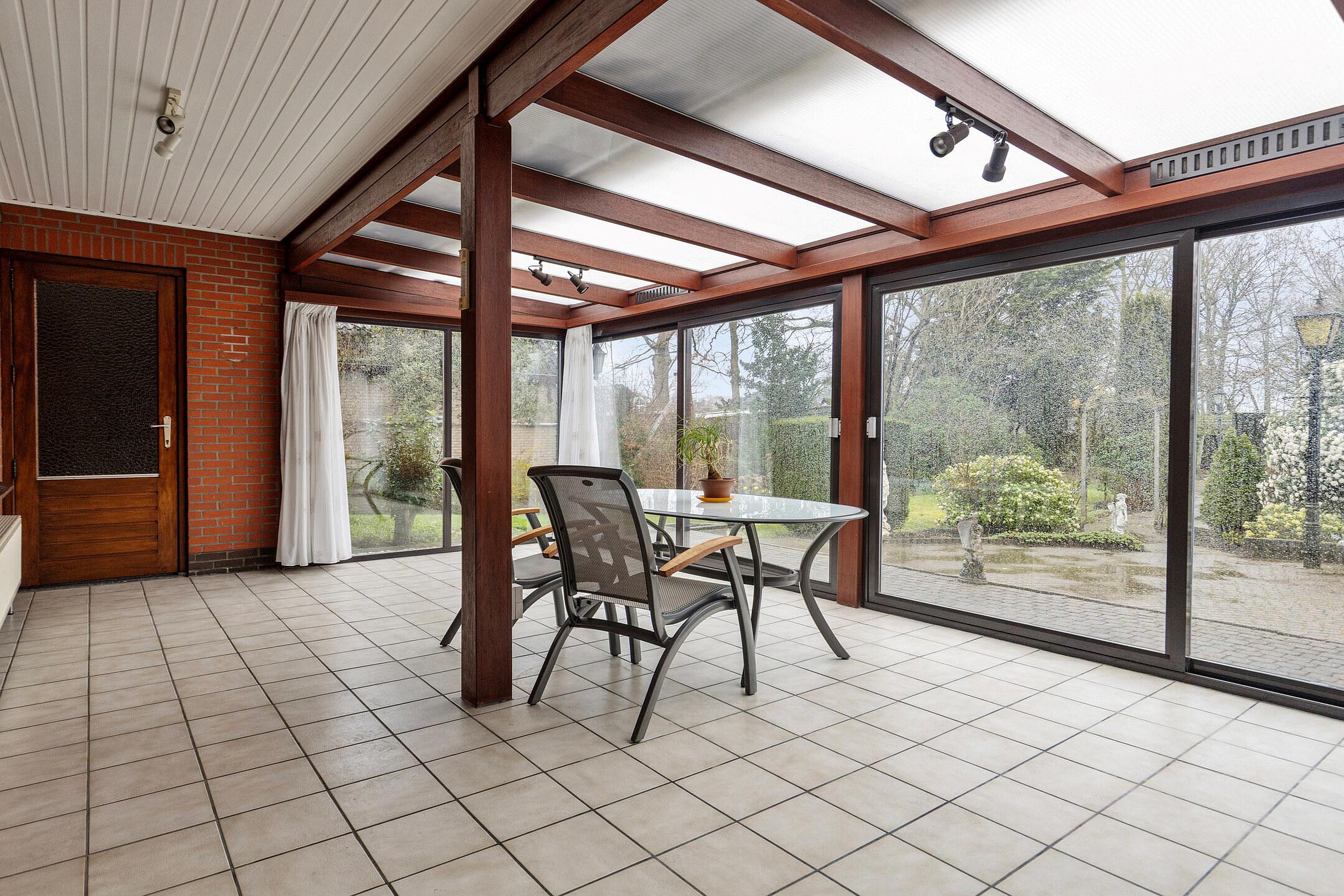 Het absolute hoogtepunt van deze woning is de enorme serre aan de achterzijde. Dankzij de grote schuifpui en het vrije uitzicht over de tuin voelt het hier alsof buiten en binnen volledig in elkaar overlopen. Een plek waar je het hele jaar door kunt genieten van rust, groen en privacy.