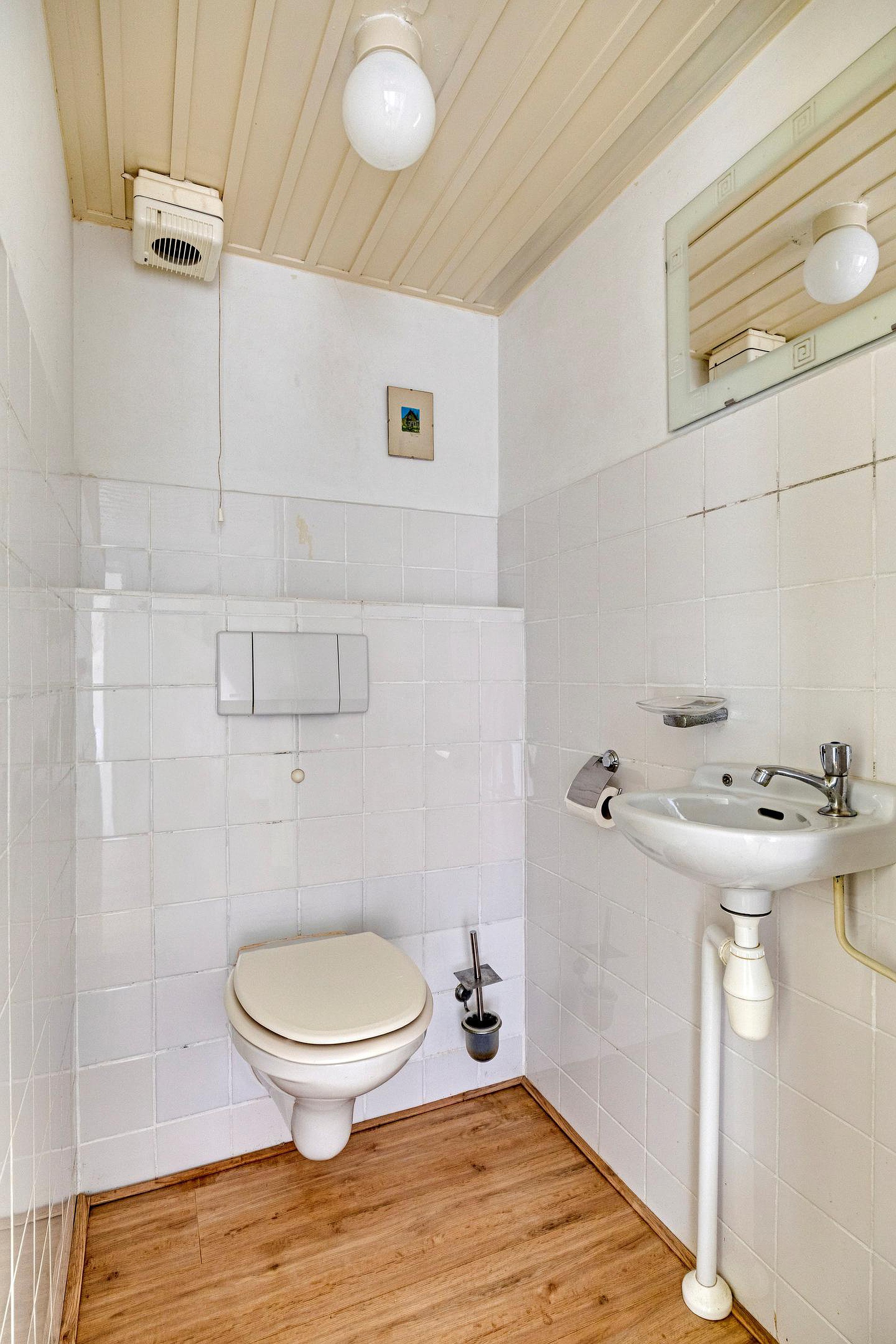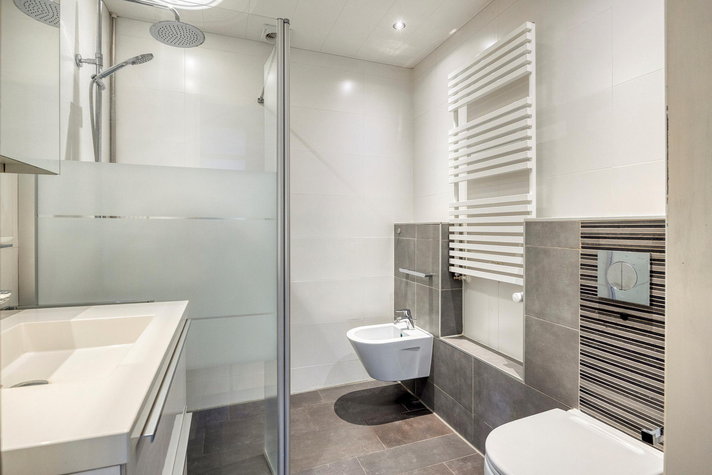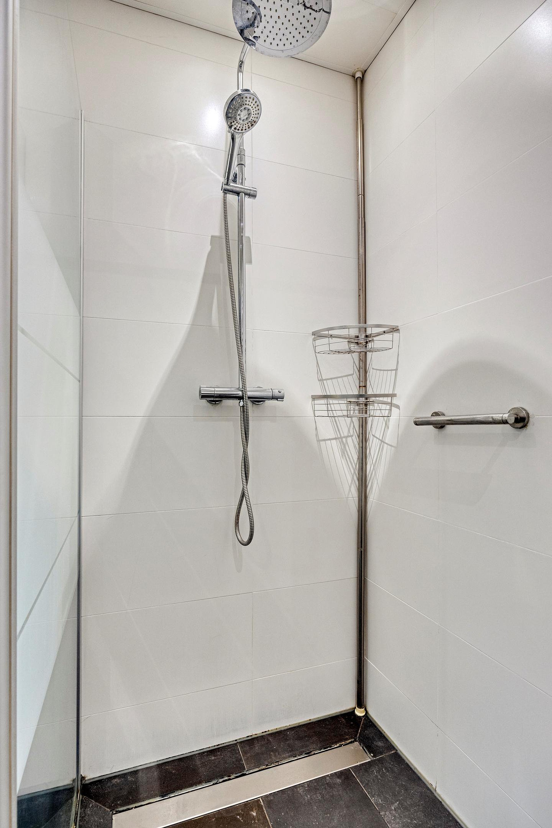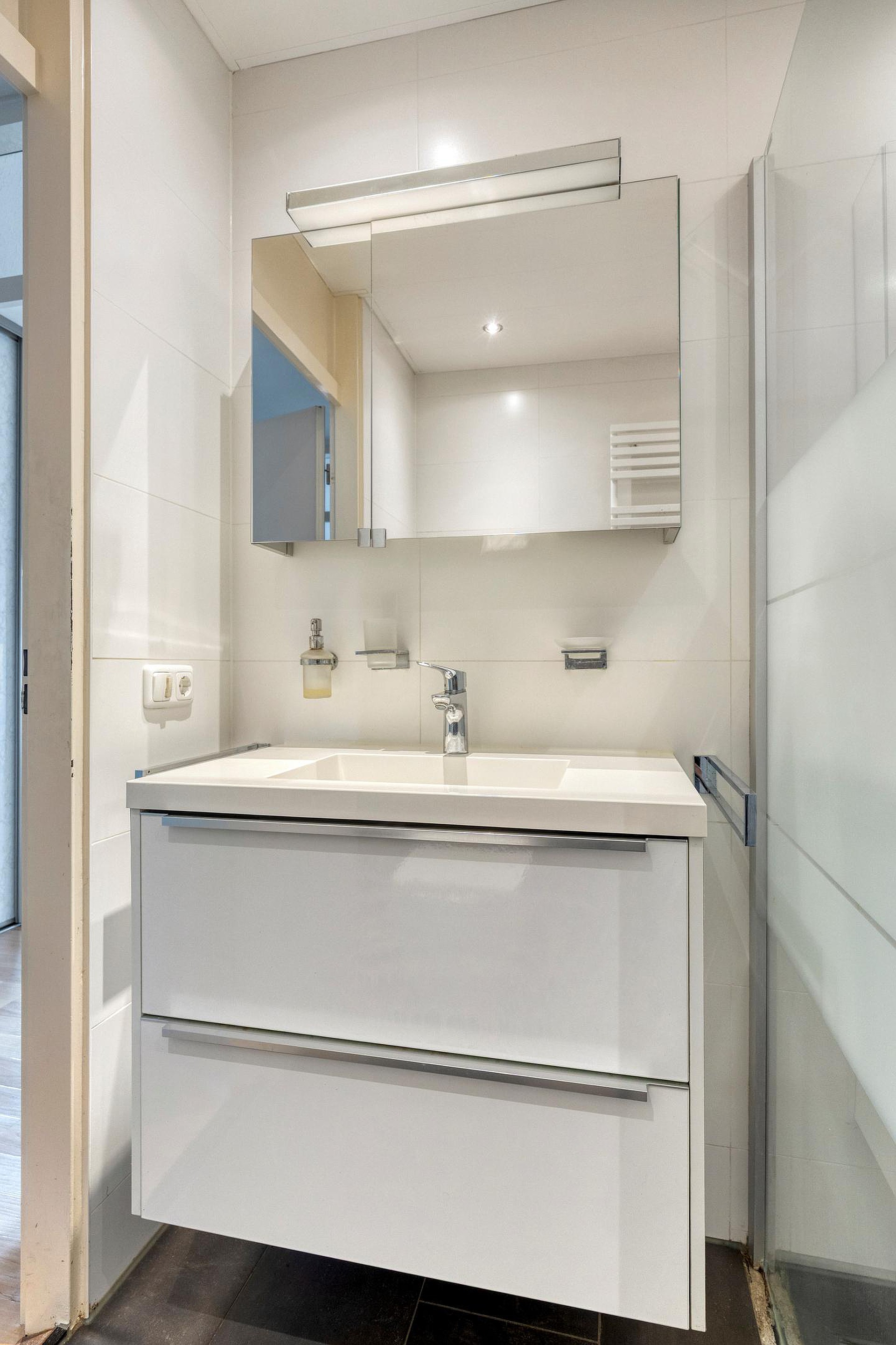 Vervolgens komt u in de tussenhal met vaste kast. Deze biedt toegang tot de badkamer en twee slaapkamers. De badkamer is voorzien van wastafel, inloopdouche, urinoir en een toilet. De voorste slaapkamer is voorzien van een inbouwkast. De achterste slaapkamer is eenvoudig te veranderen in twee slaapkamers door het plaatsen van een tussenwand.