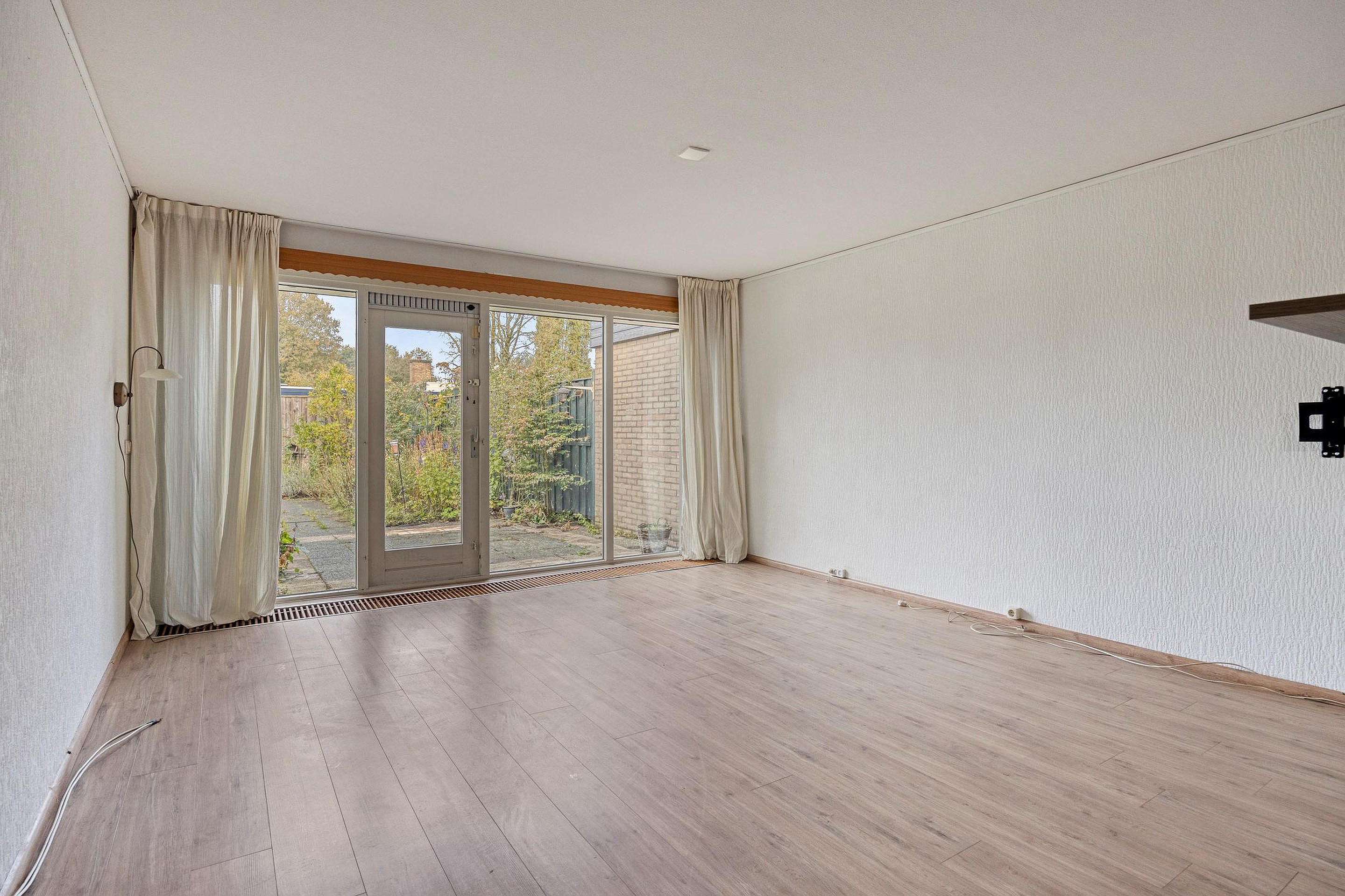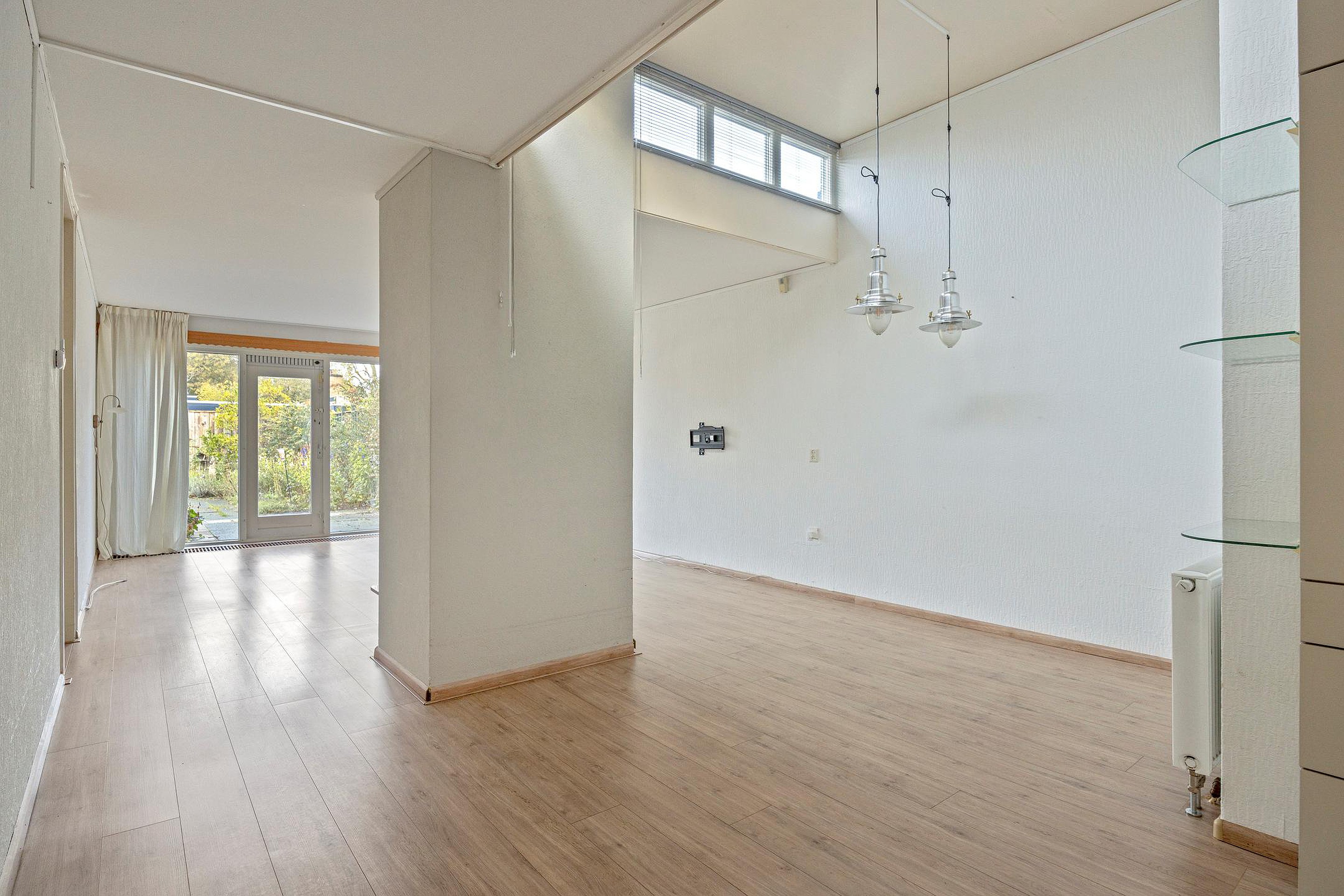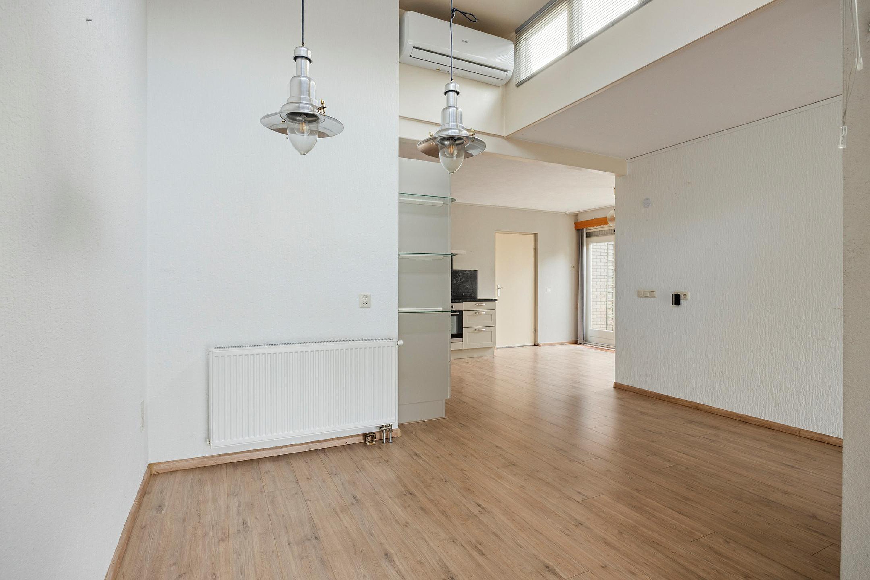 De woonkamer is licht en verassend ruim. De ruimte wordt gescheiden door een openhaard met afvoerkanaal. Airco aanwezig.