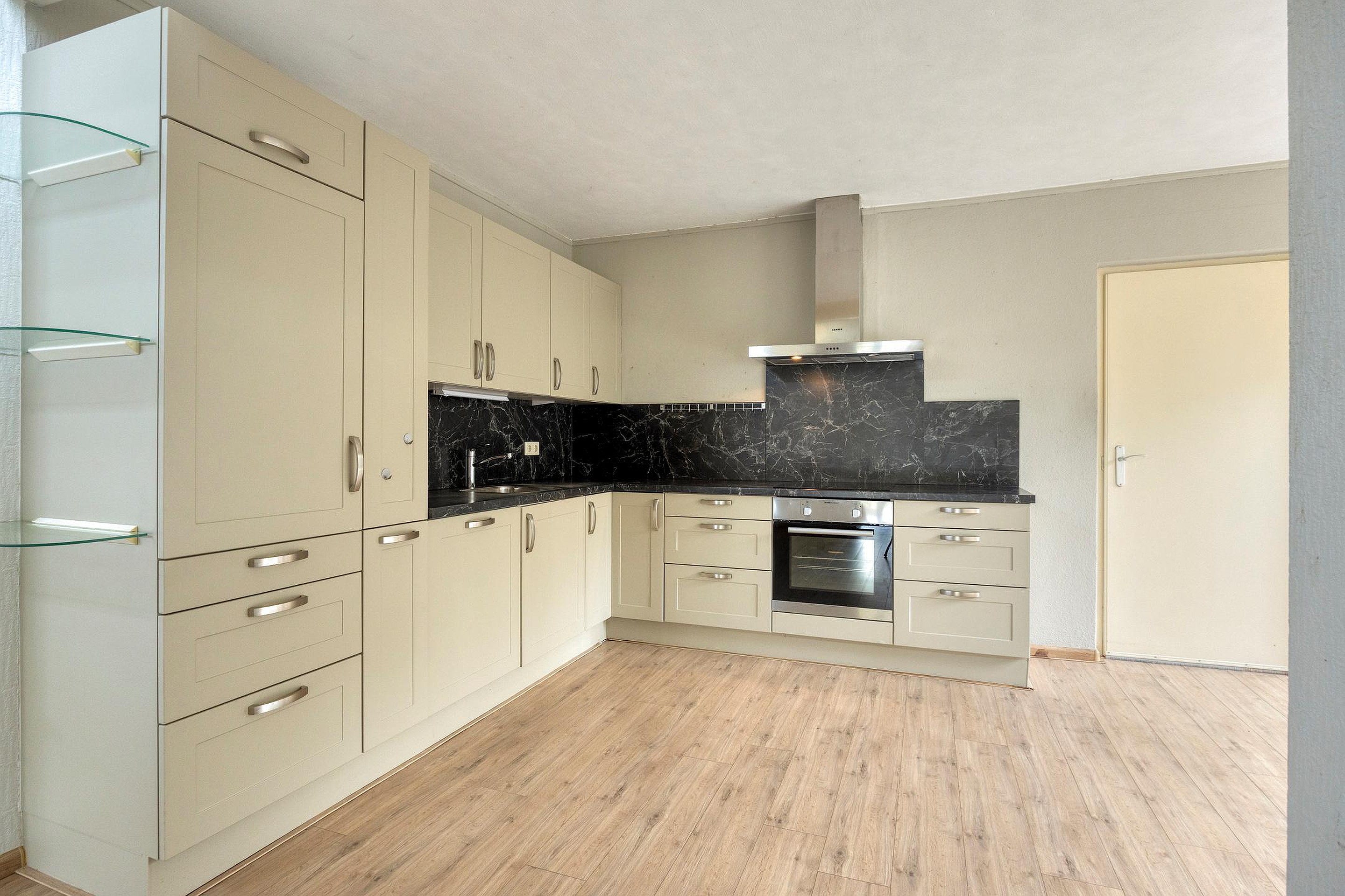 Vervolgens komt u in de keuken. De keuken is voorzien van een inbouw hoekkeuken met oven, gasfornuis, koelkast en vaatwasser. De keuken biedt toegang tot de patio, een knusse buitenplek waar je tot in de late uurtjes kan genieten. Vanuit hier is de cv-ruimte bereikbaar en is er toegang tot de straat.