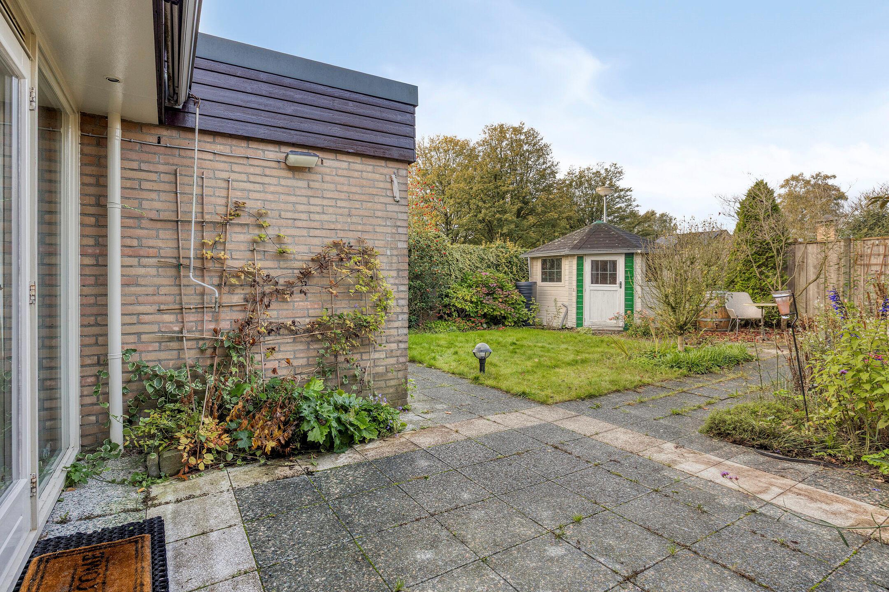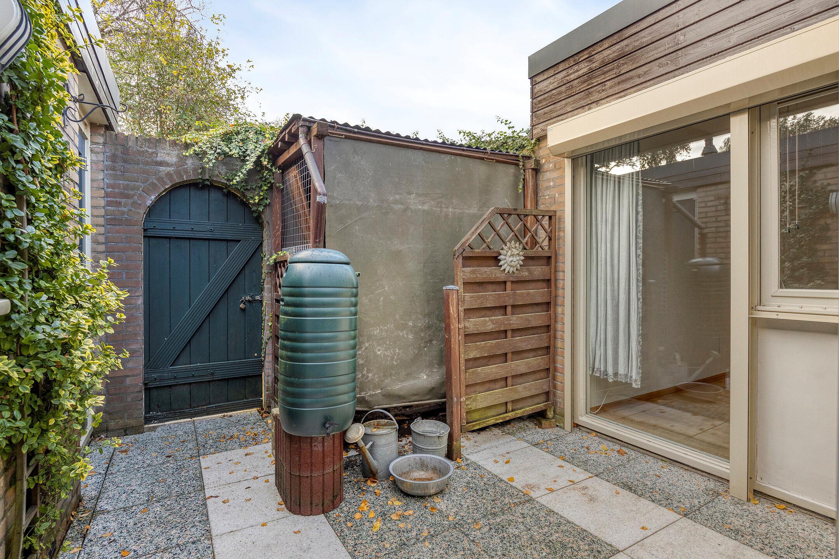 Vanuit de woonkamer is de achtertuin bereikbaar. Hier bevindt zich een tuinhuisje. De tuin is omringd door een stenen muur en schuttingen. Deze is gelegen op het westen. De achtertuin is bereikbaar vanaf de straat middels een toegangsdeur.