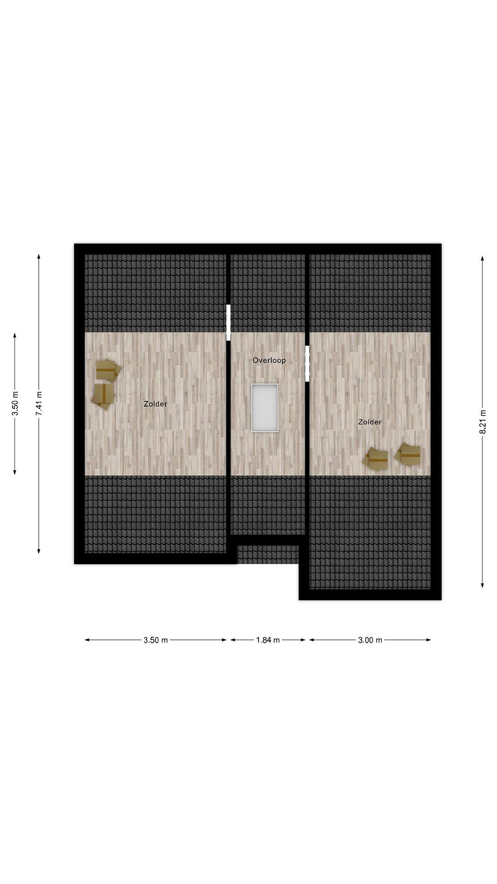 Eerste verdieping via een vlizotrap is een ruime bergzolder te vinden over het volledige huis.