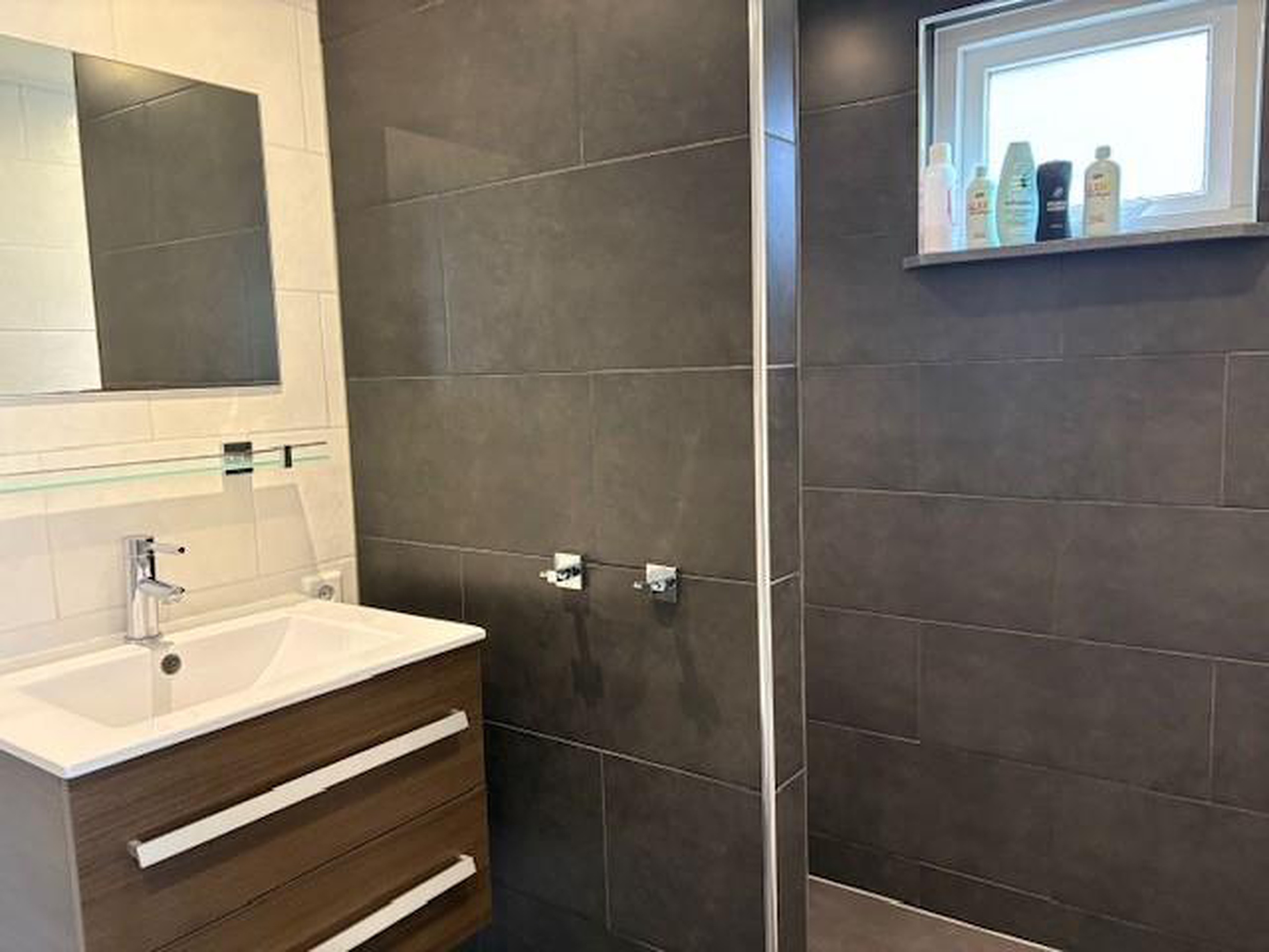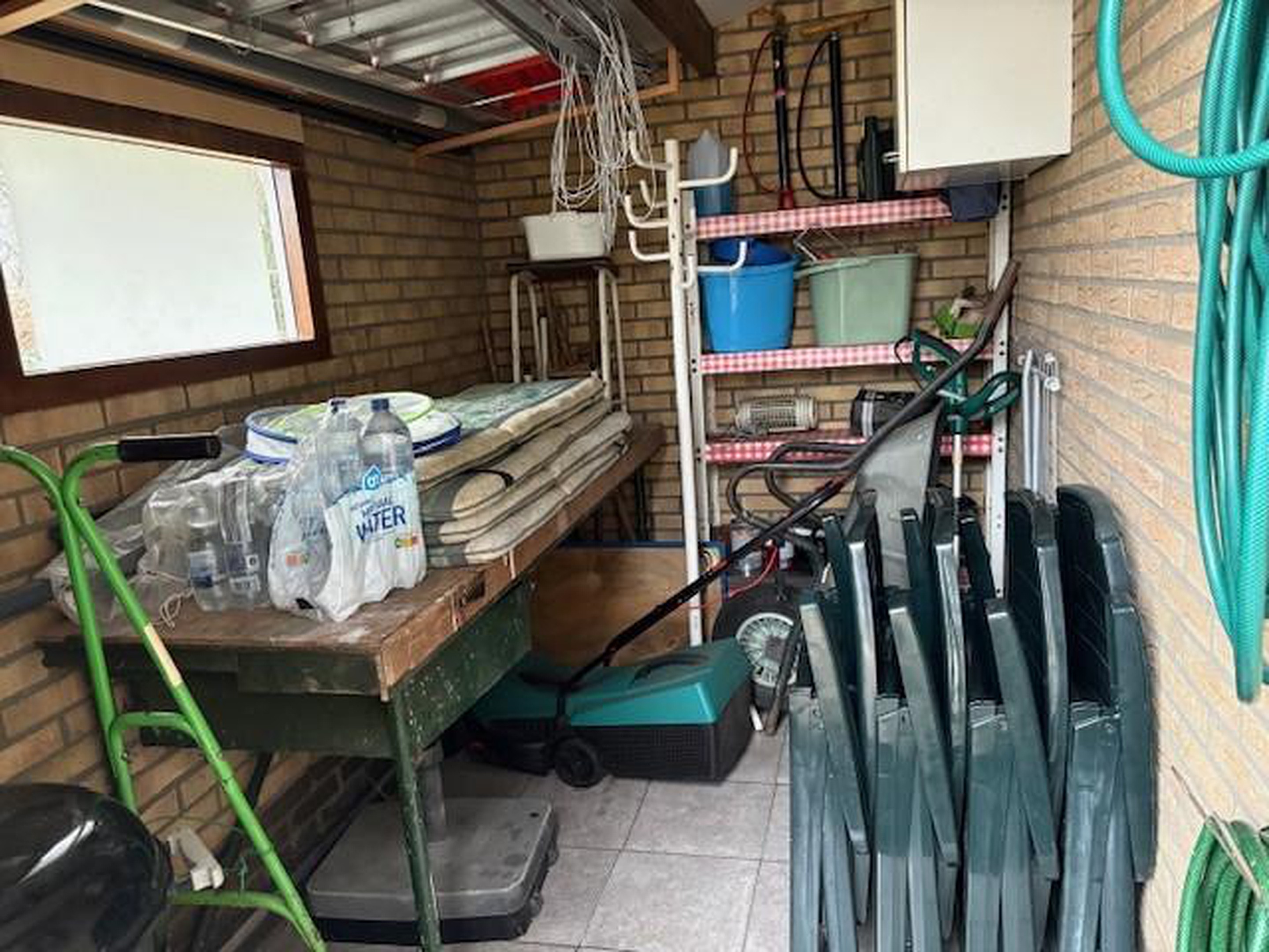 Begane grond Entree Hal met meterkast en garderobe, tevens is hier de aansluiting voor witgoedapparatuur, betegelde badkamer met ruime inloopdouche, wastafelmeubel en toilet, woonkamer met openhaard en deuren naar het overdekte terras op het zuiden, open keuken met inbouwapparatuur, koelkast vriezer, afzuigkap, 4 pits gaskookplaat, magnetron, eerste slaapkamer met kastenwand, tweede slaapkamer, buitenom een aangebouwde stenen berging.