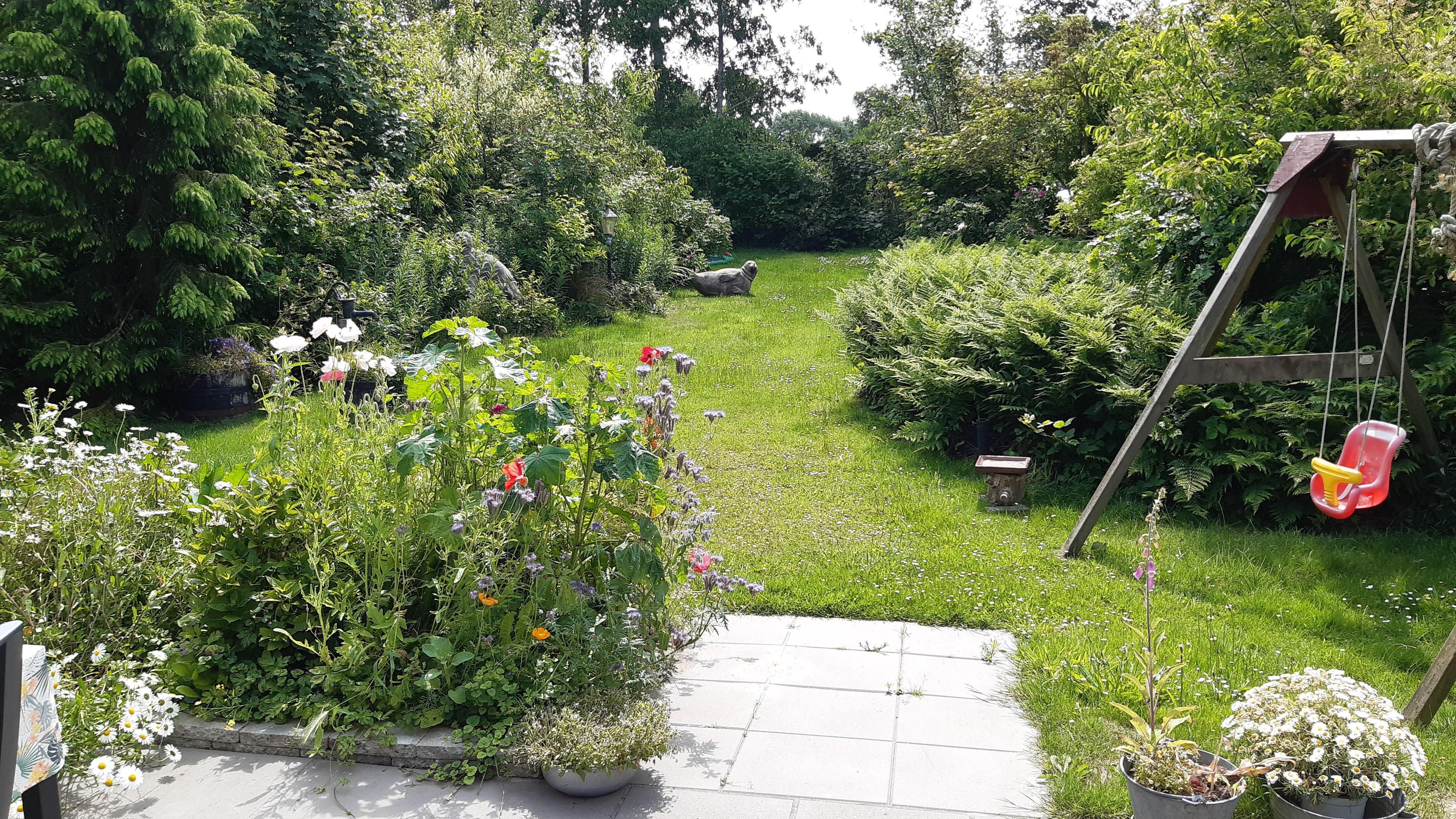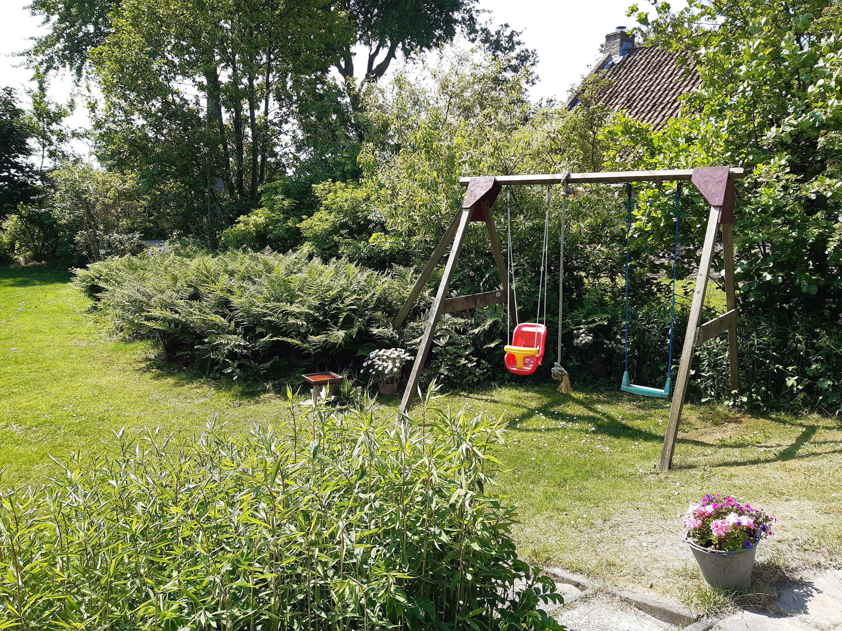 Tuin ‘Merel’ heeft een ruime, op het zuiden georiënteerde tuin met een aangelegd terras en diverse speeltoestellen voor kinderen.