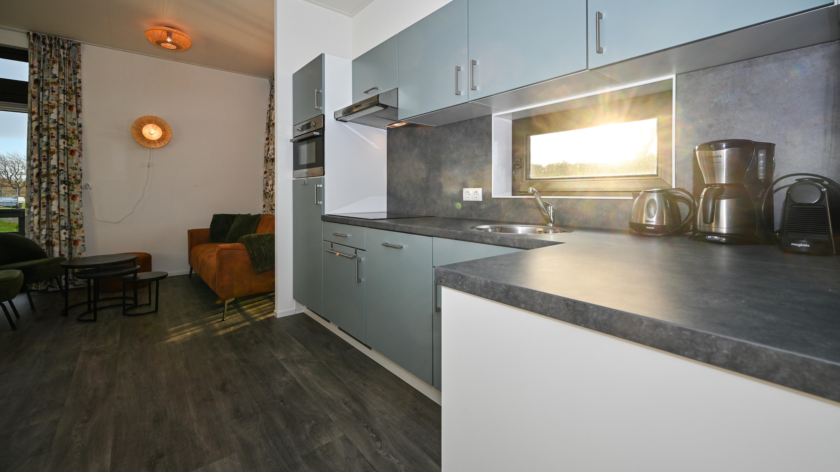 Chalet 'Zuiderduin' beschikt over een lichte woonkamer met een eigentijds interieur en grote raampartijen. Openslaande deuren verbinden de leefruimte direct met het overhangende terras en het aansluitende royale, aangelegde terras op het zuiden. De open keuken is strak uitgevoerd en voorzien van moderne inbouwapparatuur. Vanuit de hal zijn twee slaapkamers bereikbaar. De badkamer is verzorgd en uitgerust met een douche en wastafel, tegenover een separaat toilet. Het zonnige terras op het zuidoosten en zuiden vormt een prettig verlengstuk van de woning en biedt de hele dag zon en volop privacy. Op het perceel bevindt zich daarnaast een vrijstaande berging voor fietsen en opslag, uitgevoerd in een stijl die goed aansluit bij het chalet.