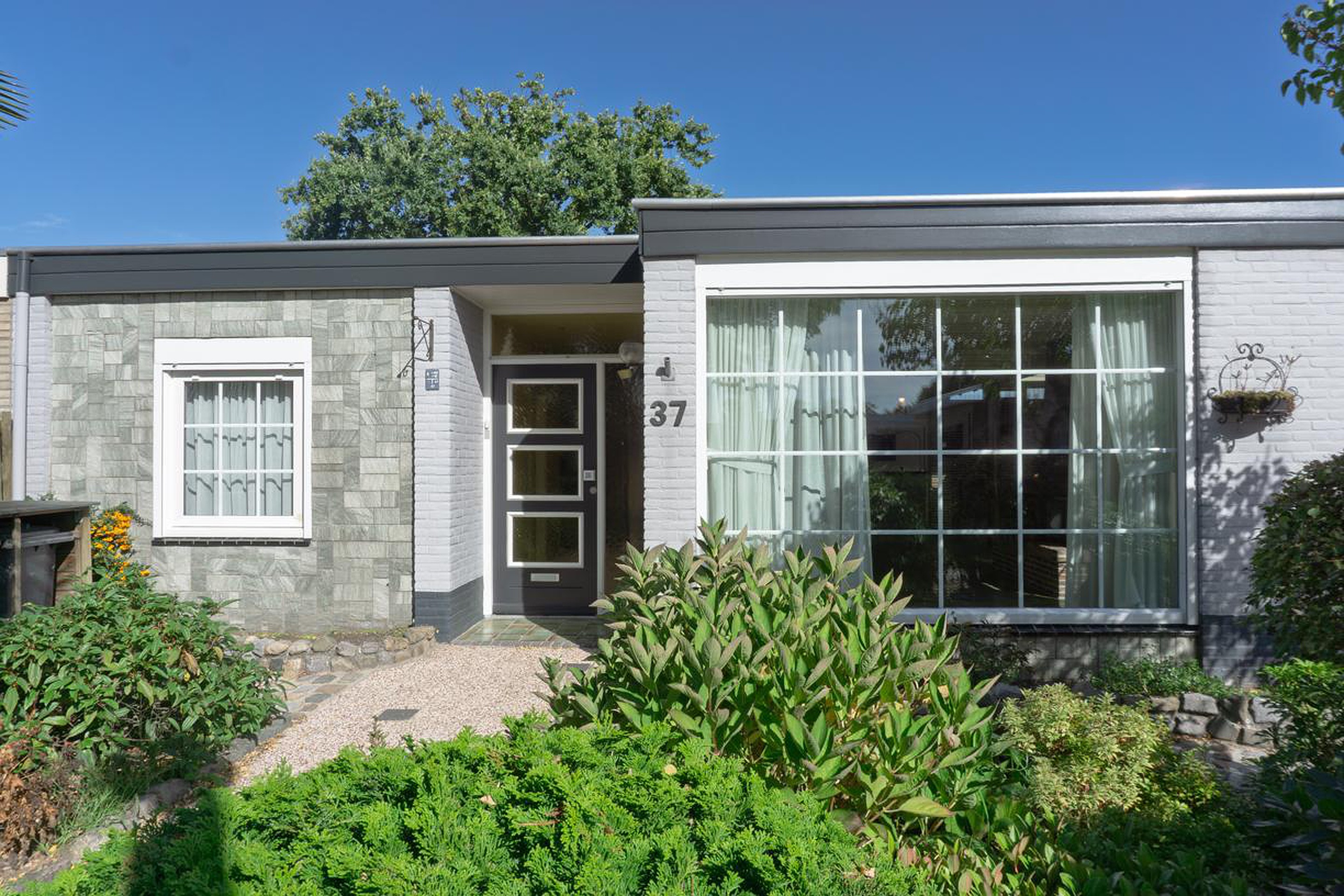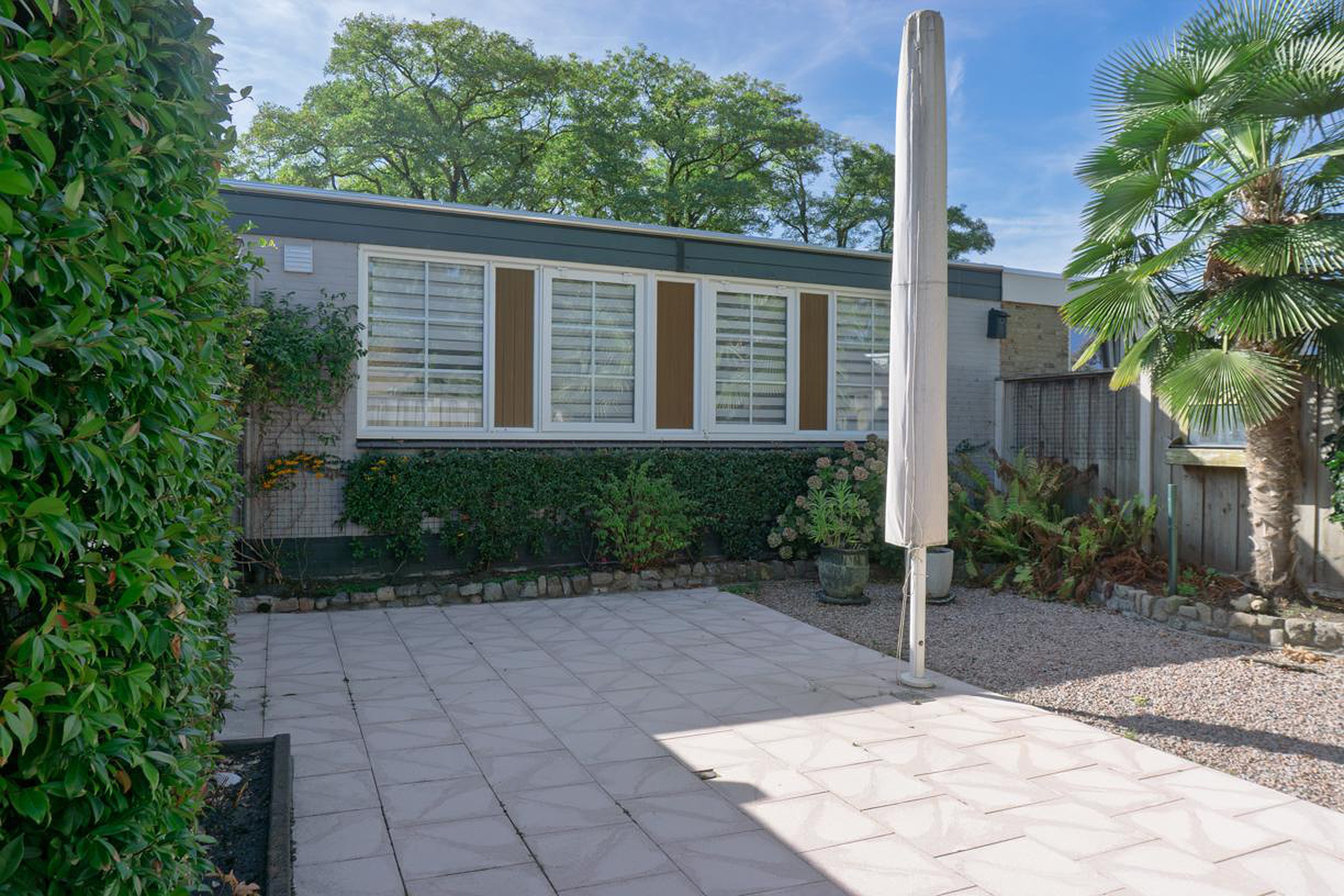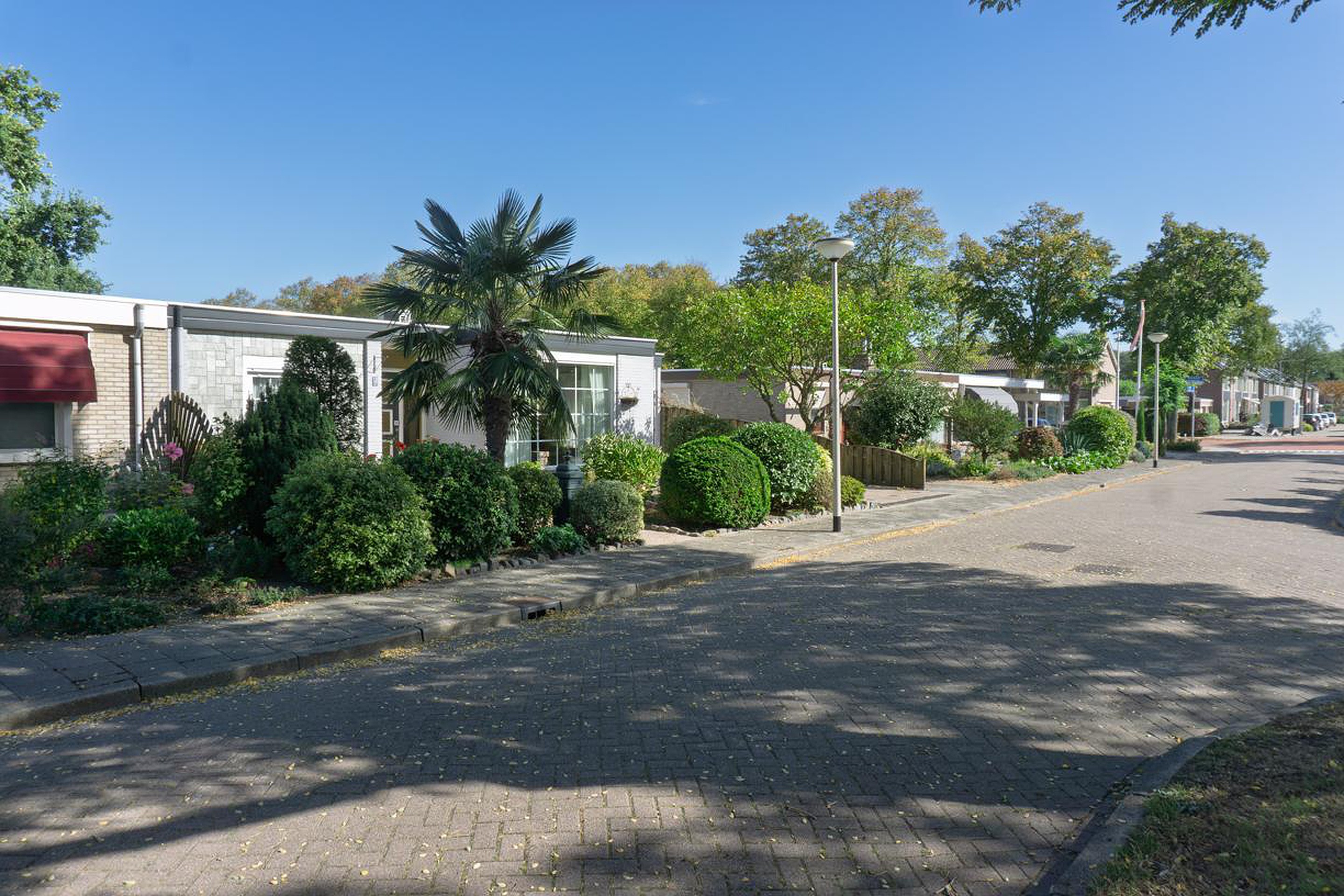 De voortuin is fraai aangelegd met planten en heesters en netjes onderhouden. Ook hier als opvallend detail een palmboom. Aan de zijkant van de woning ligt de oprit die plaats biedt aan 1 auto.