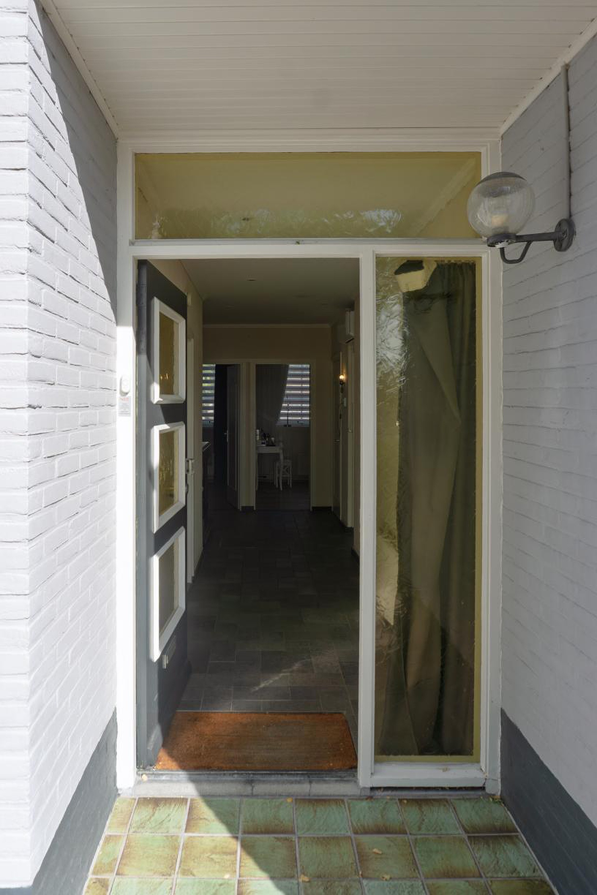 De woning wordt betreden in de hal die toegang geeft aan de woonkamer en 3 slaapkamers en de badkamer. De hal is afgewerkt met een tegelvloer, granol op de wanden en een spanplafond. In de hal is een airco aanwezig die tevens de slaapkamers kan koelen.