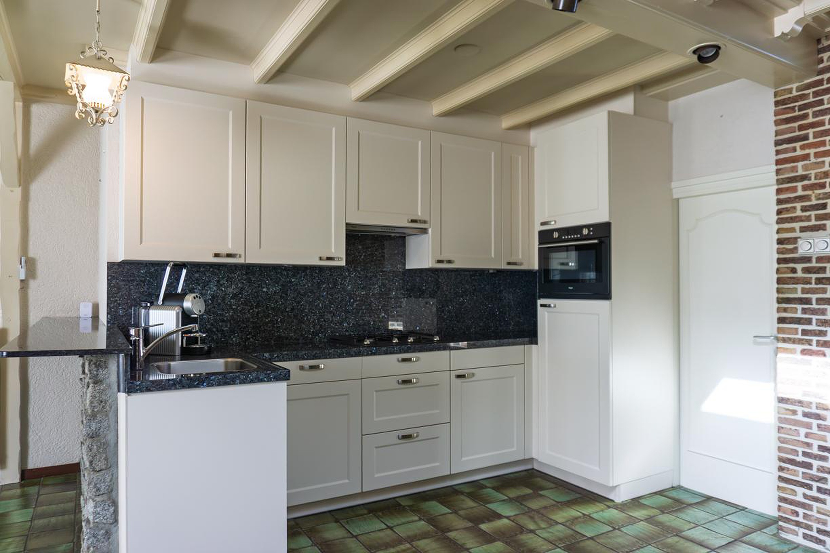 De keuken is aan de achterzijde van de woning gesitueerd, staat in open verbinding met de woonkamer en geeft toegang tot de achter de woning gelegen multifunctionele ruimte. De in U-vorm opgestelde keuken beschikt over een natuurstenen werkblad met spoelbak, mengkraan en onder- en bovenkasten. Ingebouwd zijn een 4-pits gaskookplaat met afzuigkap, een vaatwasser, een koelkast en een combi-oven/grill/magnetron. De achterwand tussen bovenkasten en werkblad is eveneens afgewerkt met natuursteen. De afwerking van de keuken is verder gelijk aan de afwerking van de woonkamer.