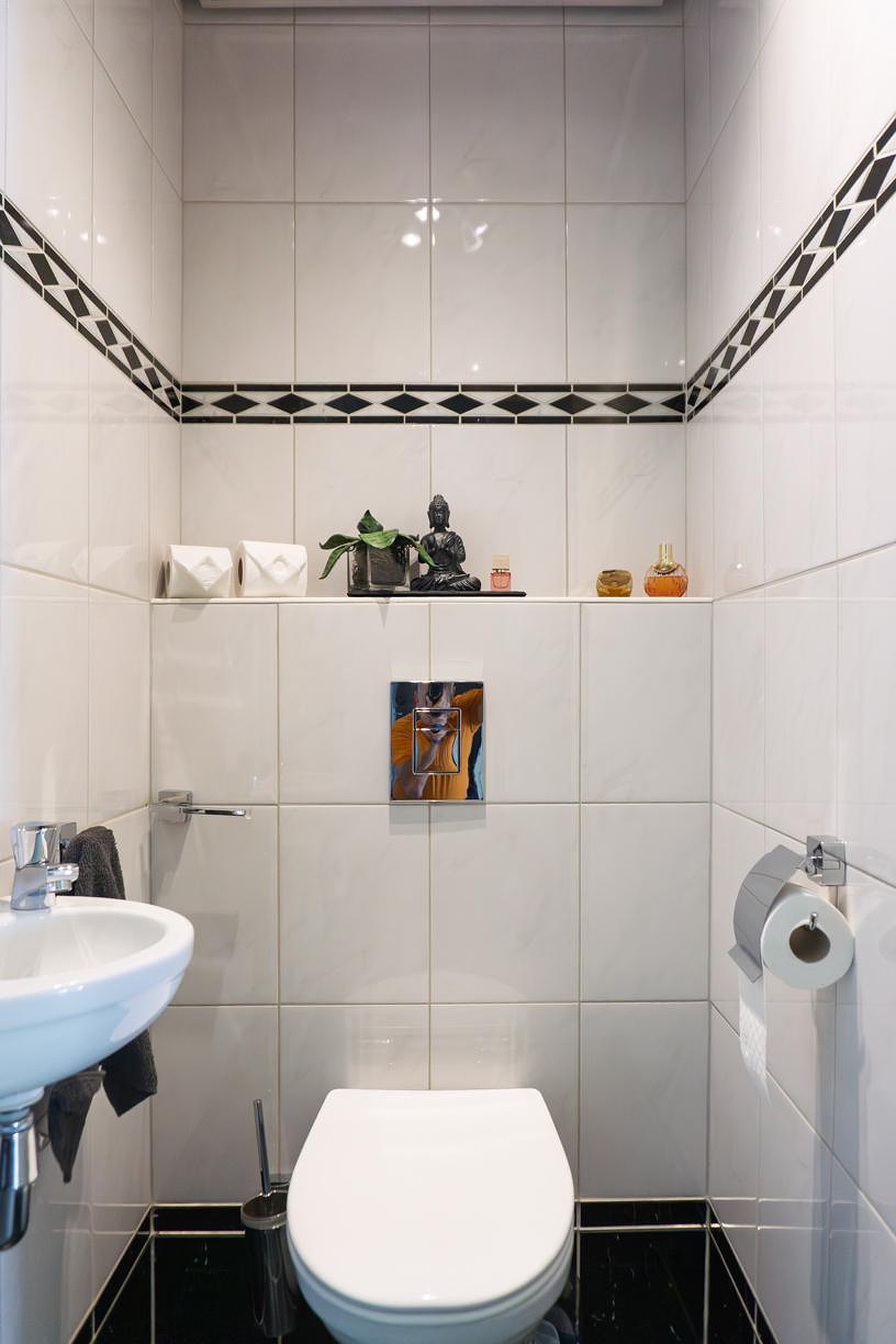 In de hal bevindt zich ook het toilet. Dit betreft een hangcloset met fontein. De wanden en de vloer van het toilet zijn betegeld.