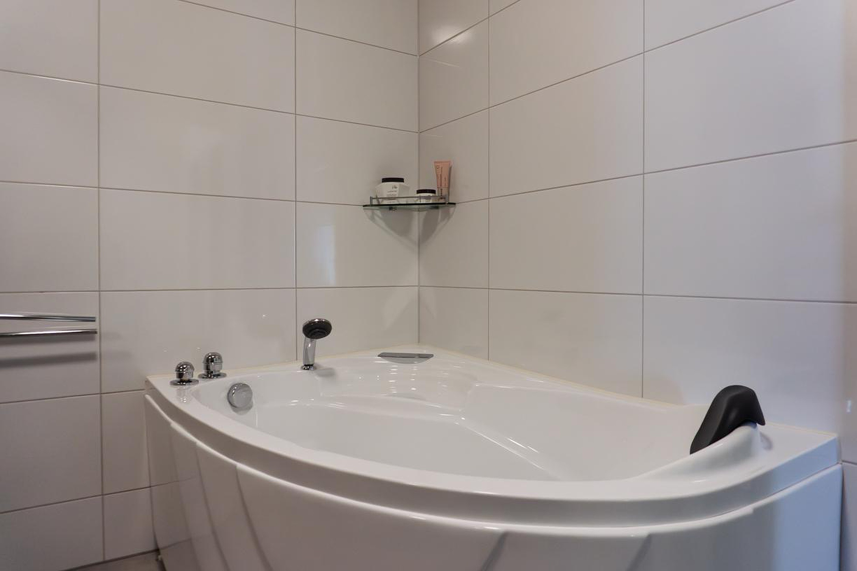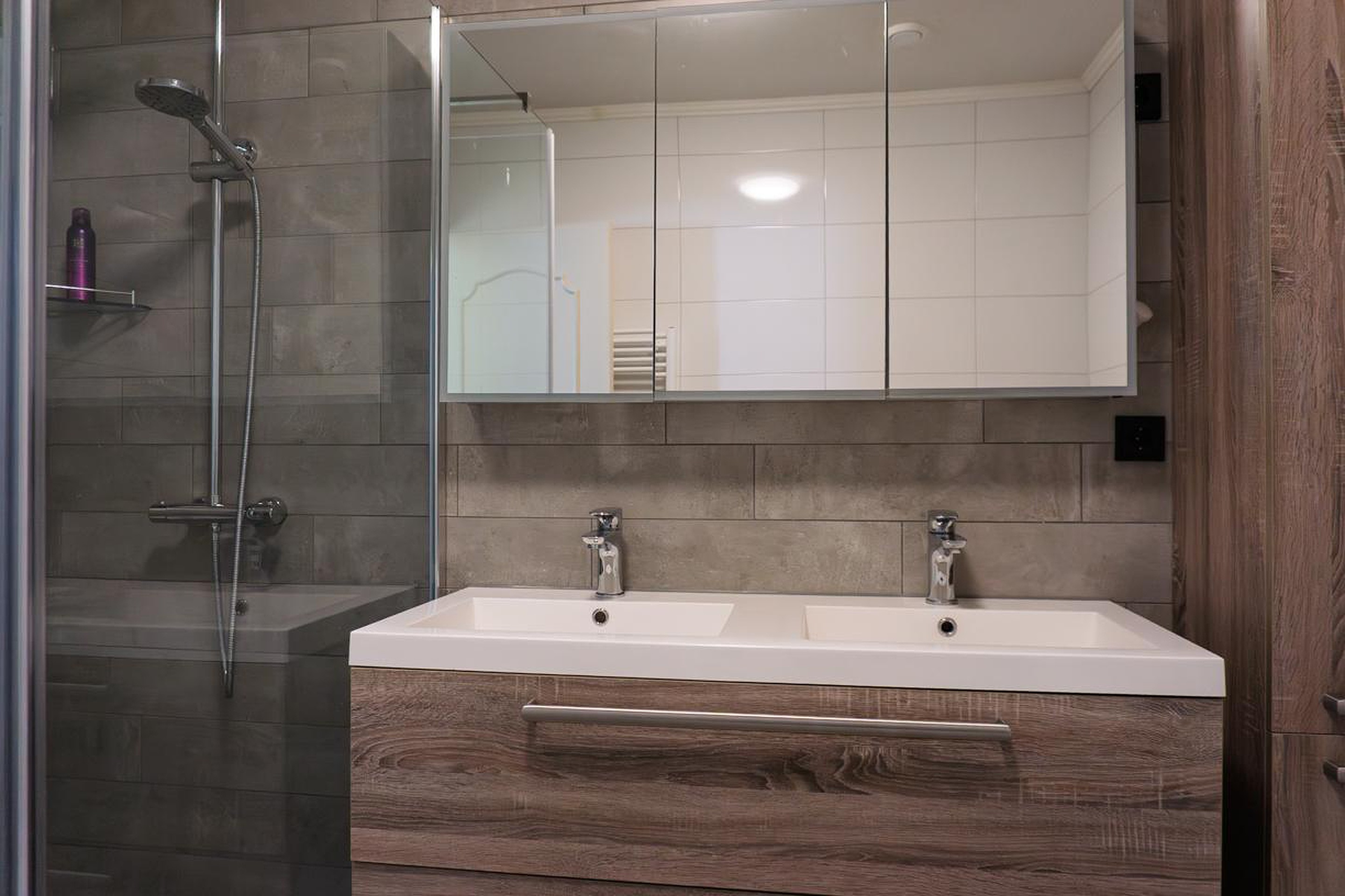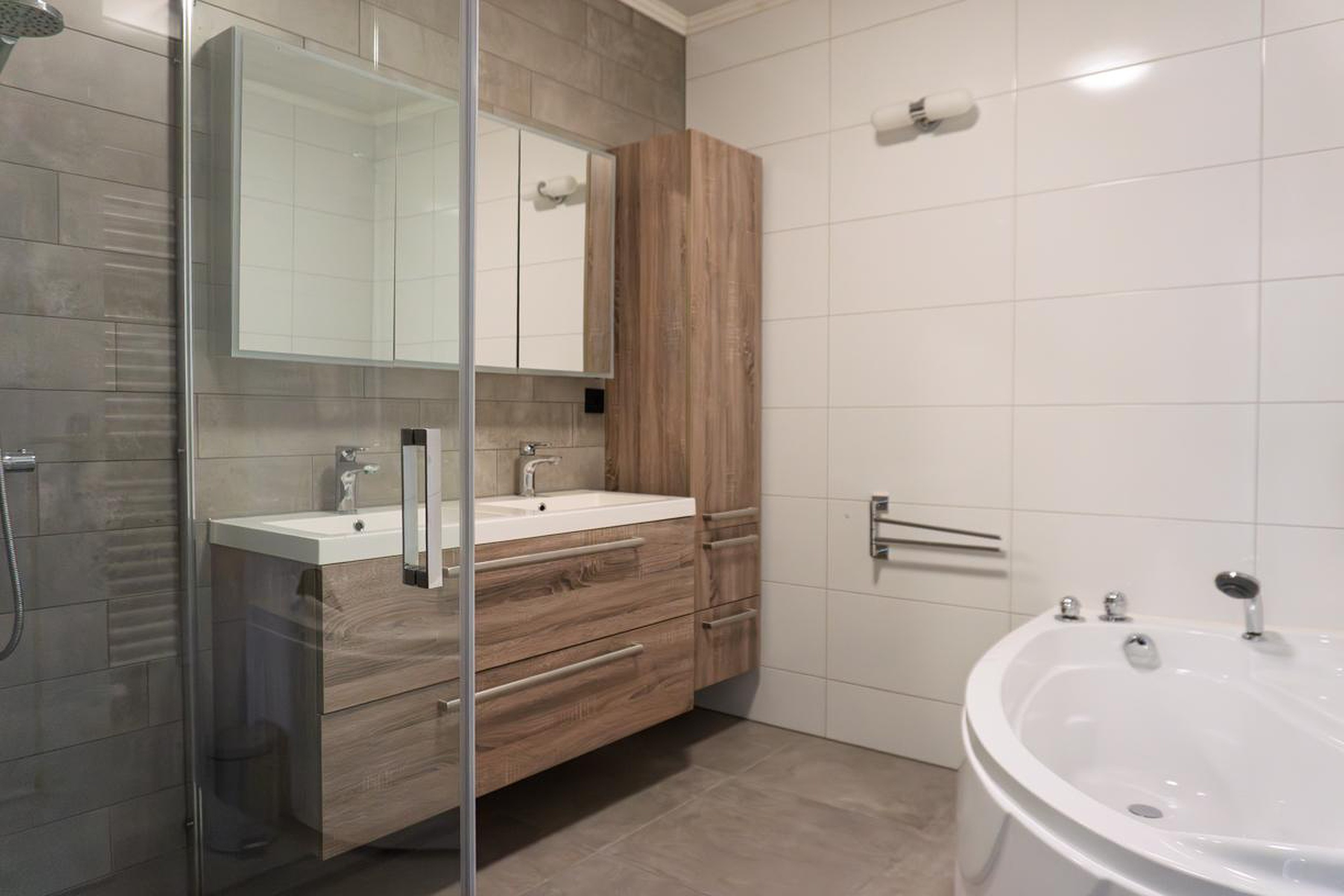 De gemoderniseerde badkamer is gesitueerd tussen slaapkamer 1 en 2 en beschikt over een ligbad, inloopdouche en een dubbele wastafel ingebouwd in een fraai badmeubel. De wanden en de vloer van de badkamer zijn in neutrale kleuren betegeld. Het plafond betreft een spanplafond.