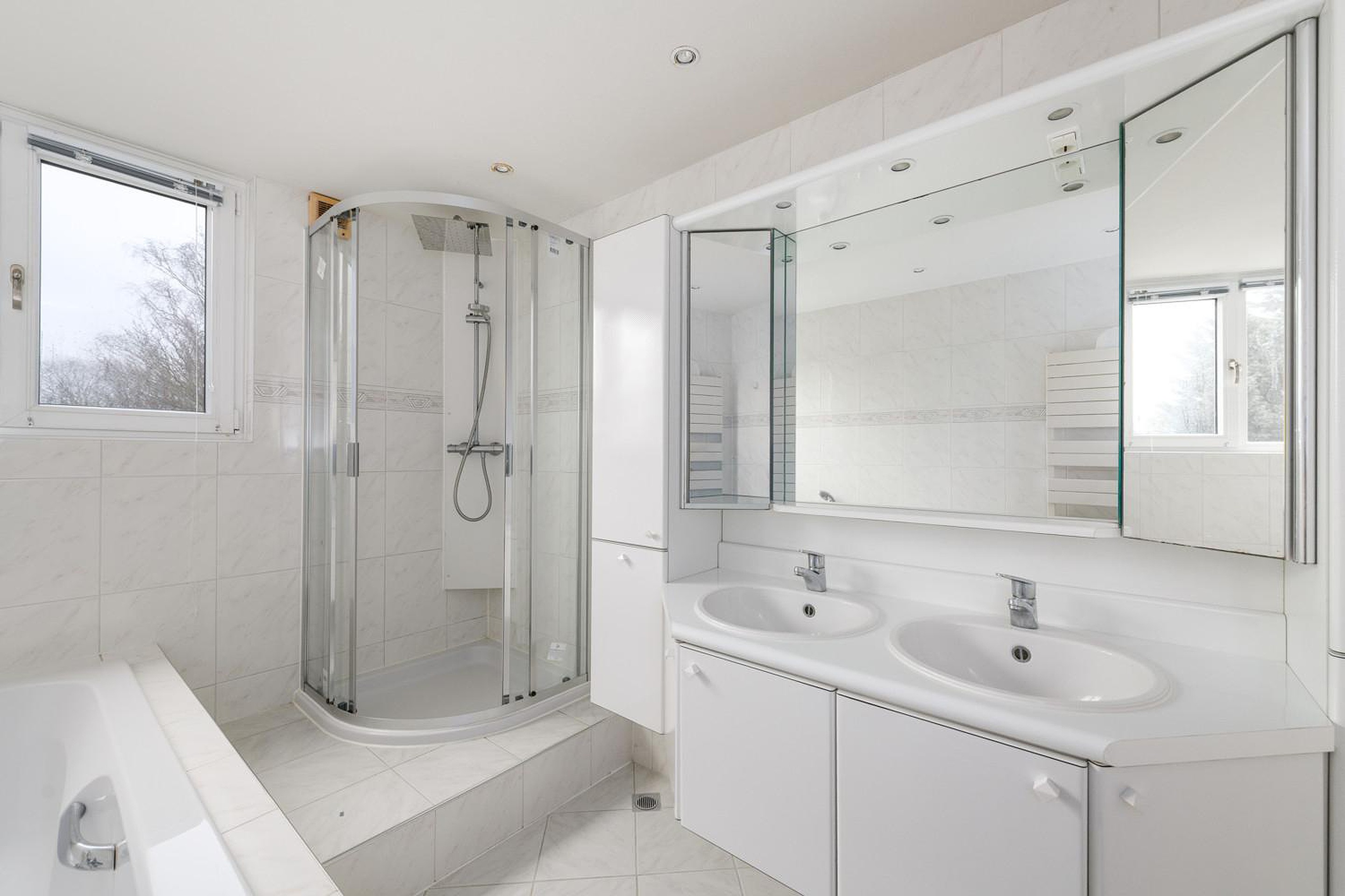 De overloop met grote vide geeft een prachtig ruimtelijk gevoel. Op de eerste verdieping bevinden zich maar liefst 4 slaapkamers met een oppervlakte van respectievelijk 14,0 m2, 12,9 m2, 11,4 m2 en 12,4 m2. Alle slaapkamers beschikken over vaste kasten en drie van de vier kamers hebben een airco. De slaapkamers aan de zuidzijde zijn voorzien van kunststof kozijnen. Er is een separate ruimte voor het toilet en de complete badkamer met dakkapel (kunststof) beschikt over een ligbad, inloopdouche en een dubbele wastafel met meubel. In de technisch ruimte staat de opstelling van de HR CV ketel, merk ATAG met bouwjaar 2016. Via een vlizo trap is er toegang tot de bergzolder.