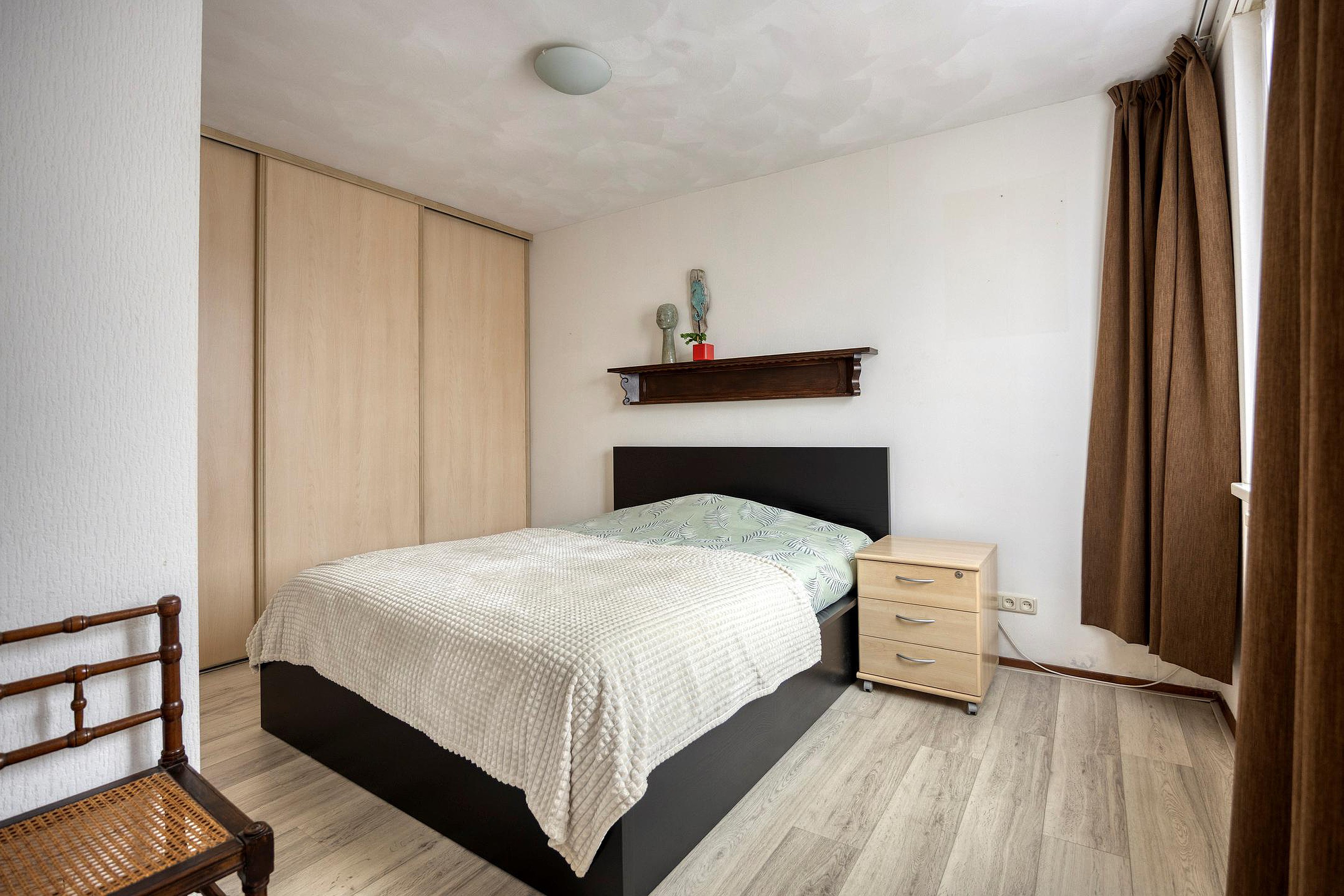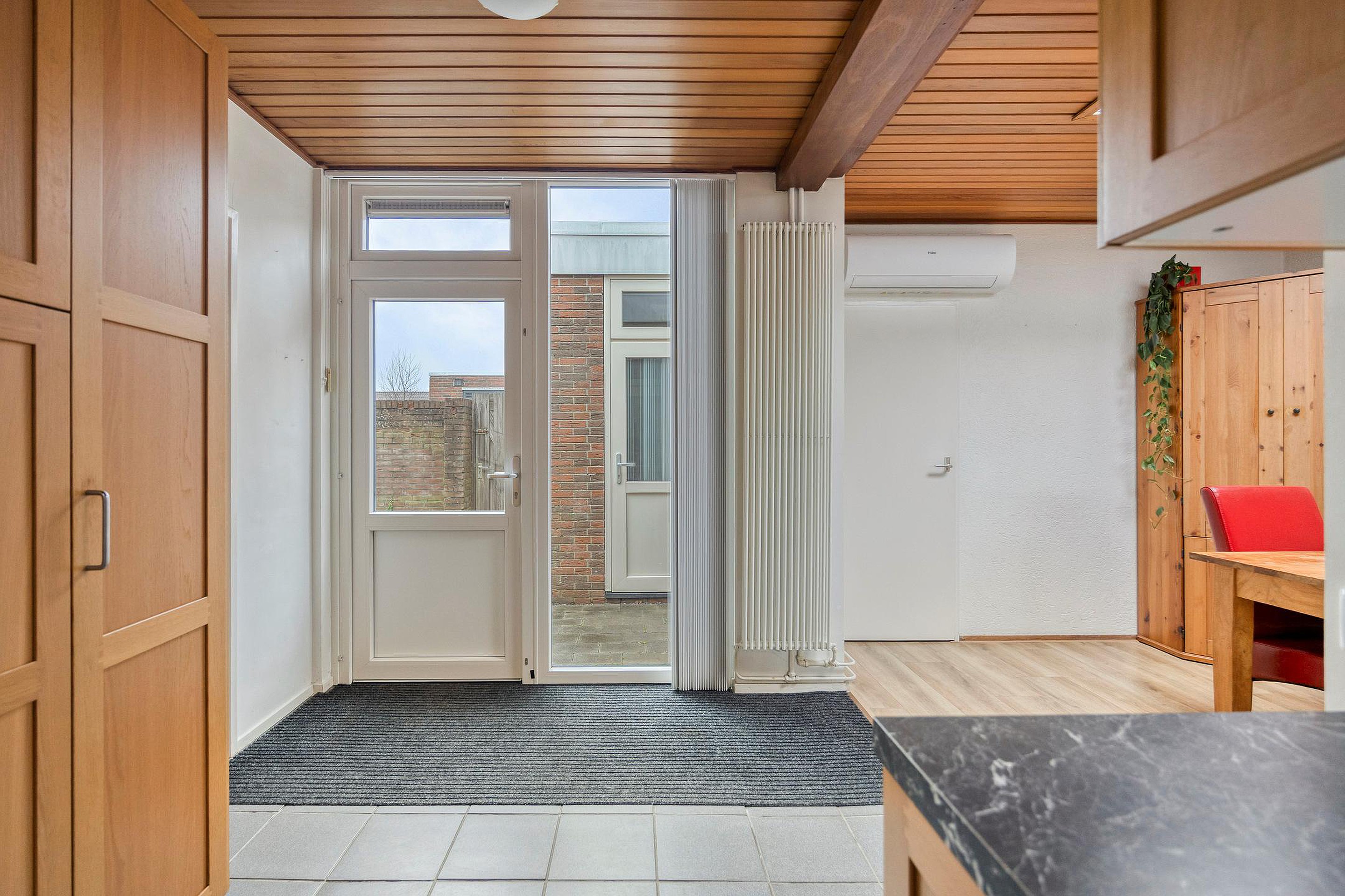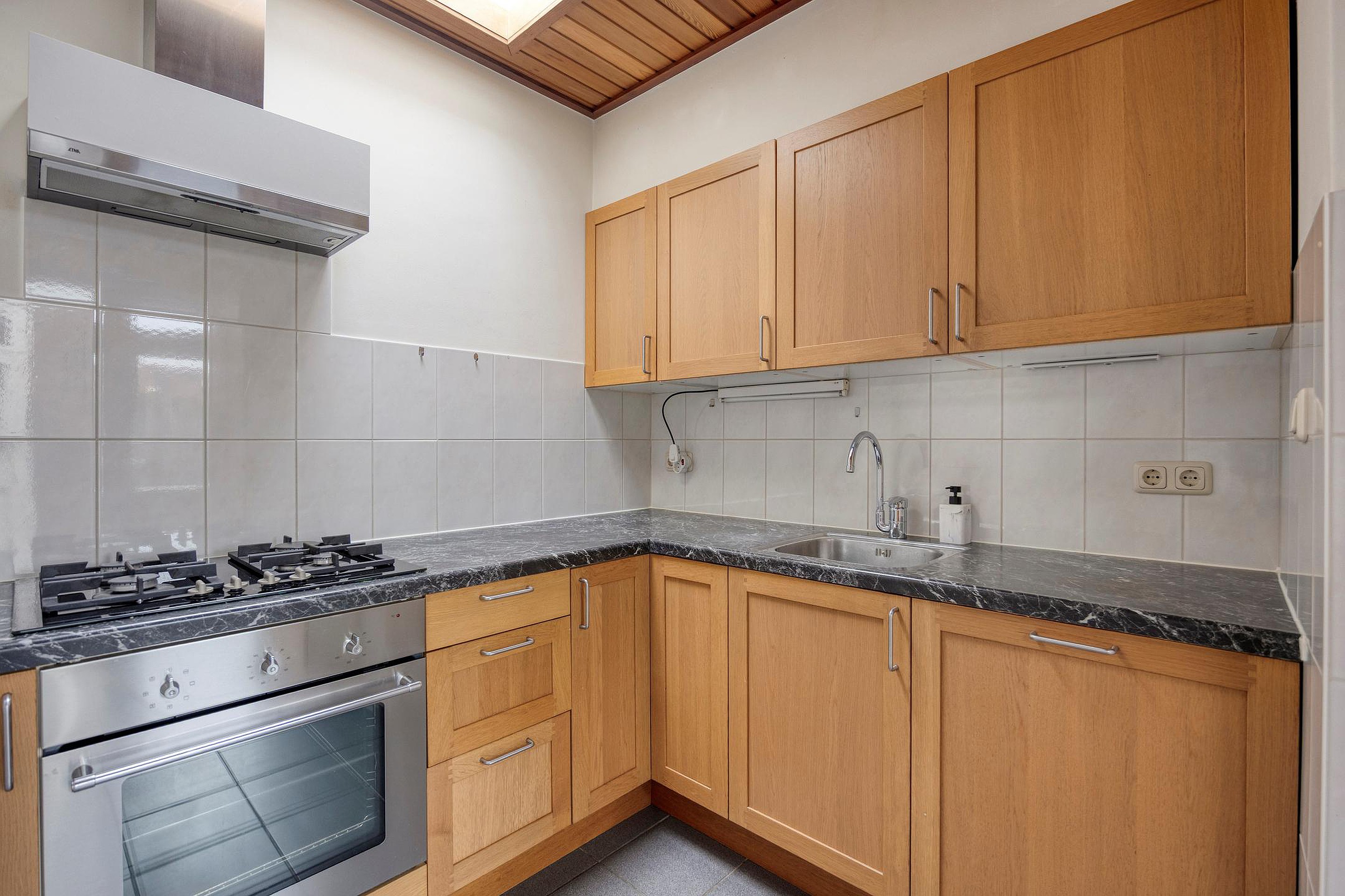 De praktische bijkeuken beschikt over extra bergruimte. Vanuit de hal bereik je de ruime woonkamer met openslaande deuren, die zorgen voor een prettige lichtinval. De woonkamer is bovendien uitgerust met airconditioning. De half-open keuken sluit mooi aan op de leefruimte en is voorzien van diverse inbouwapparatuur, te weten: een vaatwasser, 4-pits gaskookplaat, afzuigkap en oven.