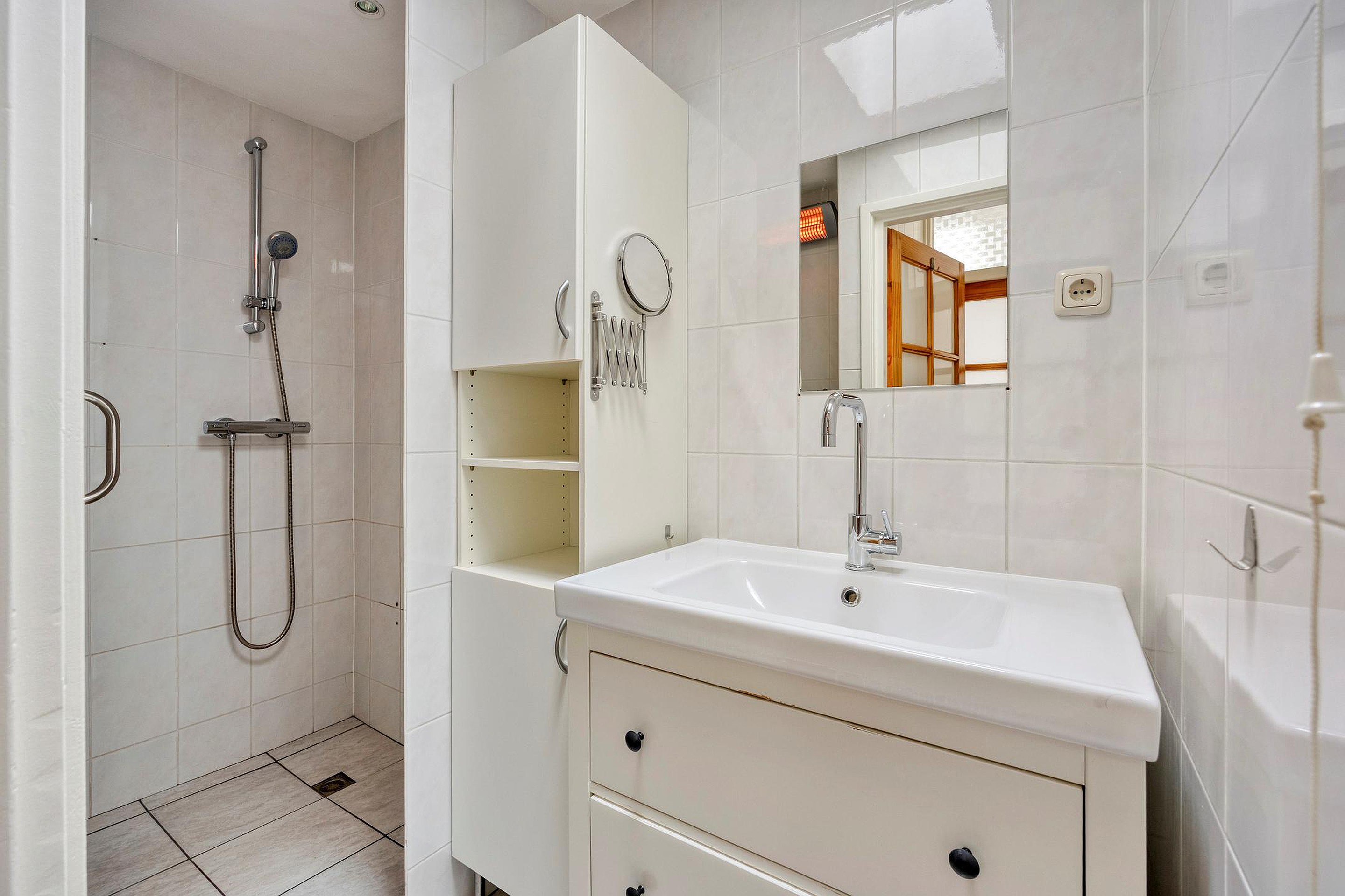 Begane grond Aan de buitenzijde bevindt zich de meterkast (10 groepen en 3 aardlekschakelaars). Via de entree betreed je de hal met toegang tot een separaat toilet en een bergruimte met CV-ketelopstelling. Tevens bevinden zich hier een kleine slaapkamer en de badkamer, welke is voorzien van een douchehoek en een wastafelmeubel.