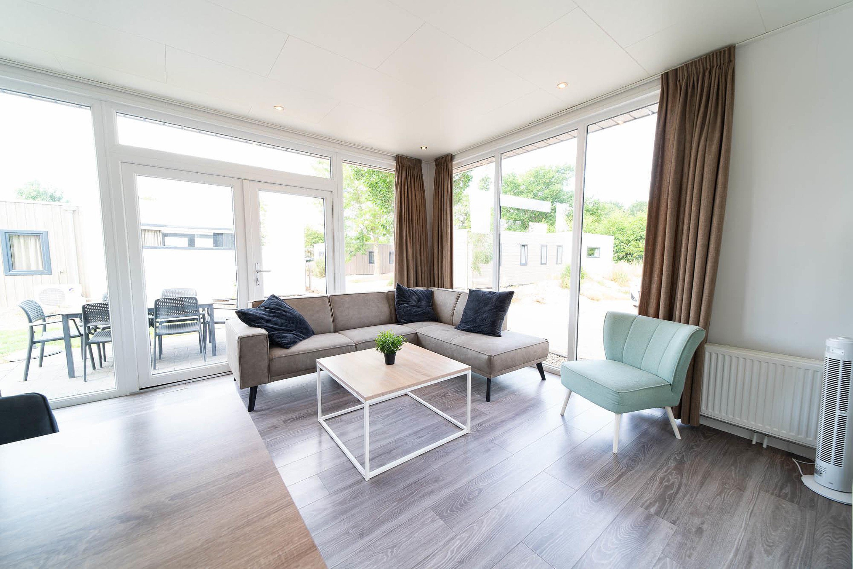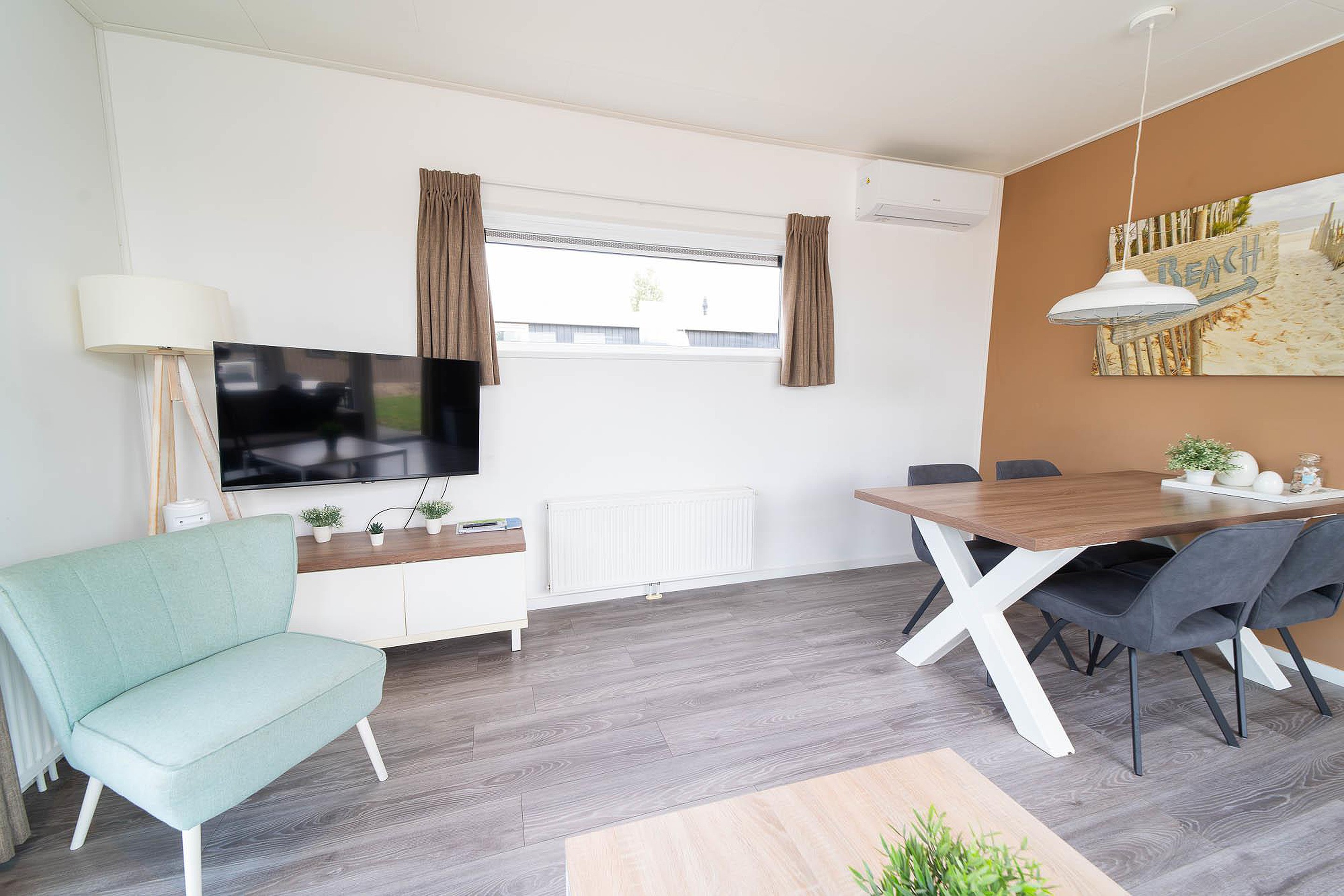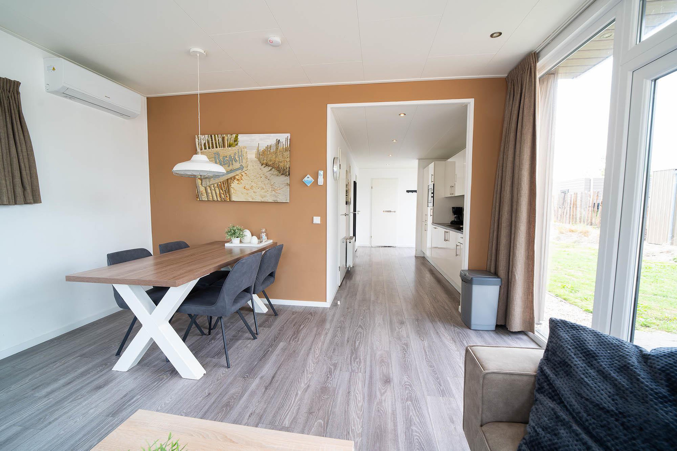Gelegen op een mooie plek op het Europarcs Resort Poort van Zeeland, nabij de uitgang richting het strand, staat dit ruime en goed onderhouden zespersoons chalet. Nummer 273 is een buitenkans voor wie op zoek is naar een comfortabele recreatiewoning, of het nu voor eigen gebruik, verhuur, of een mix van beide is. Het chalet onderscheidt zich direct door de lichte en open sfeer, mede dankzij het hoge plafond en de hoge ramen in de woonkamer, die een gevoel van ruimte en vrijheid geven. De deuren naar het terras op het zuiden laten de zon rijkelijk naar binnen en zorgen voor een naadloze overgang van binnen naar buiten. De airconditioning zorgt voor extra comfort, zelfs op de warmste dagen. Met 58 m2 woonoppervlakte en een royaal perceel van 195 m2 op huurgrond, is dit chalet groter dan de meeste vergelijkbare woningen op het park en biedt het een oase van rust op een zeer gewilde locatie. Parkeren op eigen erf is een bijkomend gemak.