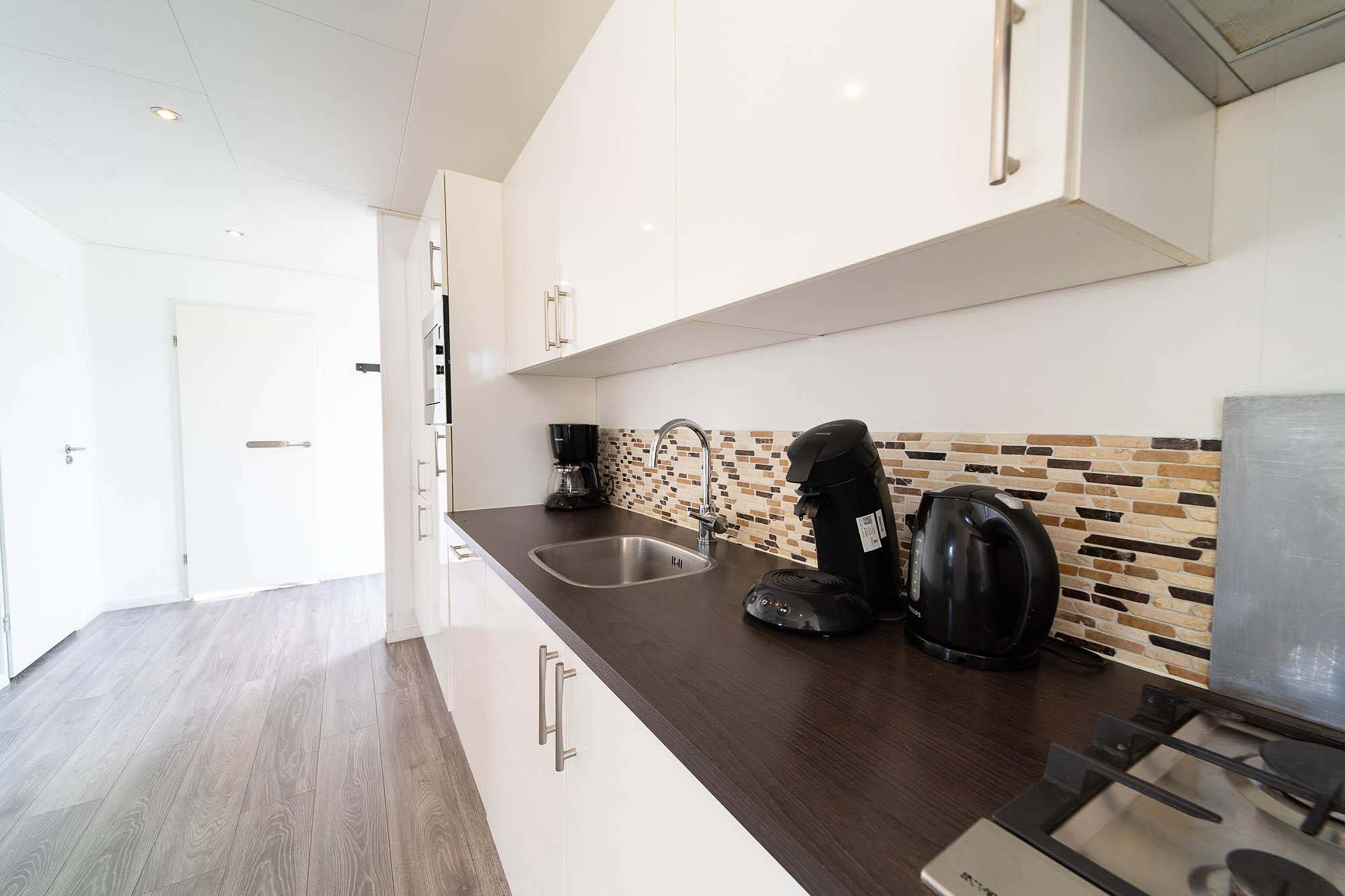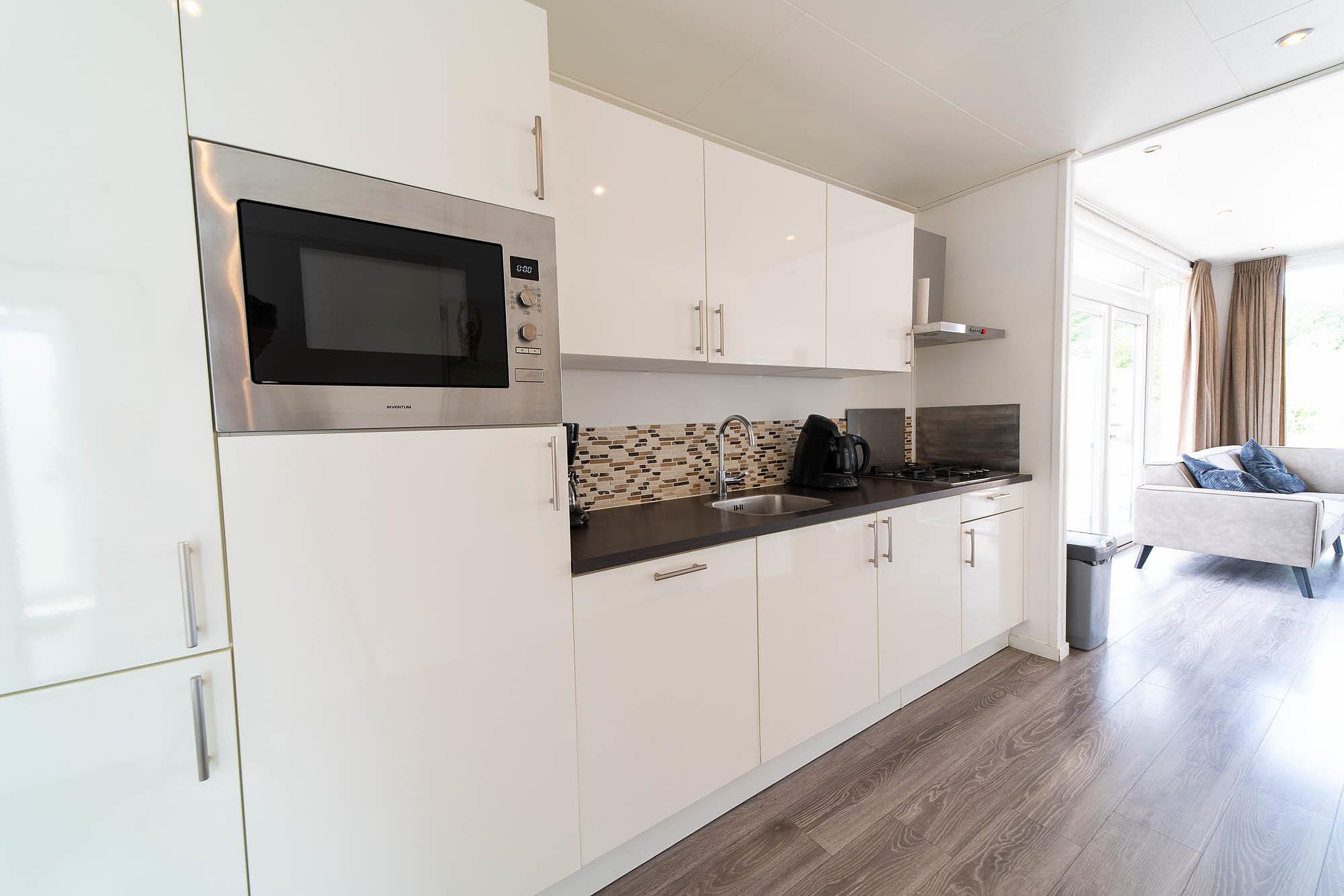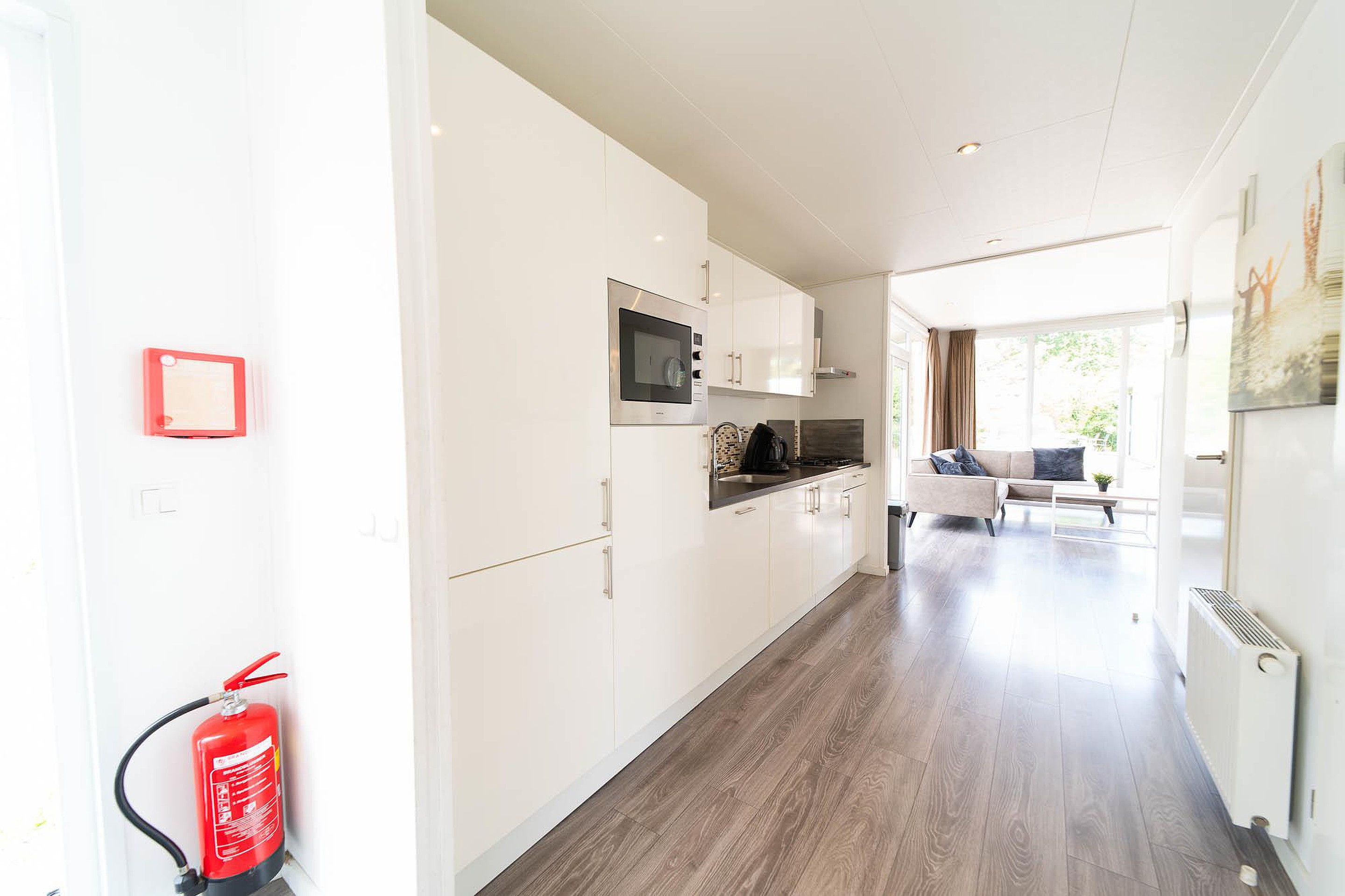 Begane grond Bij binnenkomst in dit chalet valt meteen de lichte en uitnodigende woonkamer op. De open indeling creëert een gevoel van ruimte, perfect voor gezellige momenten met familie en vrienden. De uitgebreide keuken is een genot voor de thuiskok, uitgerust met een vaatwasser, magnetron, gasfornuis, afzuigkap en een complete inventaris voor zes personen.