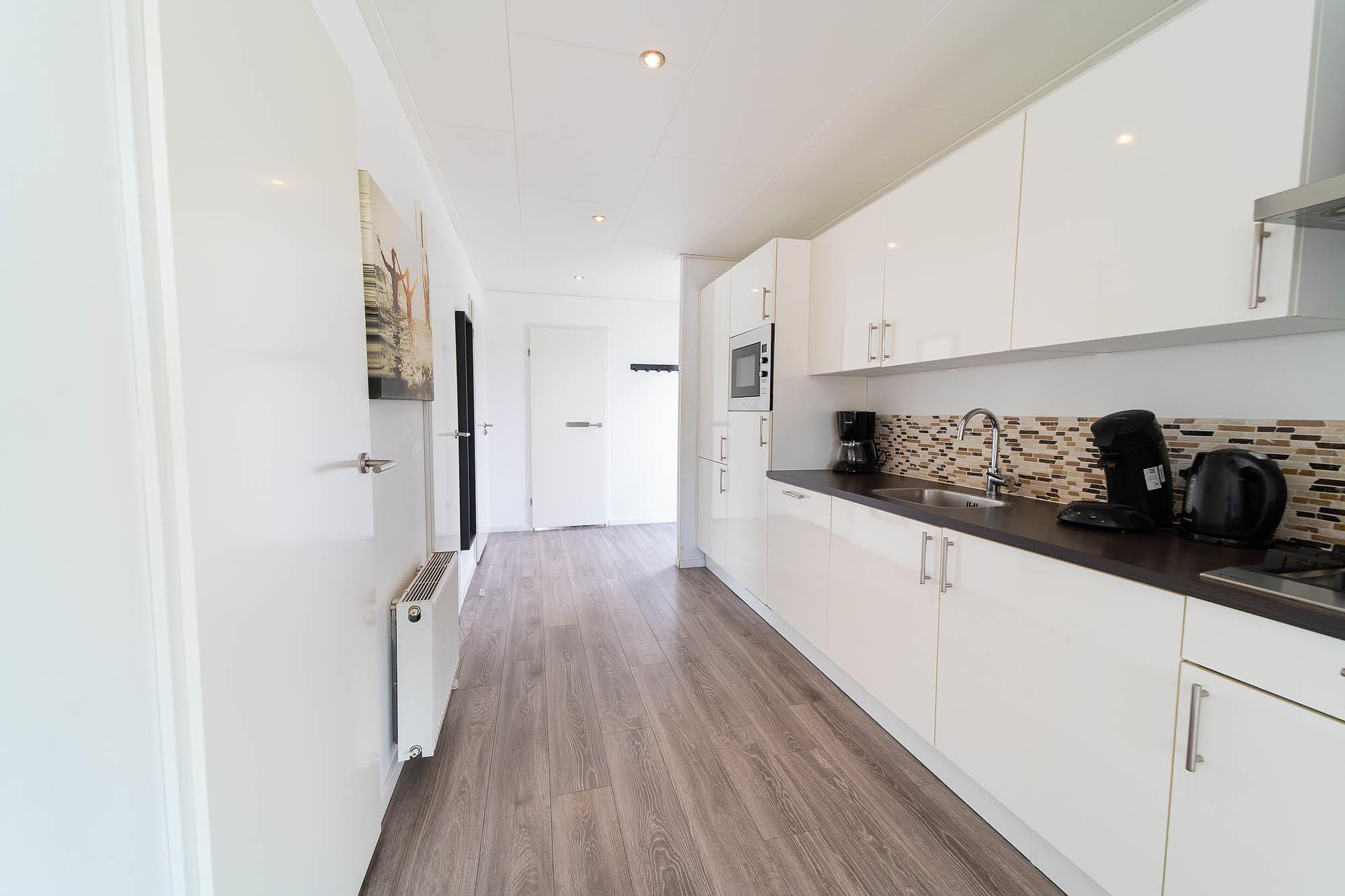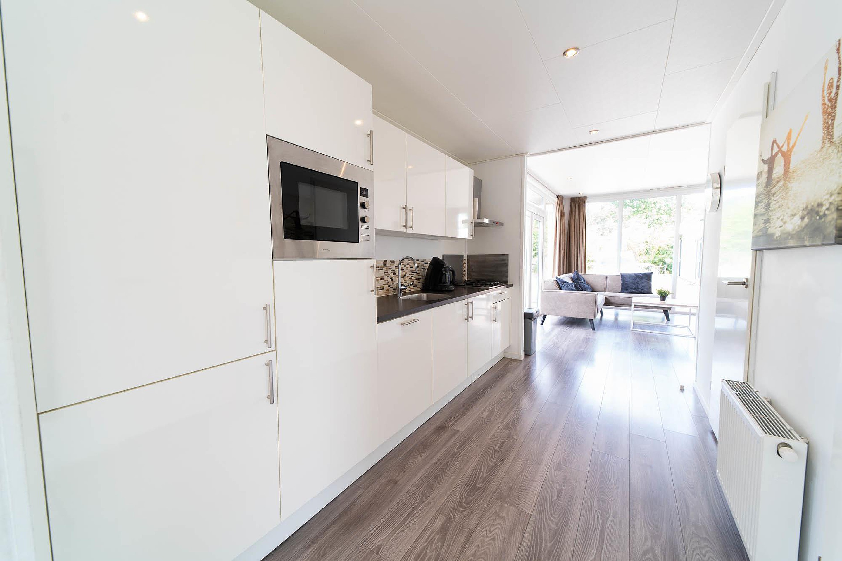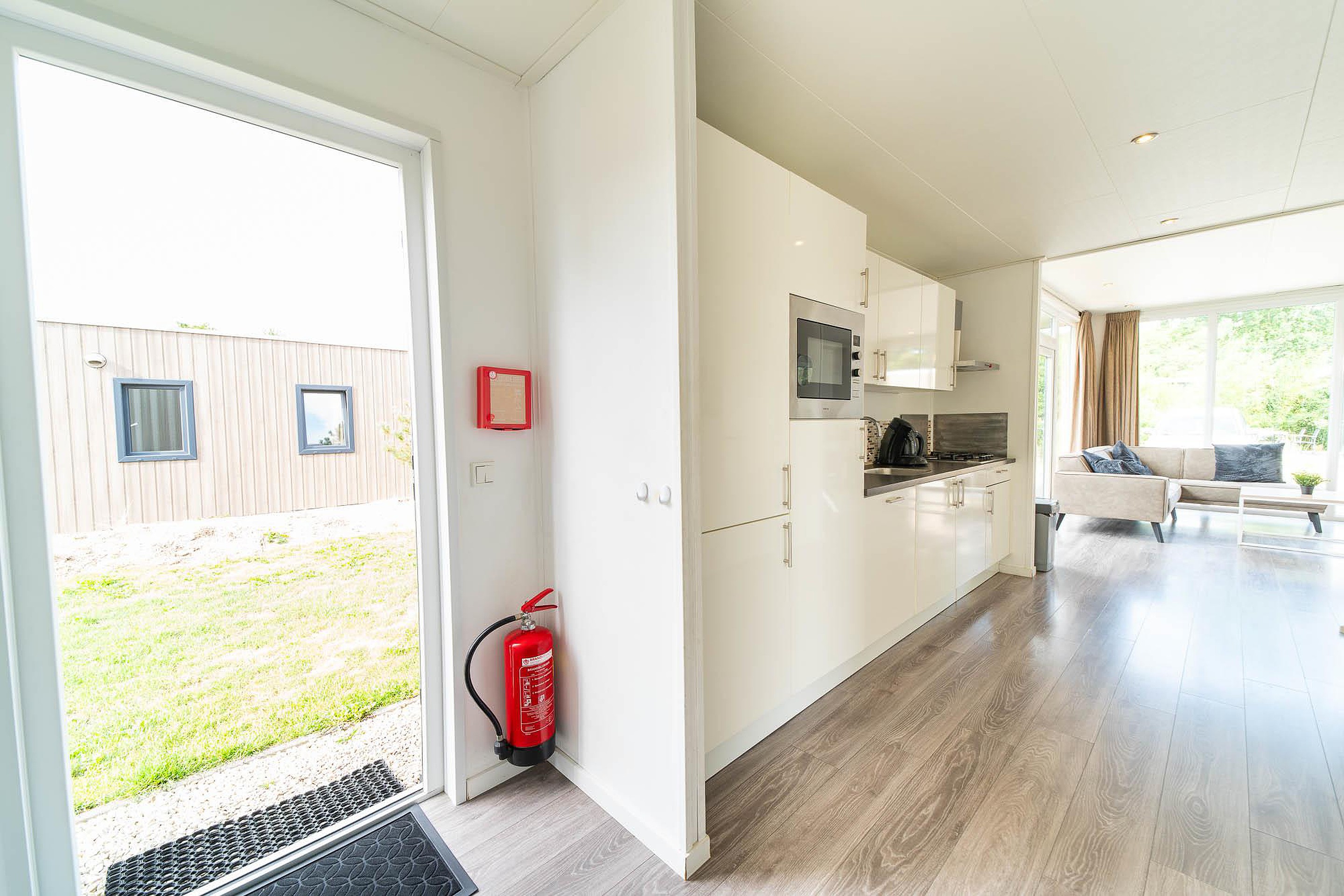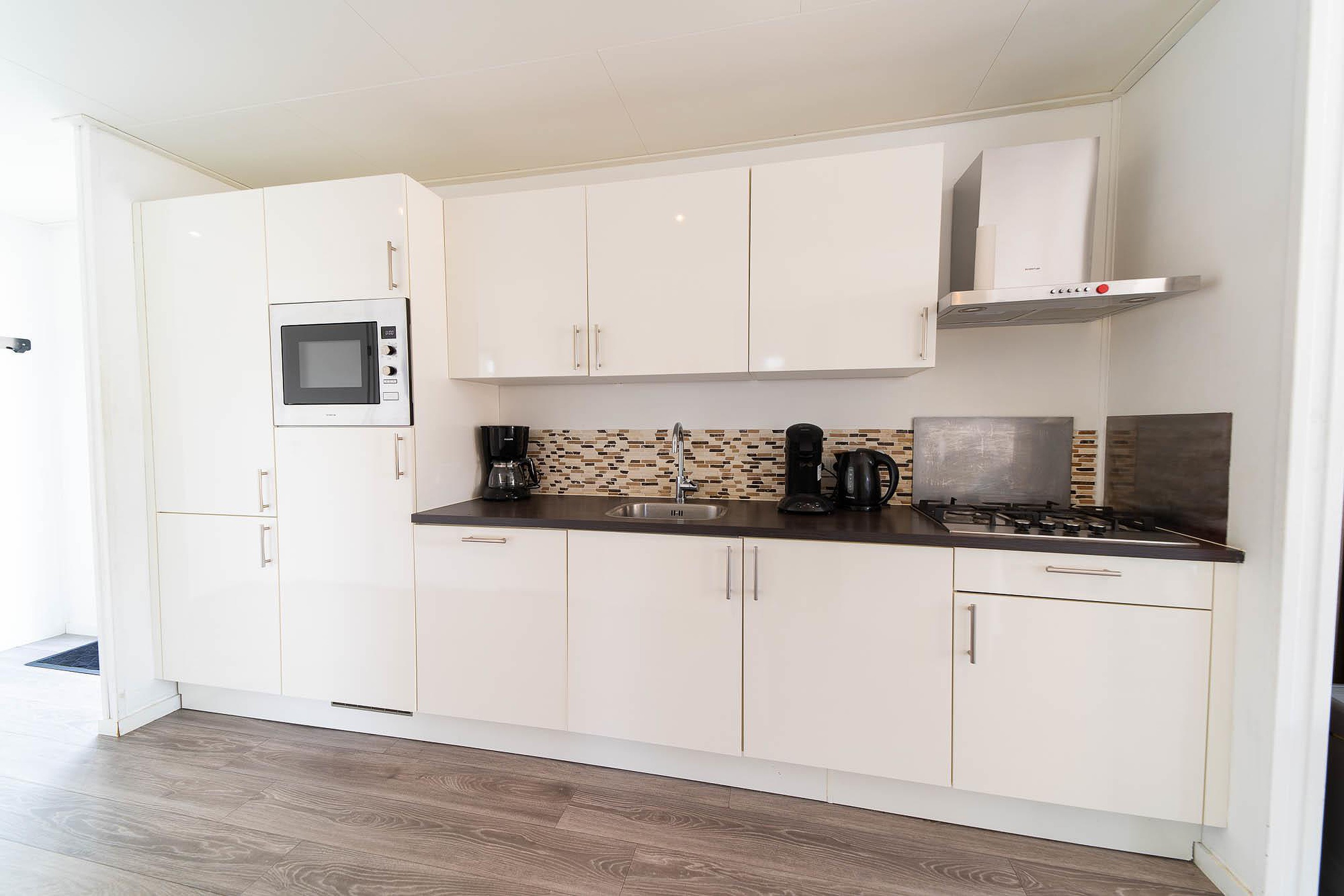 Begane grond Bij binnenkomst in dit chalet valt meteen de lichte en uitnodigende woonkamer op. De open indeling creëert een gevoel van ruimte, perfect voor gezellige momenten met familie en vrienden. De uitgebreide keuken is een genot voor de thuiskok, uitgerust met een vaatwasser, magnetron, gasfornuis, afzuigkap en een complete inventaris voor zes personen.