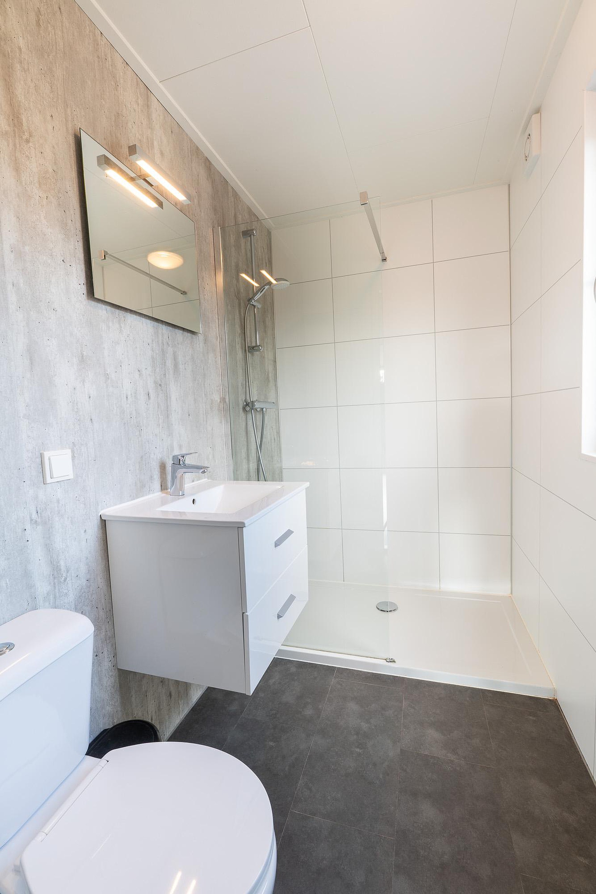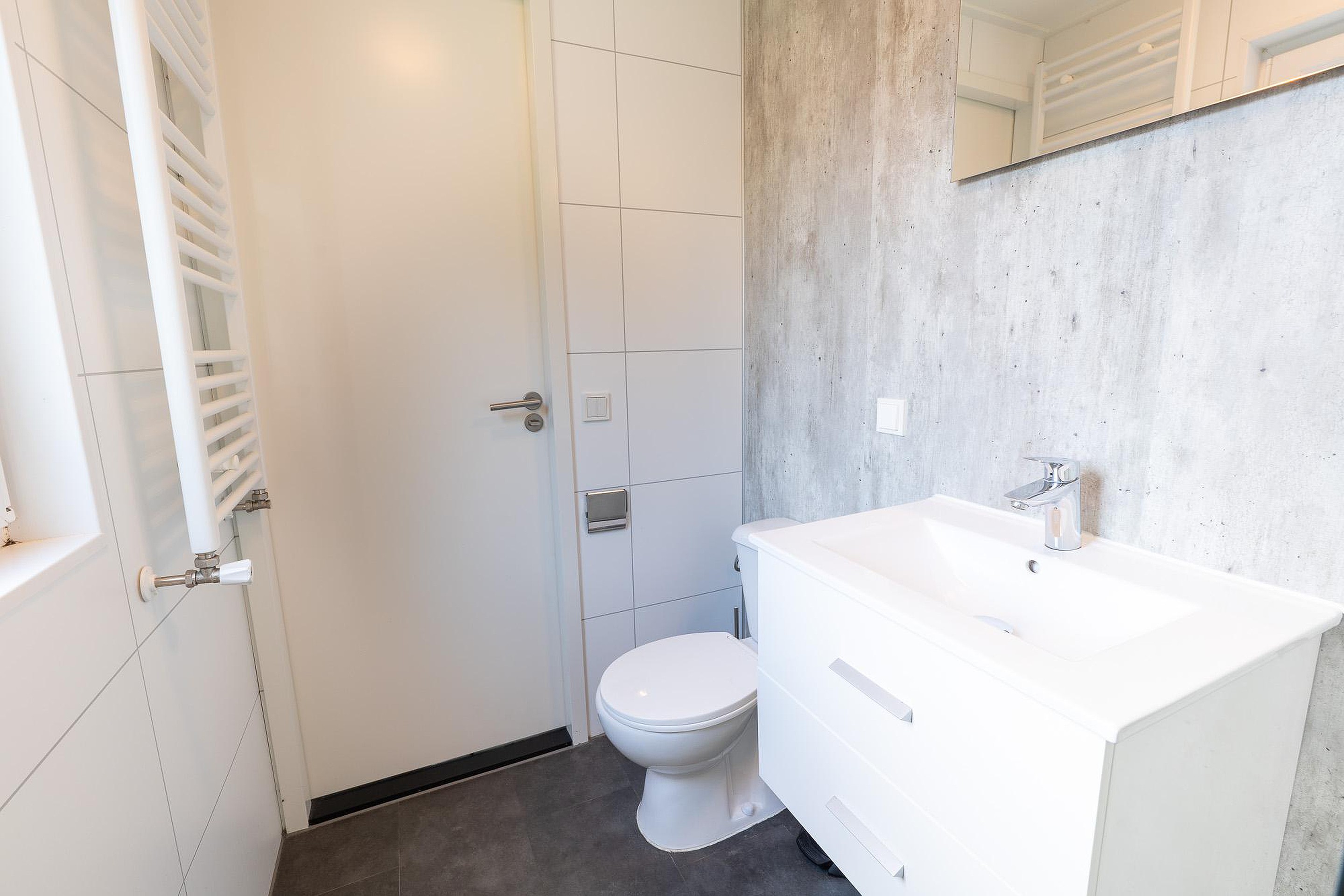 De badkamer is modern ingericht en goed onderhouden. De badkamer is uitgerust met een douche, een toilet en een wastafelmeubel, en vormt uw eigen complete badkamer.