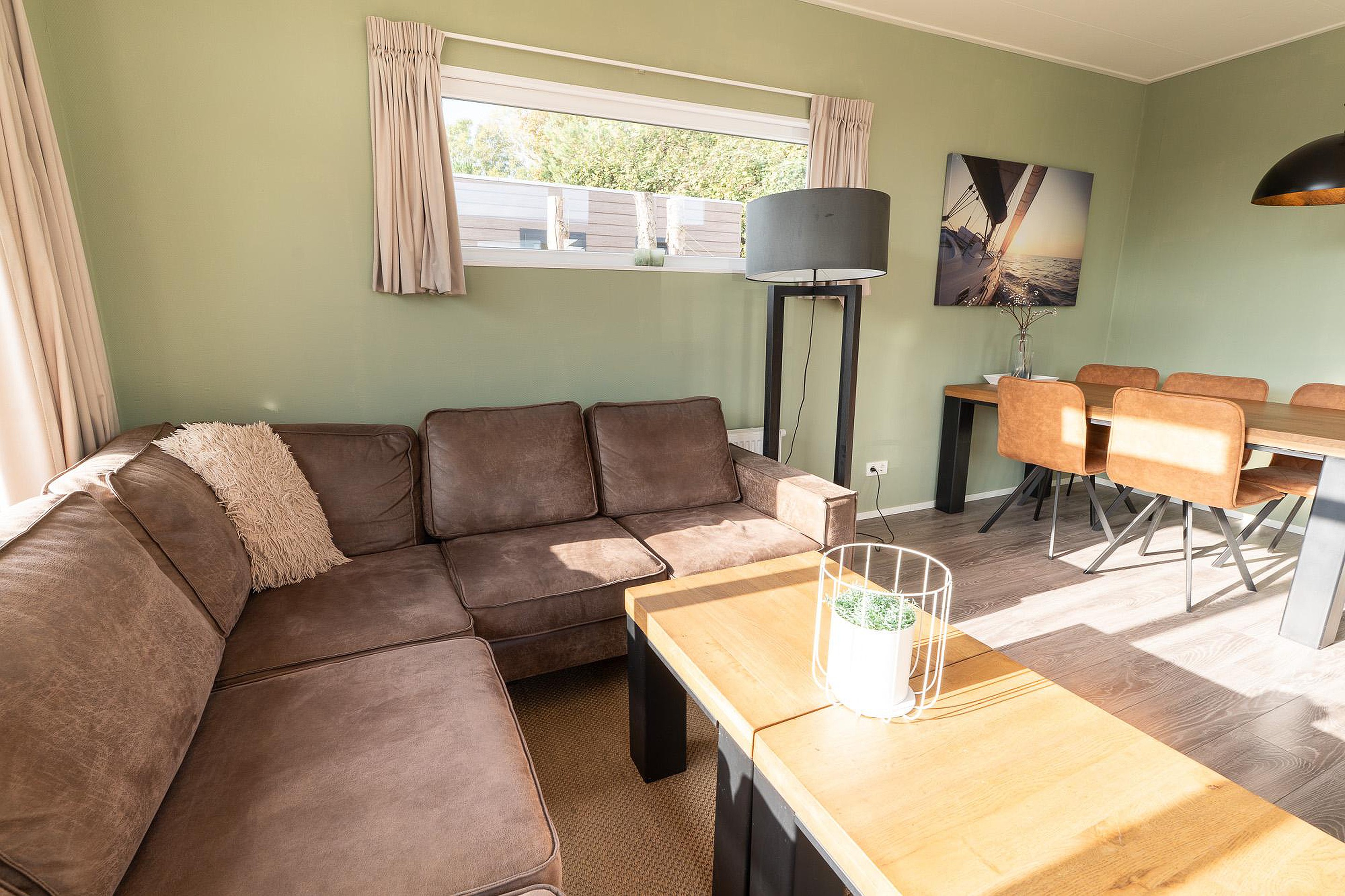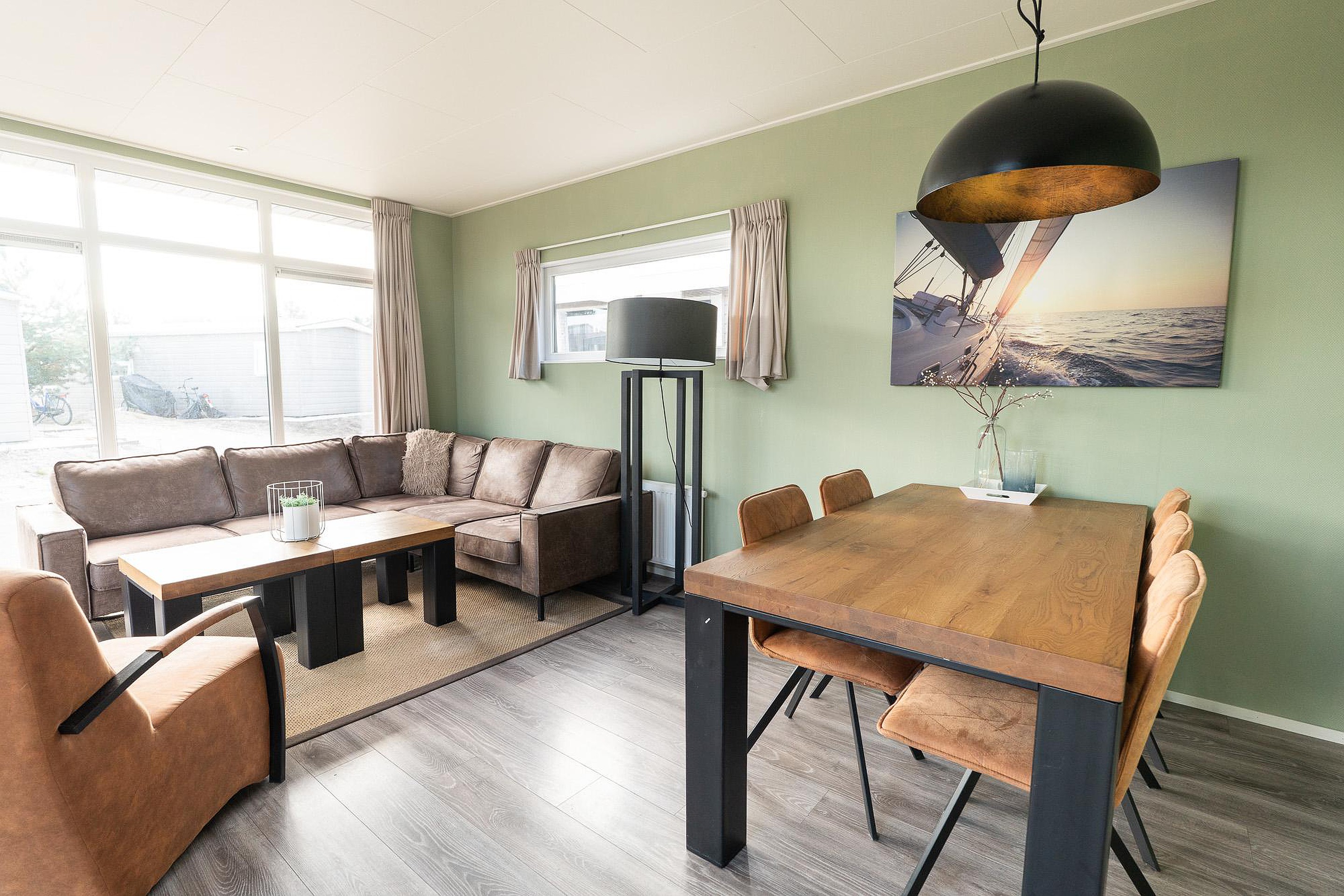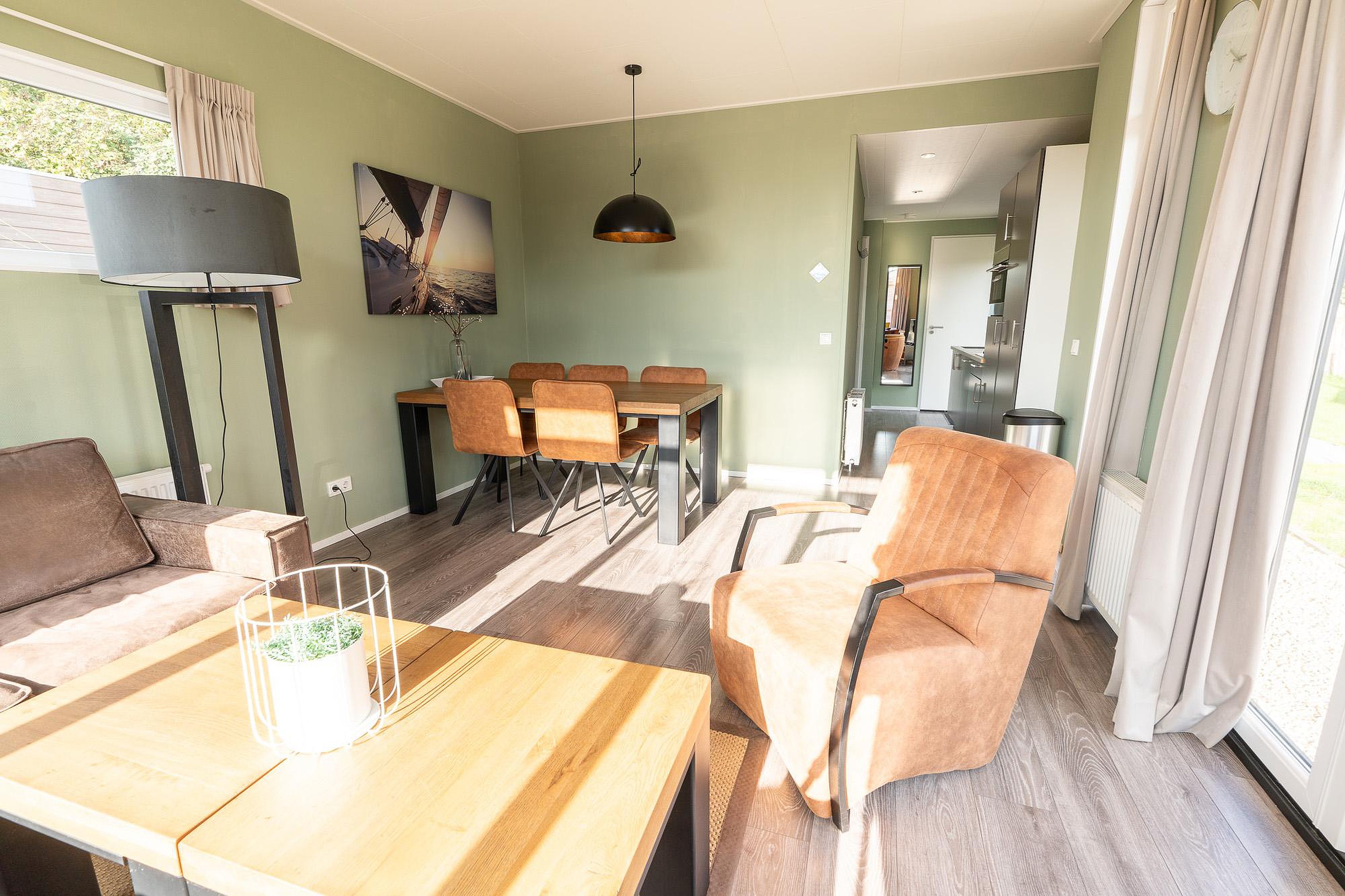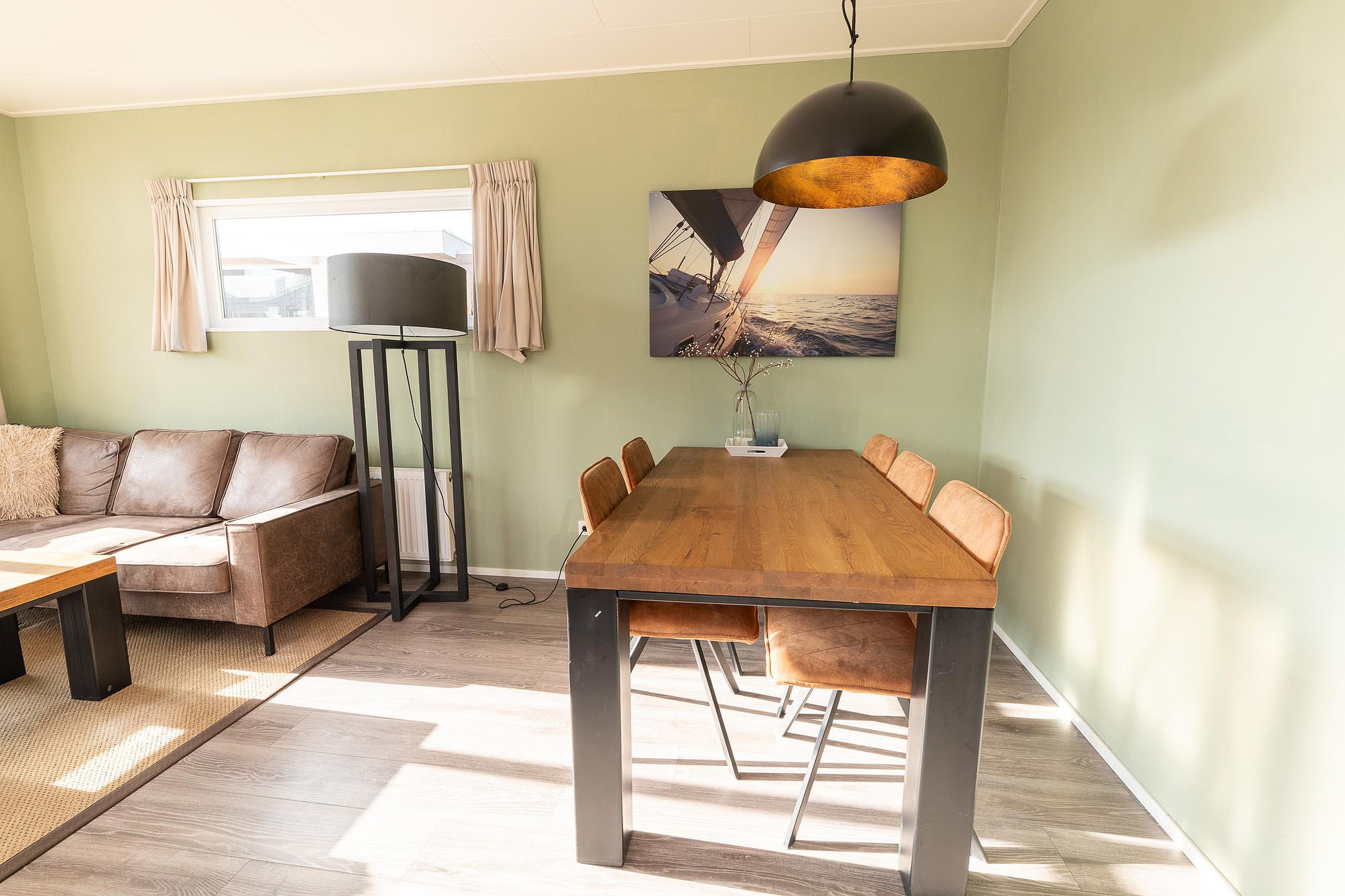 De woonkamer is licht en nodigt uit tot ontspanning. De net wat hogere plafondhoogte draagt bij aan een fijn gevoel van ruimte. Er is een comfortabele zithoek voor vier personen aanwezig. Aansluitend aan de woonkamer en in directe relatie met de keuken is de eethoek geplaatst. Zowel het onderhoud van de binnenzijde als het meubilair is in goede staat.