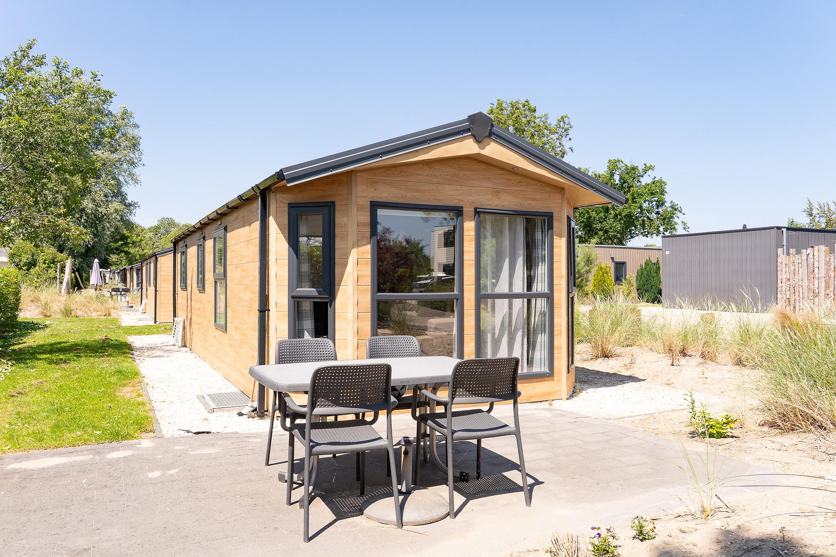 Tuin De tuin rondom het chalet is een oase van rust. De bestrating en beplanting vragen minimaal onderhoud, zodat u maximaal kunt genieten van uw vrije tijd. Het terras is de perfecte plek voor lange zomeravonden, een barbecue of om gewoon te genieten van de zon. U parkeert uw auto bovendien gemakkelijk op eigen erf, direct bij de woning.