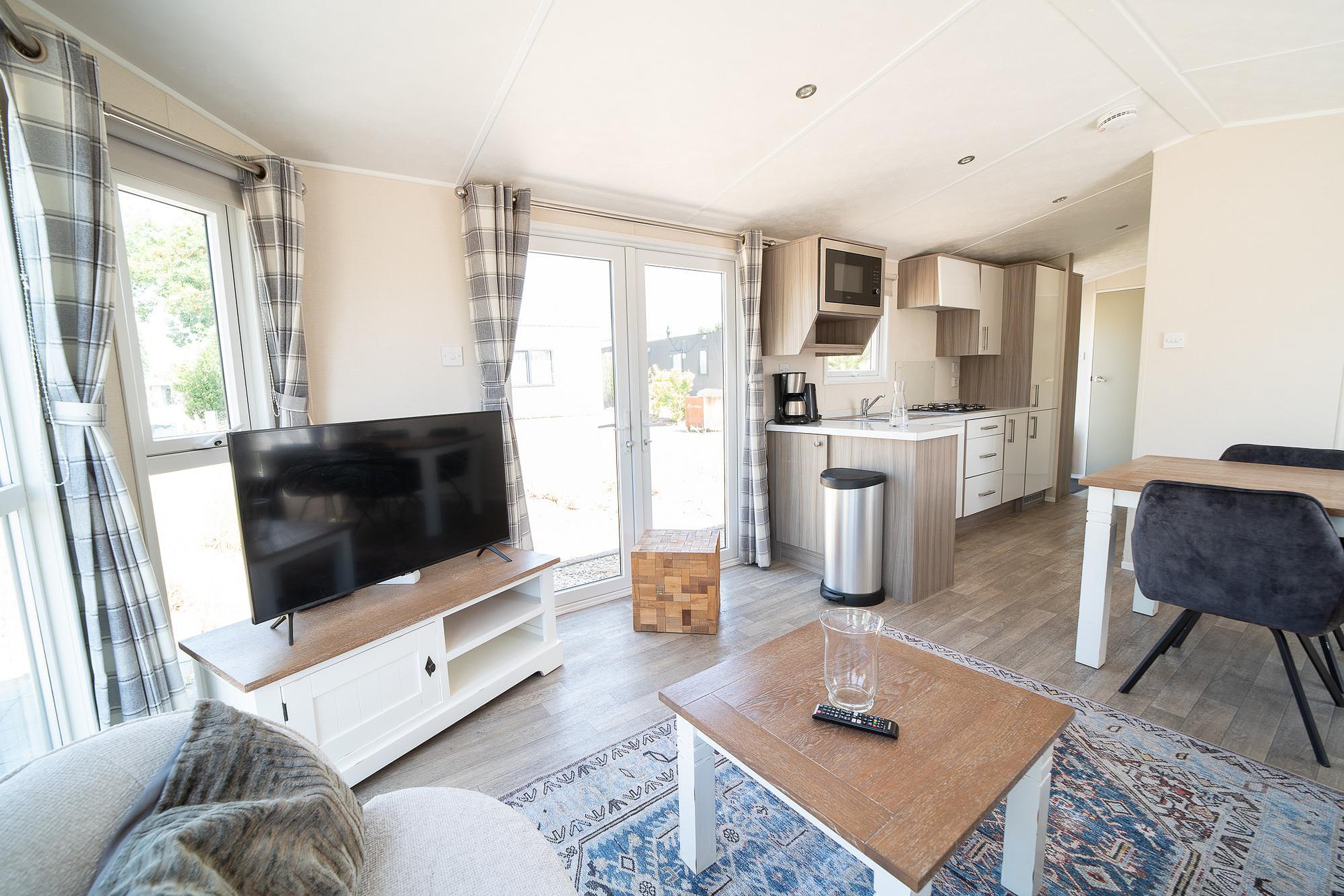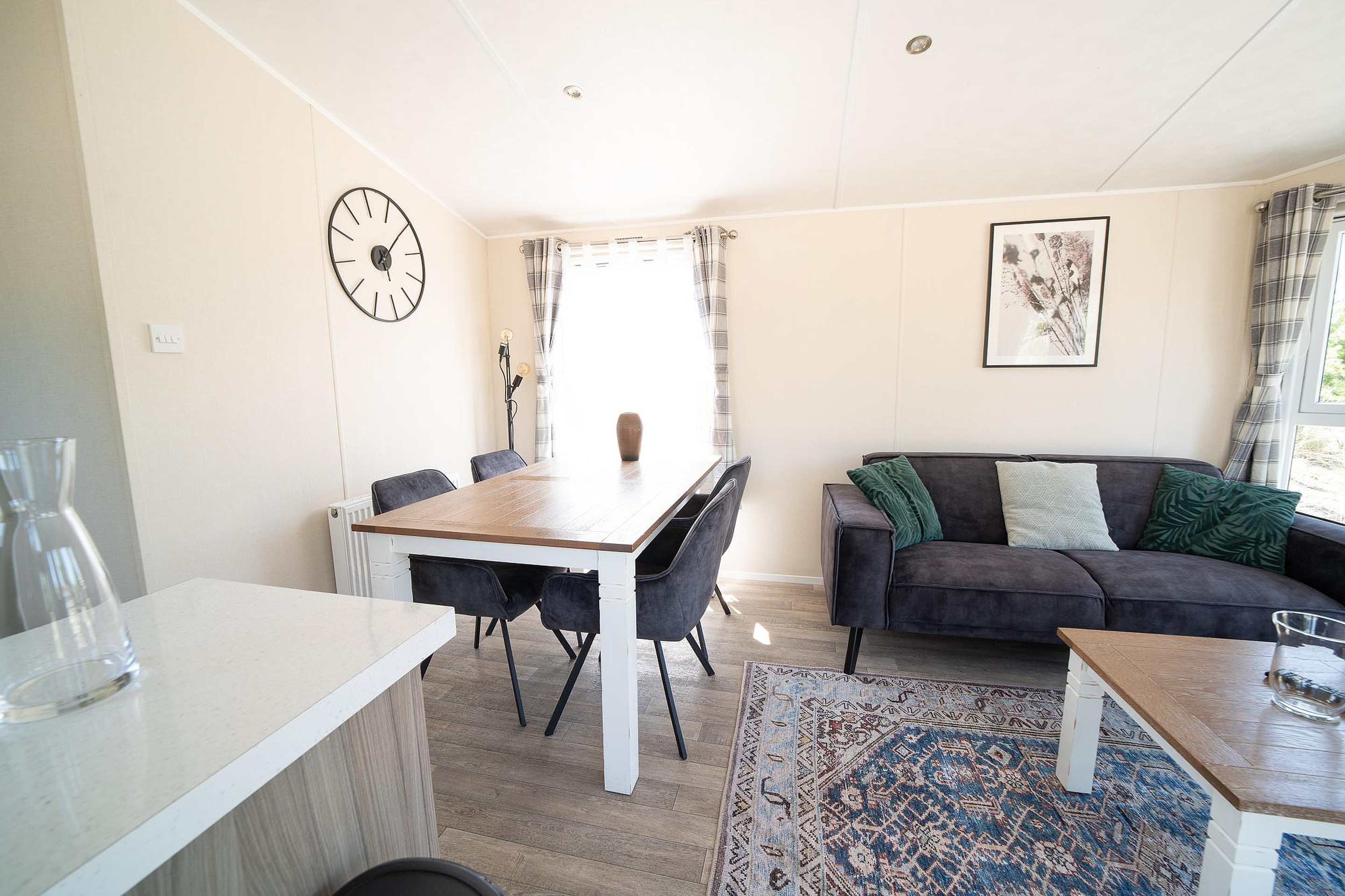 Begane grond Dit chalet is slim ontworpen om elke vierkante meter optimaal te benutten. De gezellige woonkamer is het hart van de woning en biedt een heerlijke plek om te ontspannen na een dag vol activiteiten. Grote ramen zorgen voor veel lichtinval en bieden een fraai uitzicht op het terras, waardoor binnen en buiten naadloos in elkaar overlopen.