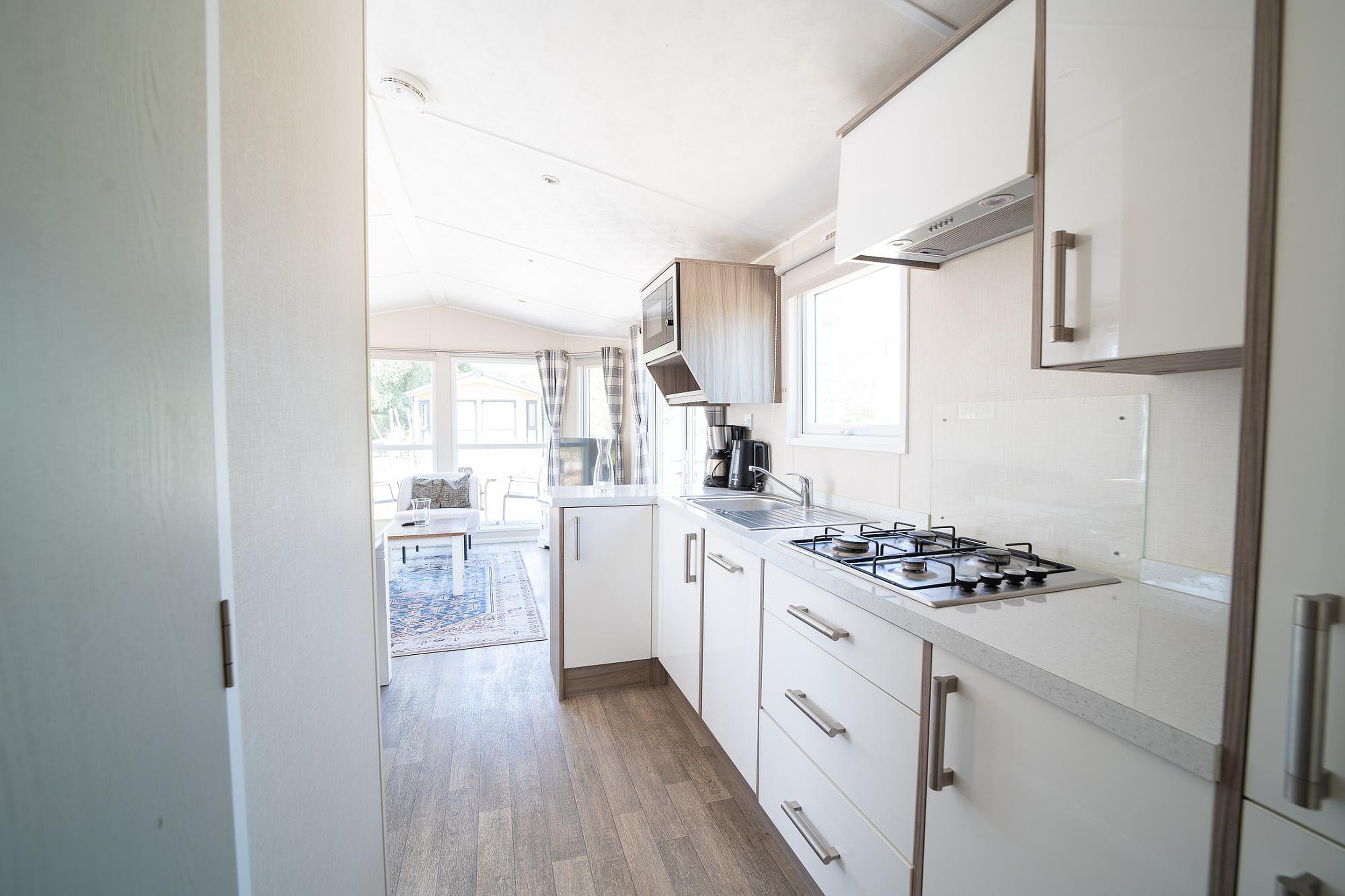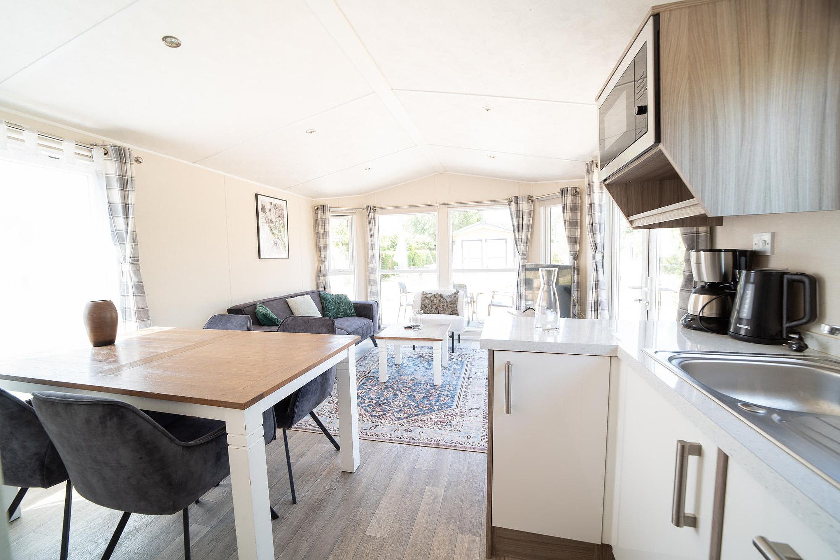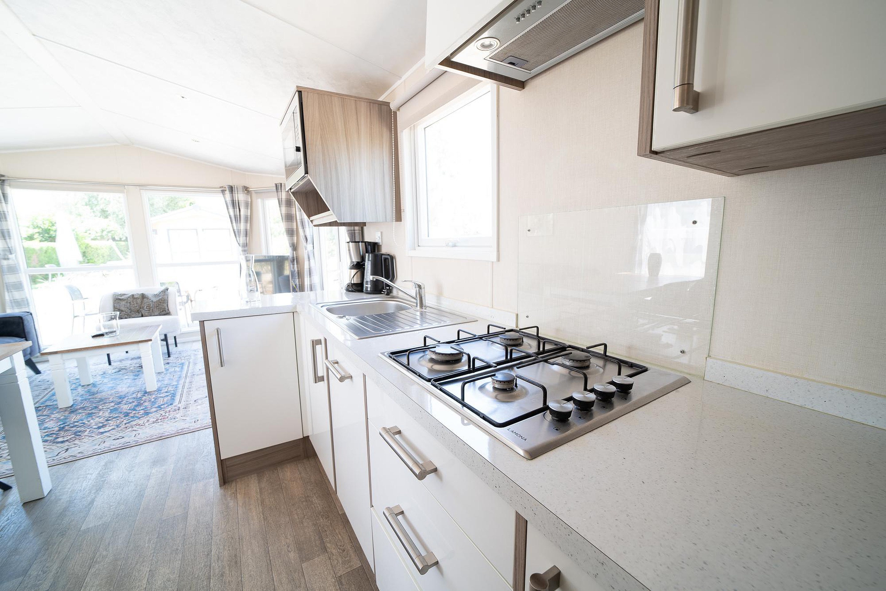 - Eethoek en complete keuken met magnetron, koelkast, vaatwasser en gasfornuis.