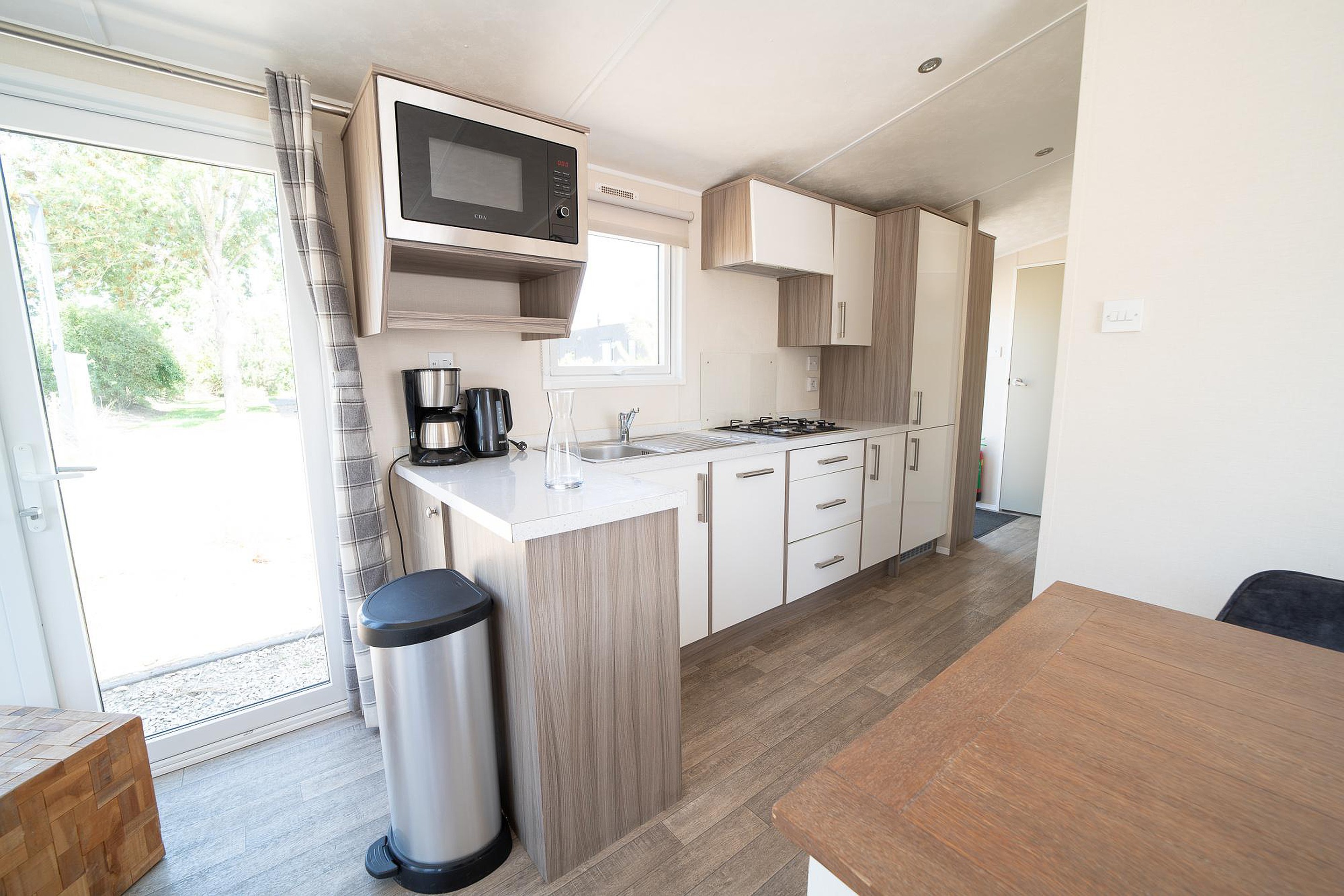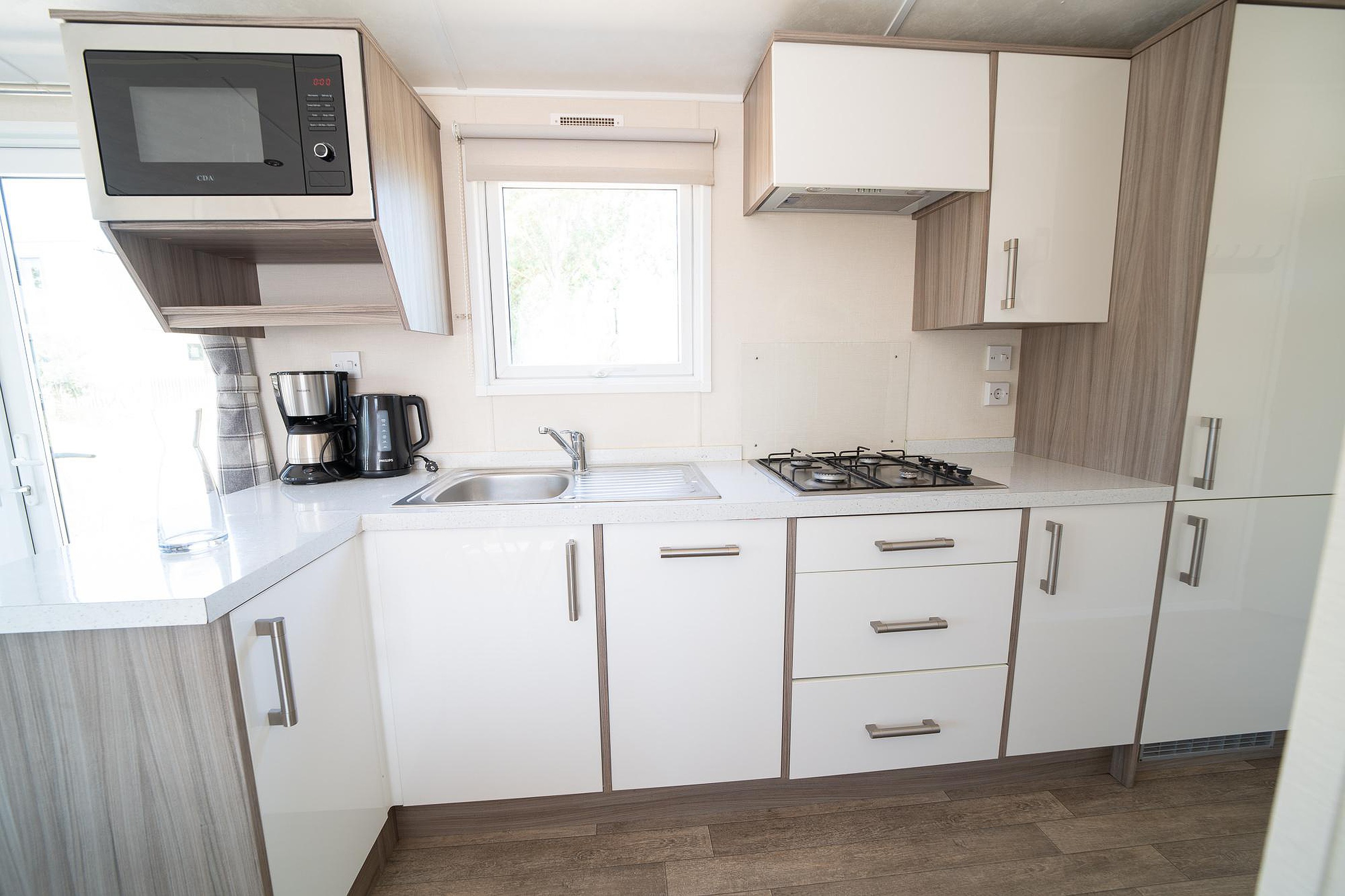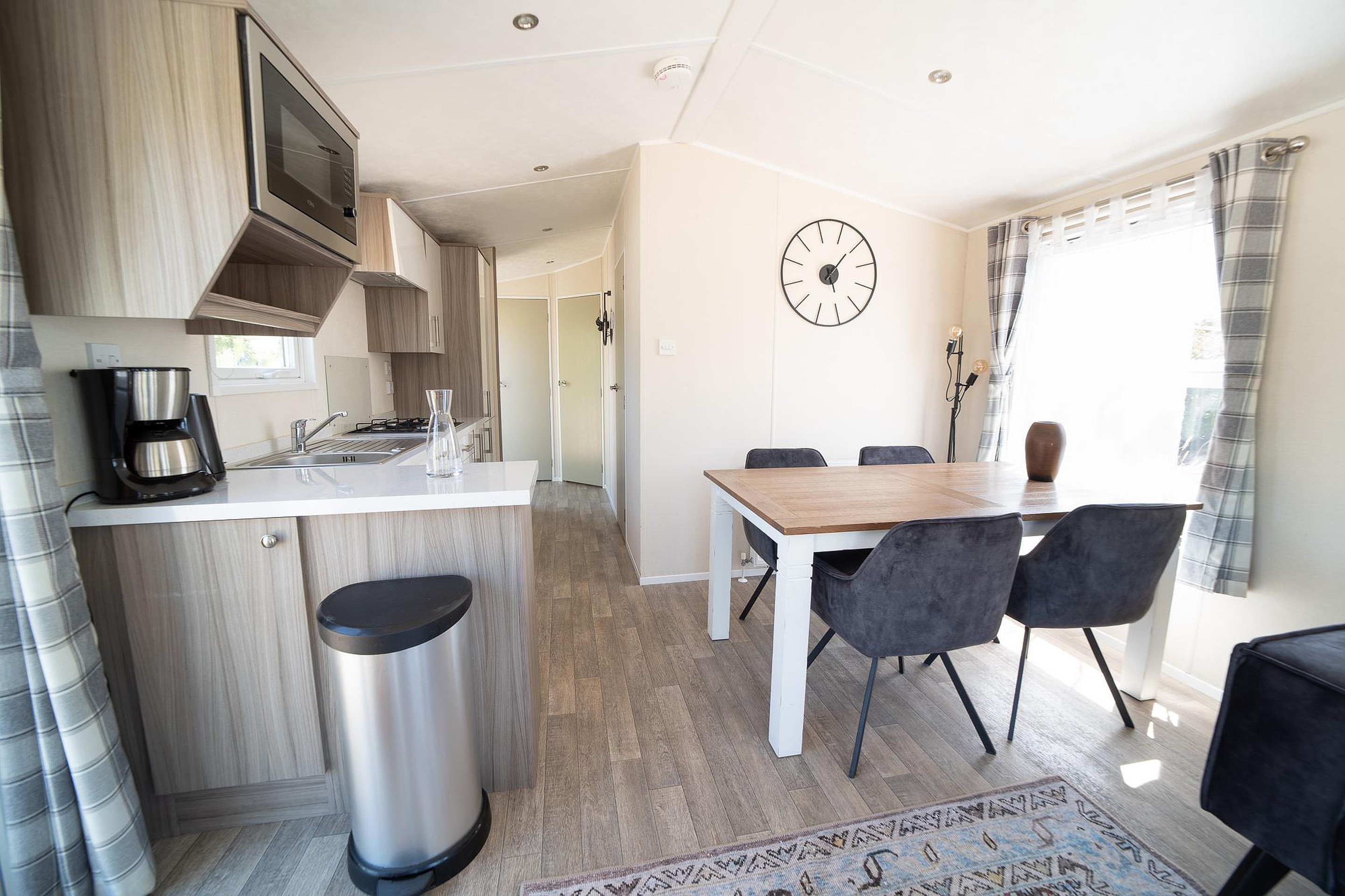 In het verlengde van de woonkamer bevindt zich de eethoek, waar u gezellig kunt tafelen met familie of vrienden. De compacte maar complete keuken is perfect voor het bereiden van maaltijden en is uitgerust met een magnetron, koelkast, vaatwasser en een gasfornuis. Van een snelle snack tot een uitgebreid diner, alles is hier binnen handbereik.