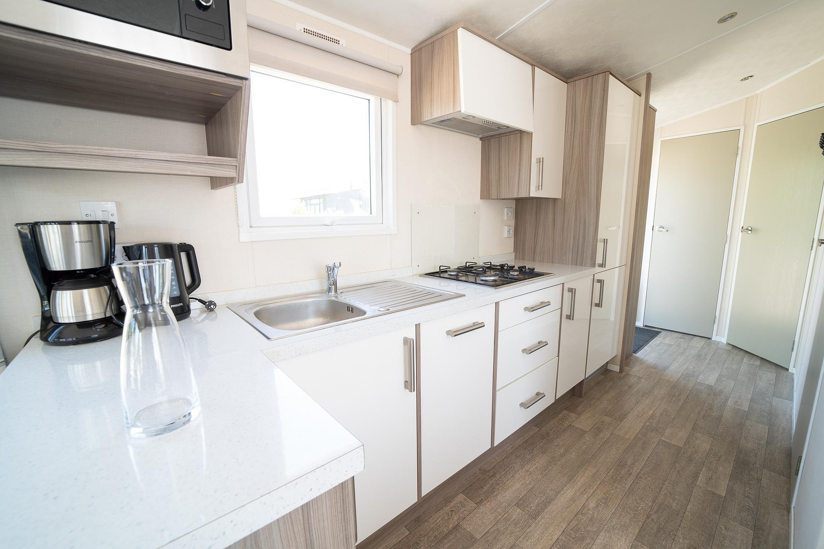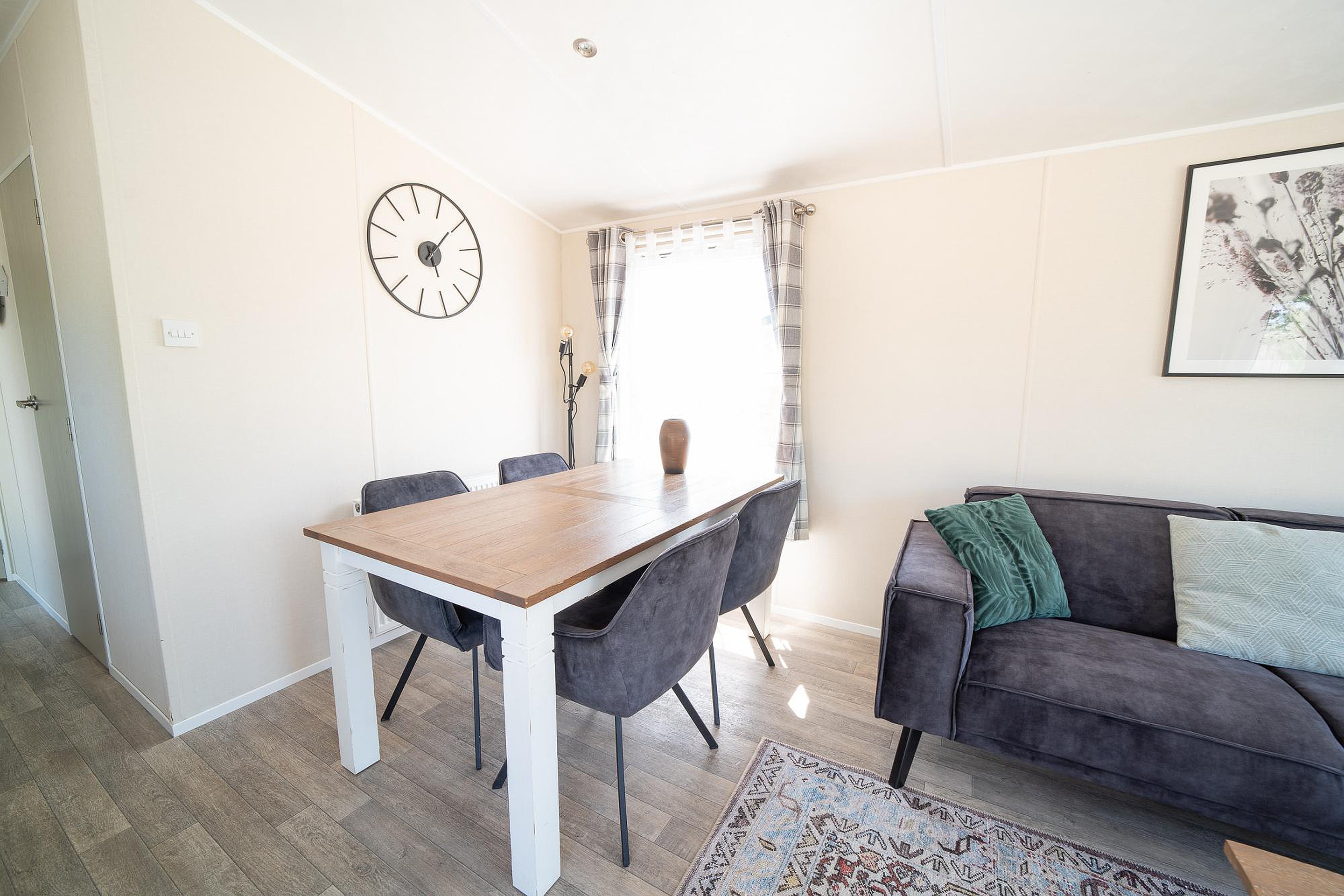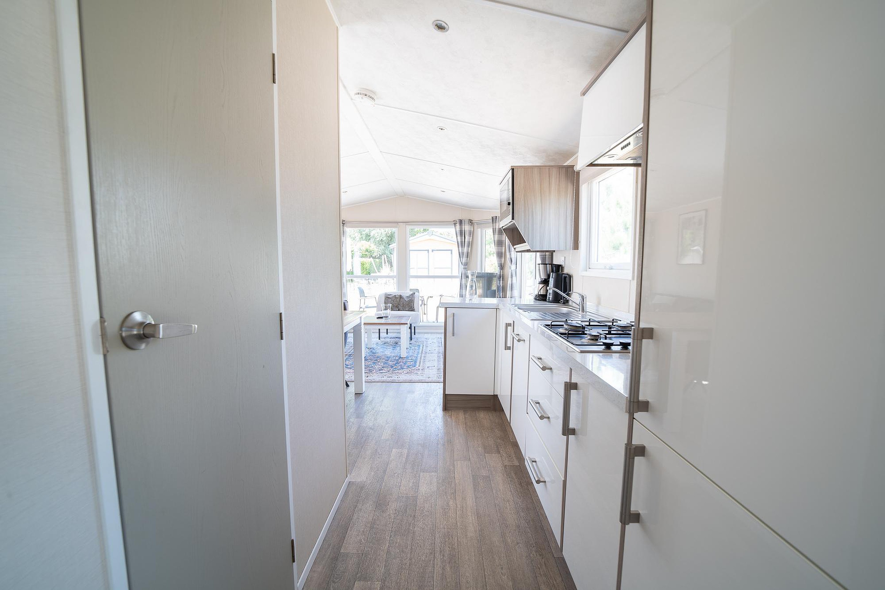 In het verlengde van de woonkamer bevindt zich de eethoek, waar u gezellig kunt tafelen met familie of vrienden. De compacte maar complete keuken is perfect voor het bereiden van maaltijden en is uitgerust met een magnetron, koelkast, vaatwasser en een gasfornuis. Van een snelle snack tot een uitgebreid diner, alles is hier binnen handbereik.