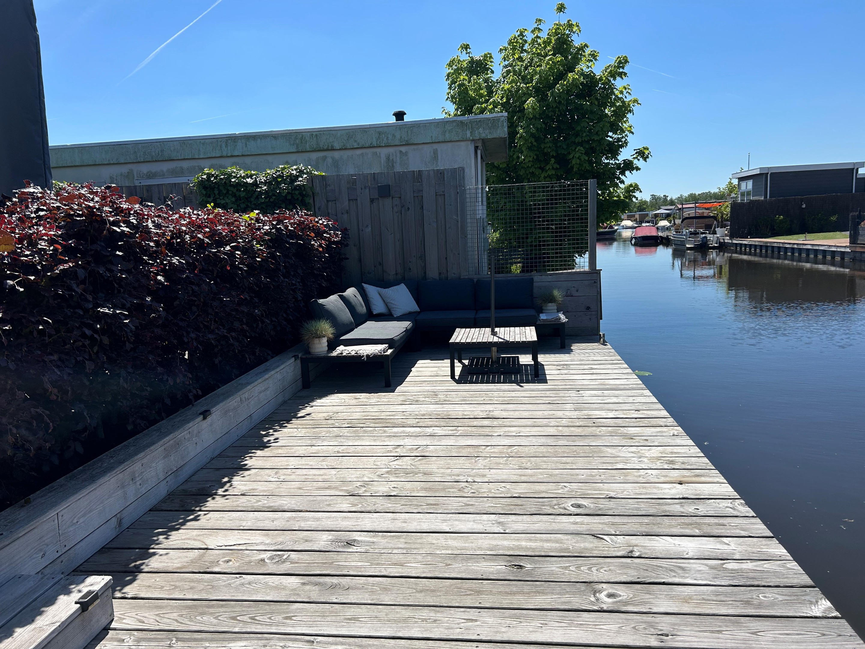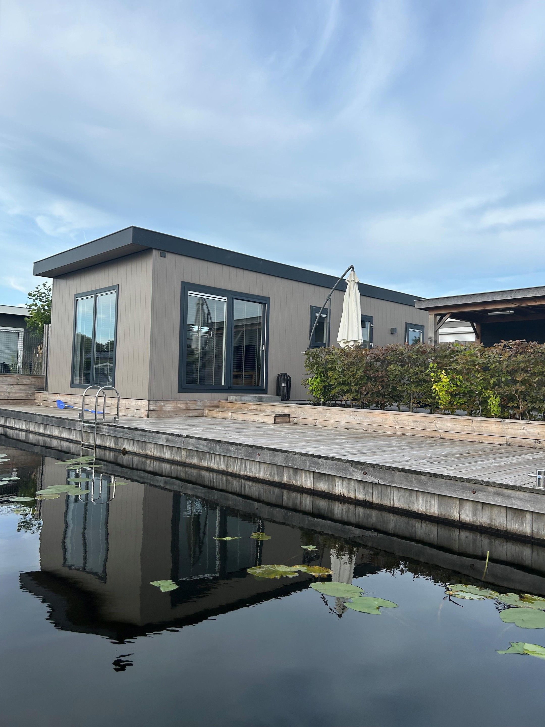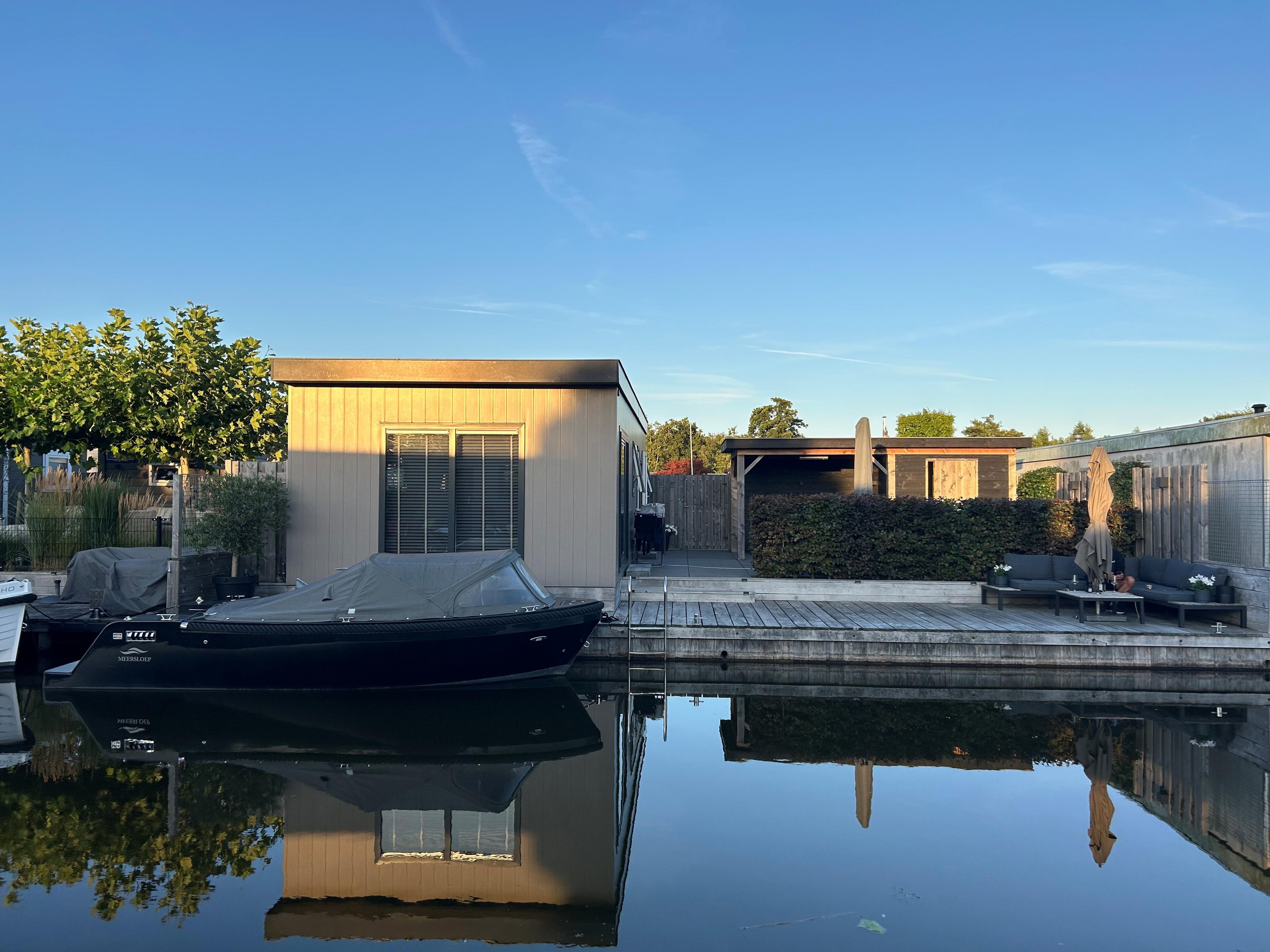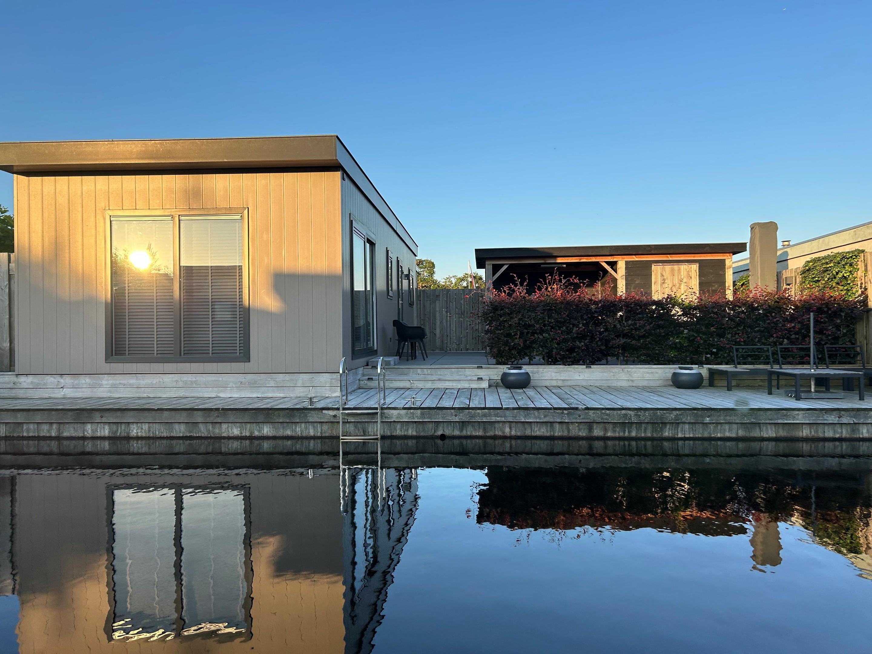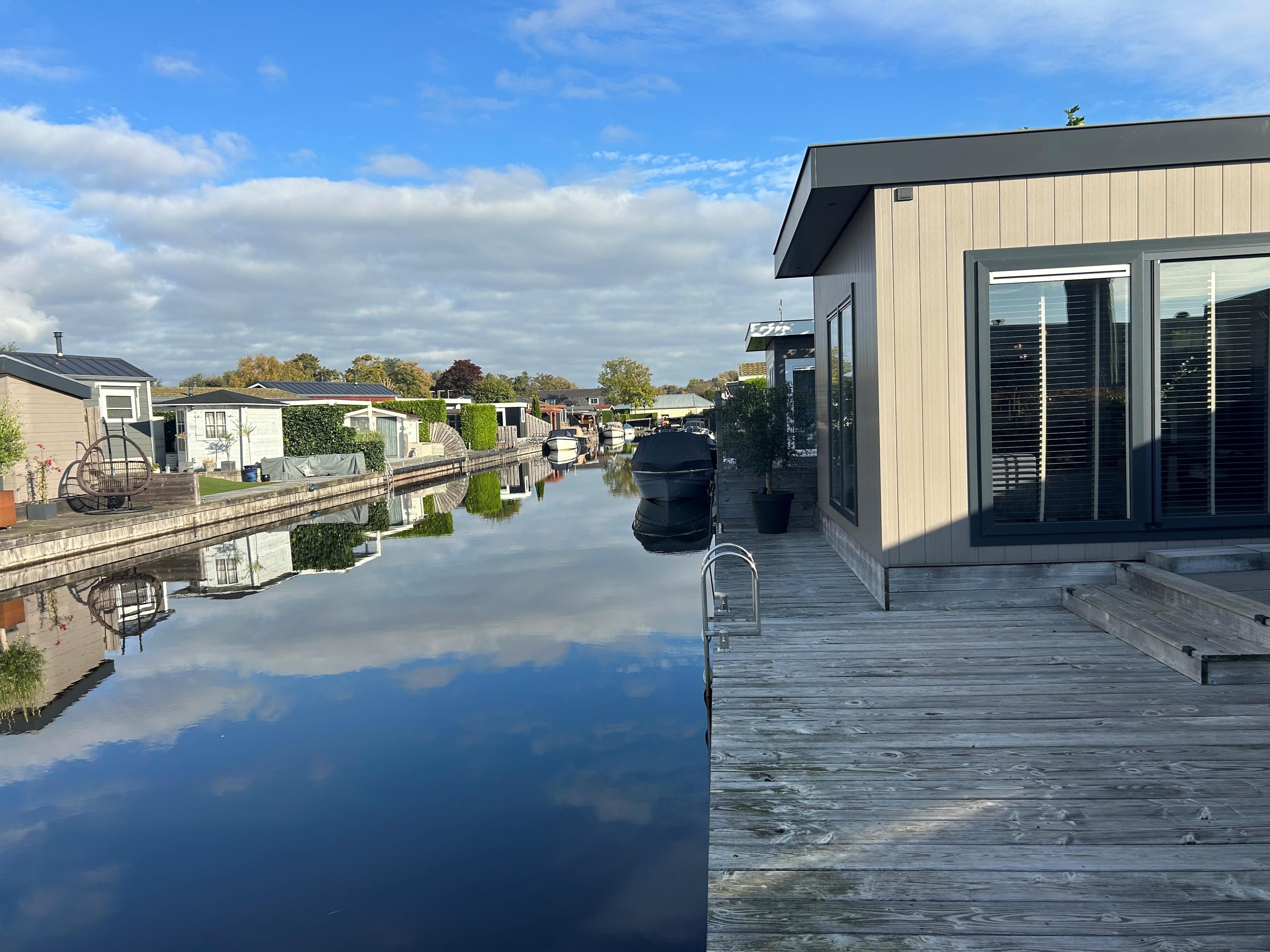 Dit moderne chalet is in 2019 gebouwd en uitgevoerd in onderhoudsarm keralit (vergrijsd ceder) met antracietkleurige kozijnen. Dankzij de ligging aan open vaarwater kun je direct vanaf je eigen steiger zwemmen, suppen of varen. En na een dag op het water? Genieten van de zon op het grote vlonderterras of ontspannen in de lichte woonkamer met airco.