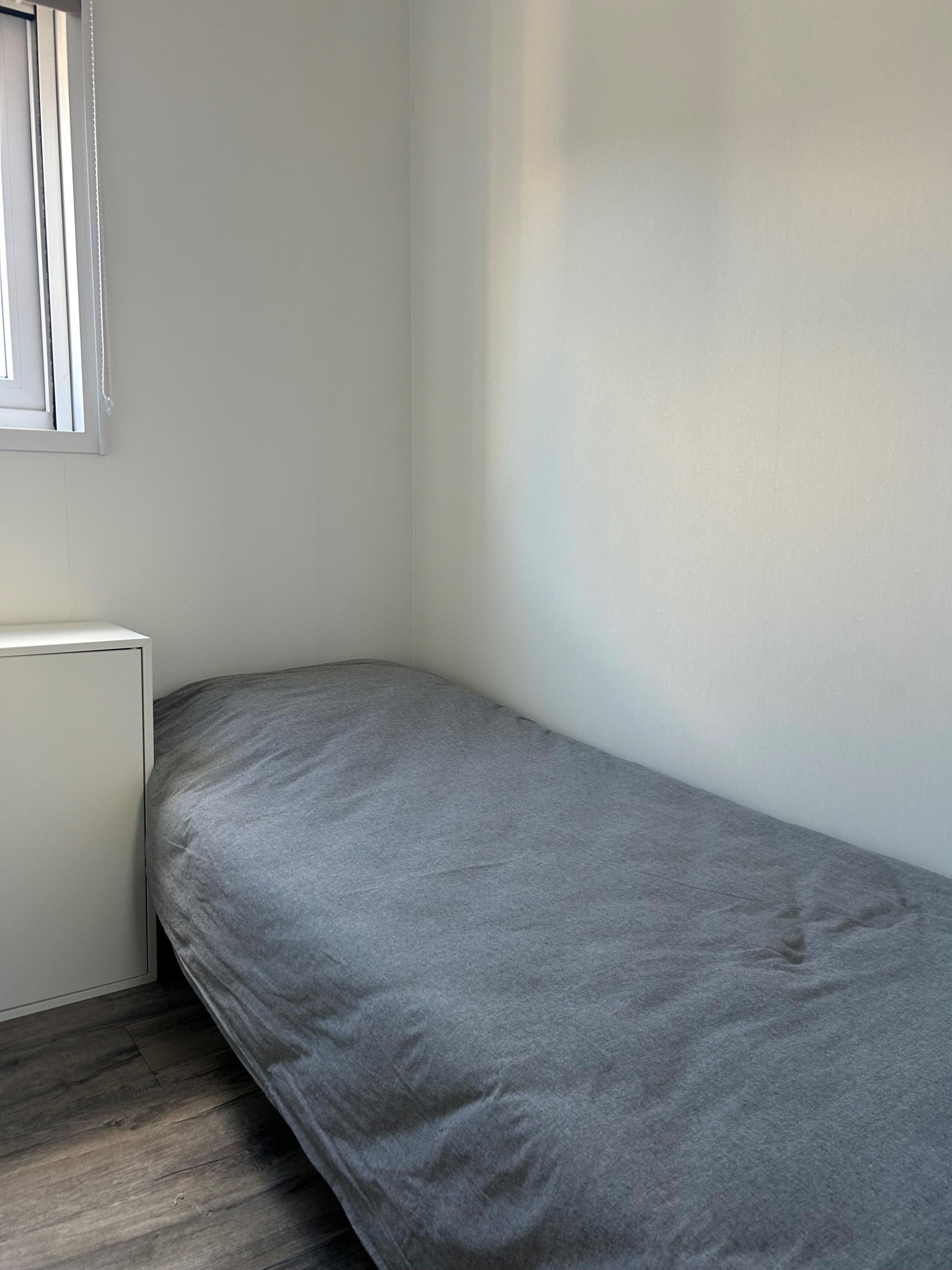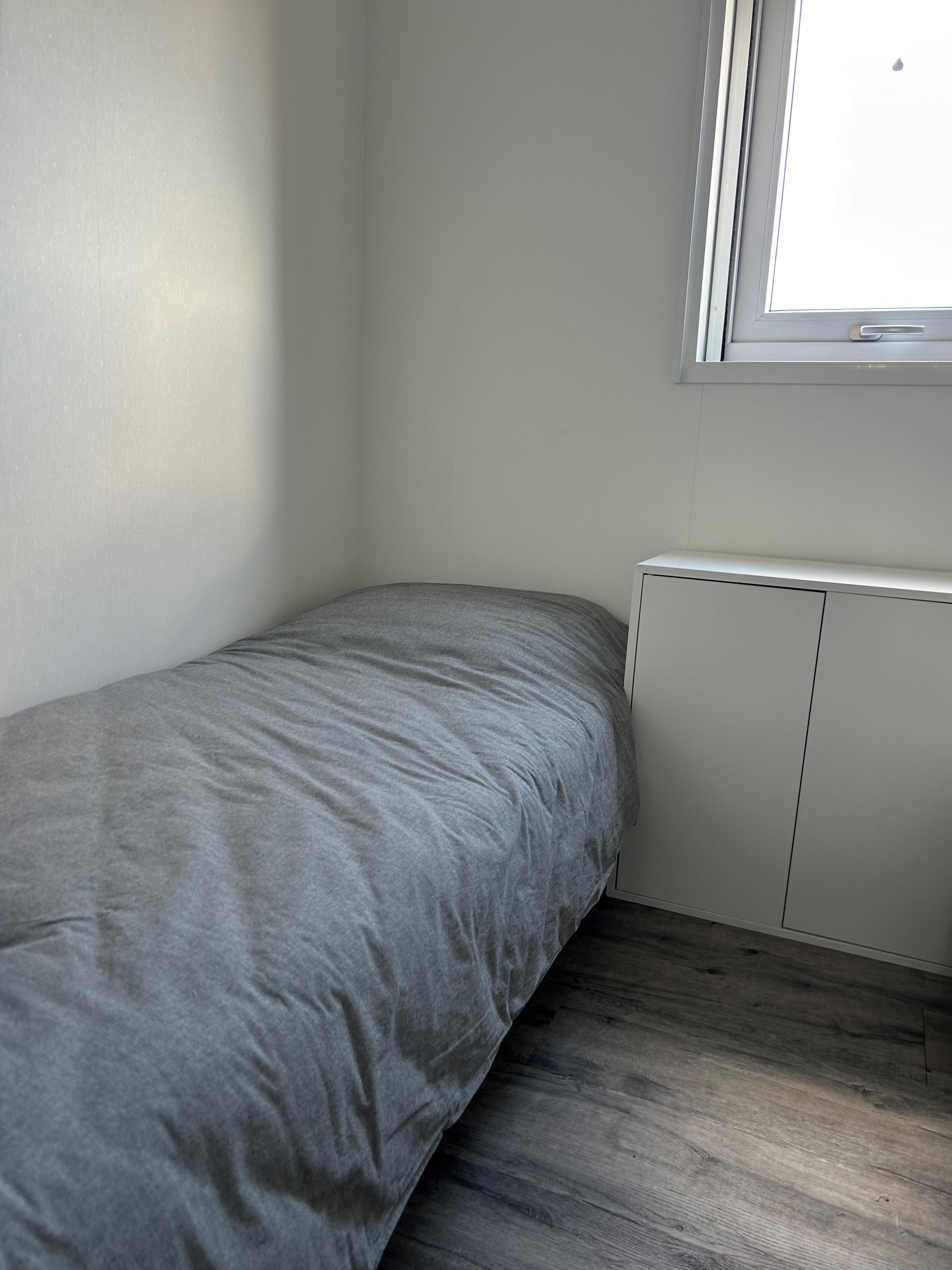 - Grote slaapkamer met tweepersoonsbed (160 x 200 cm), schuifkast, hor en verduisterend rolgordijn