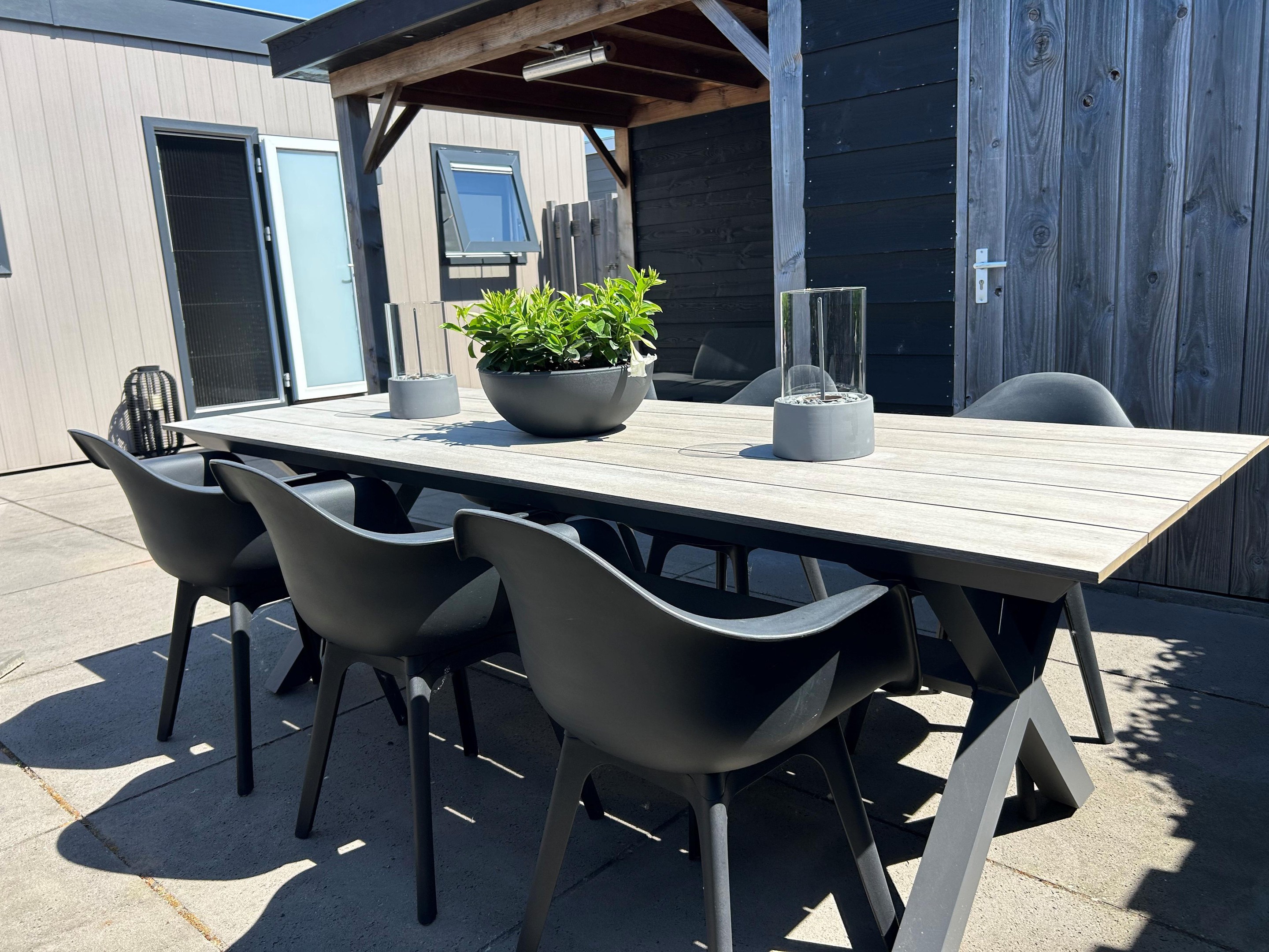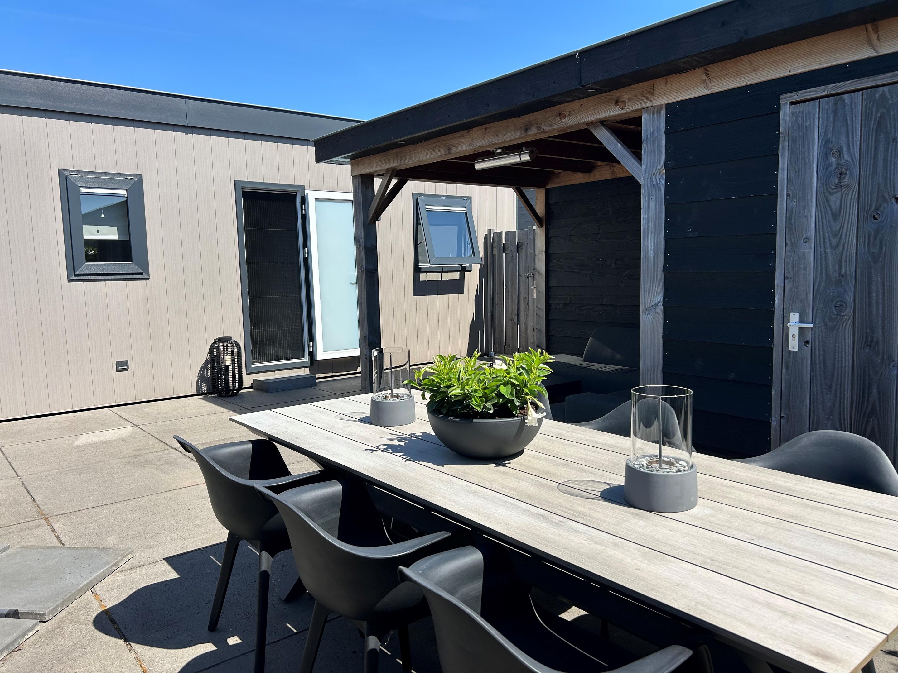 Het onderhoudsarme chalet is bekleed met keralit gevelbekleding in vergrijsd cederkleur, gecombineerd met antracietkleurige kozijnen.