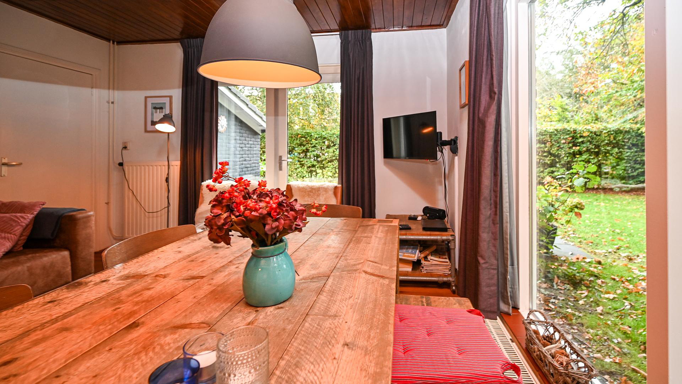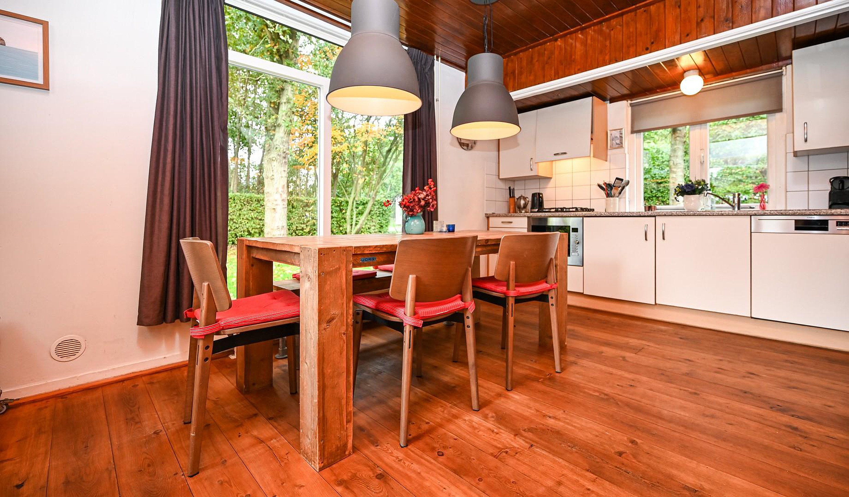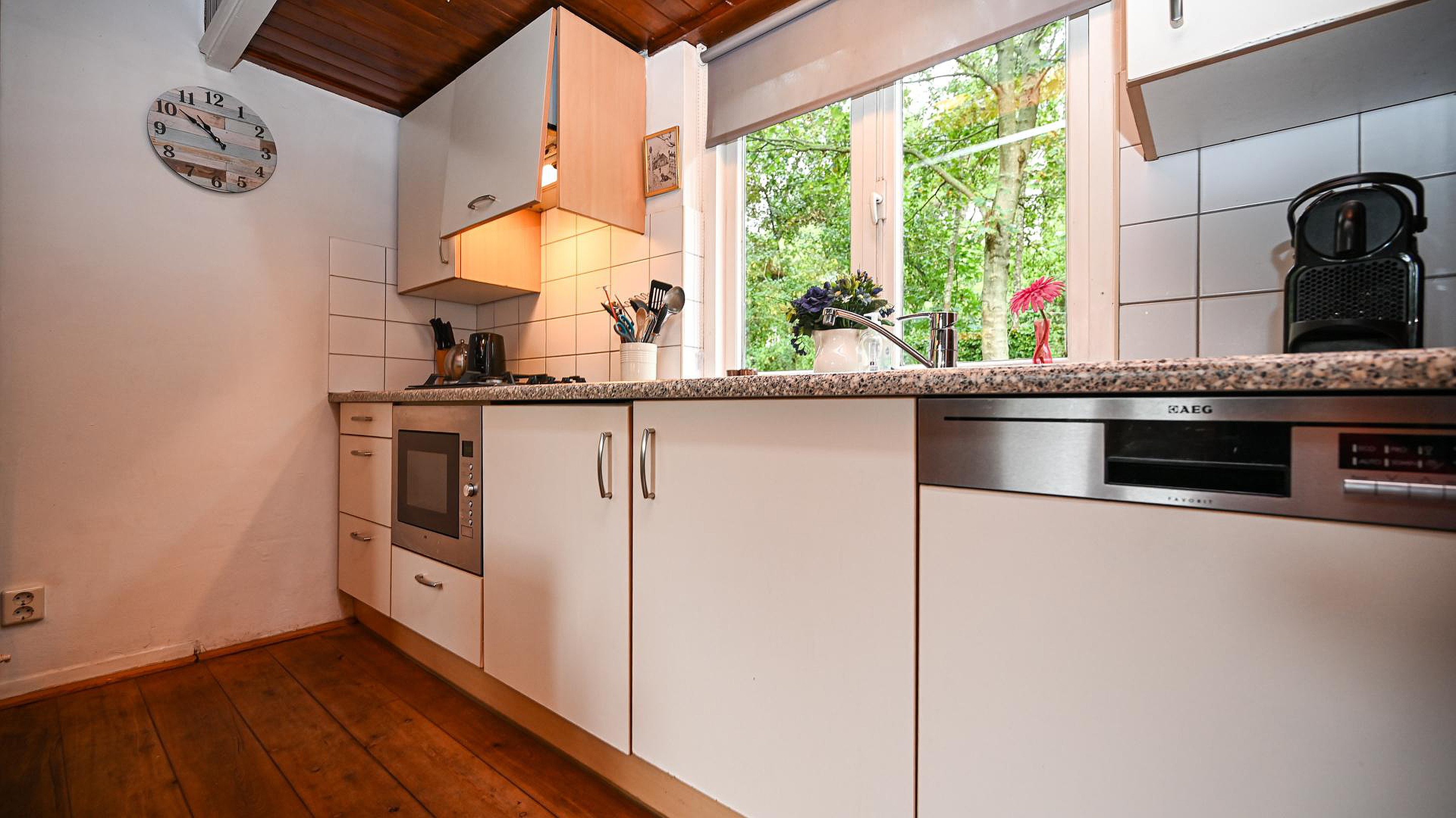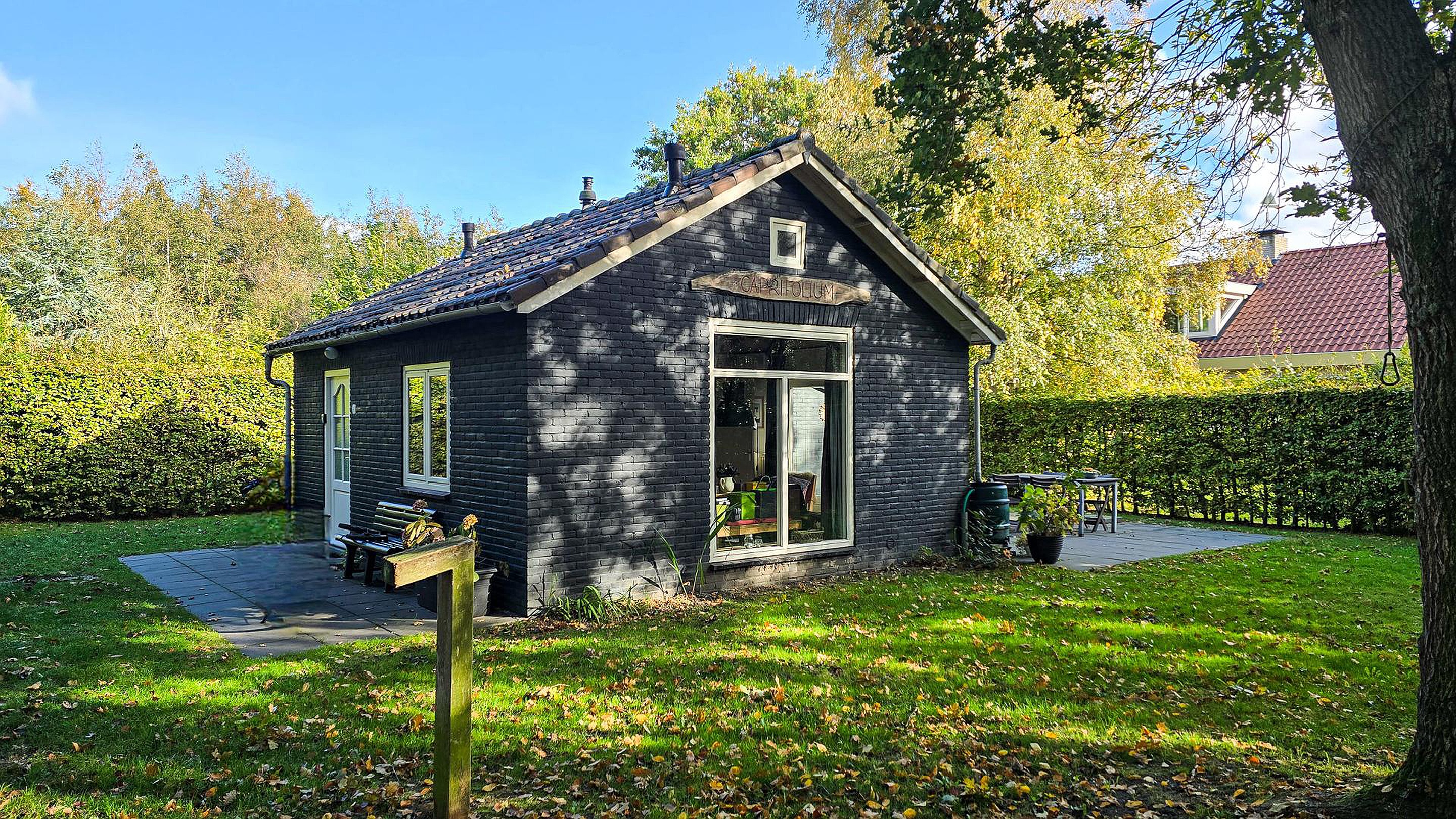 ‘Caprifolium’ beschikt over een knusse woonkamer met open keuken en openslaande deuren naar het zonnige terras op het zuiden, waardoor binnen- en buitenleven naadloos in elkaar overgaan. Daarnaast is er een praktische doorloopslaapkamer, ideaal als kinder- of werkkamer en een tweede slaapkamer met uitzicht op de groene tuin. De badkamer is voorzien van een douche en wastafel met daarnaast een separaat toilet in de de hal. De tuin rondom de woning is fraai aangelegd en volledig omheind door groen en een toegangshek wat zorgt voor optimale privacy en een veilig gevoel. De sfeer van zowel de woning als het perceel is bijzonder warm, knus en met een uniek karakter dat direct een vakantiegevoel oproept het hele jaar rond.