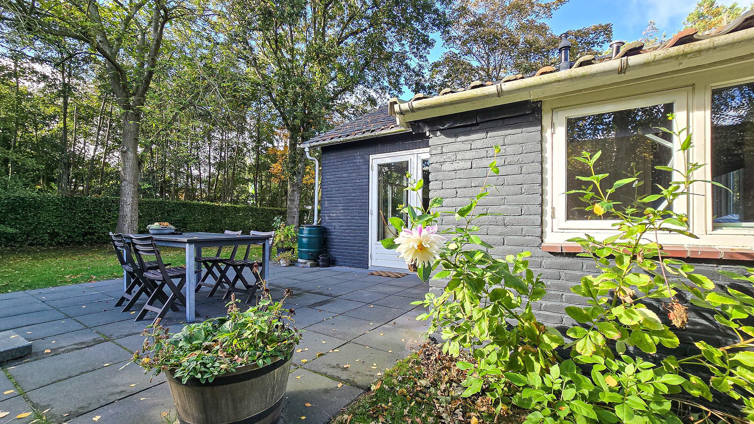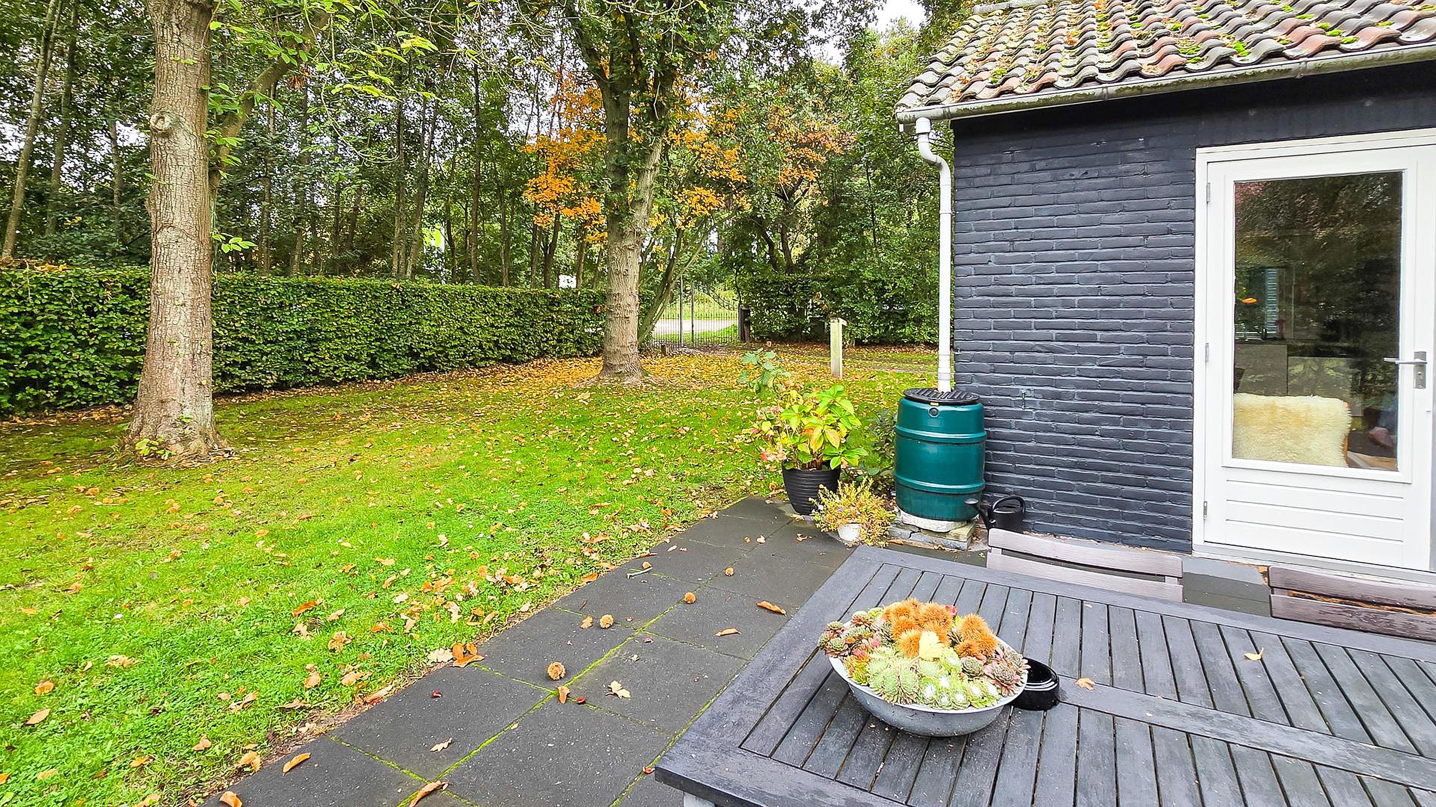 Tuin De woning beschikt over een ruime tuin rondom, met een aangelegd terras op het zuiden. Aan de westzijde biedt een toegangshek toegang tot het perceel en beschikt daarbij over eigen parkeergelegenheid.
