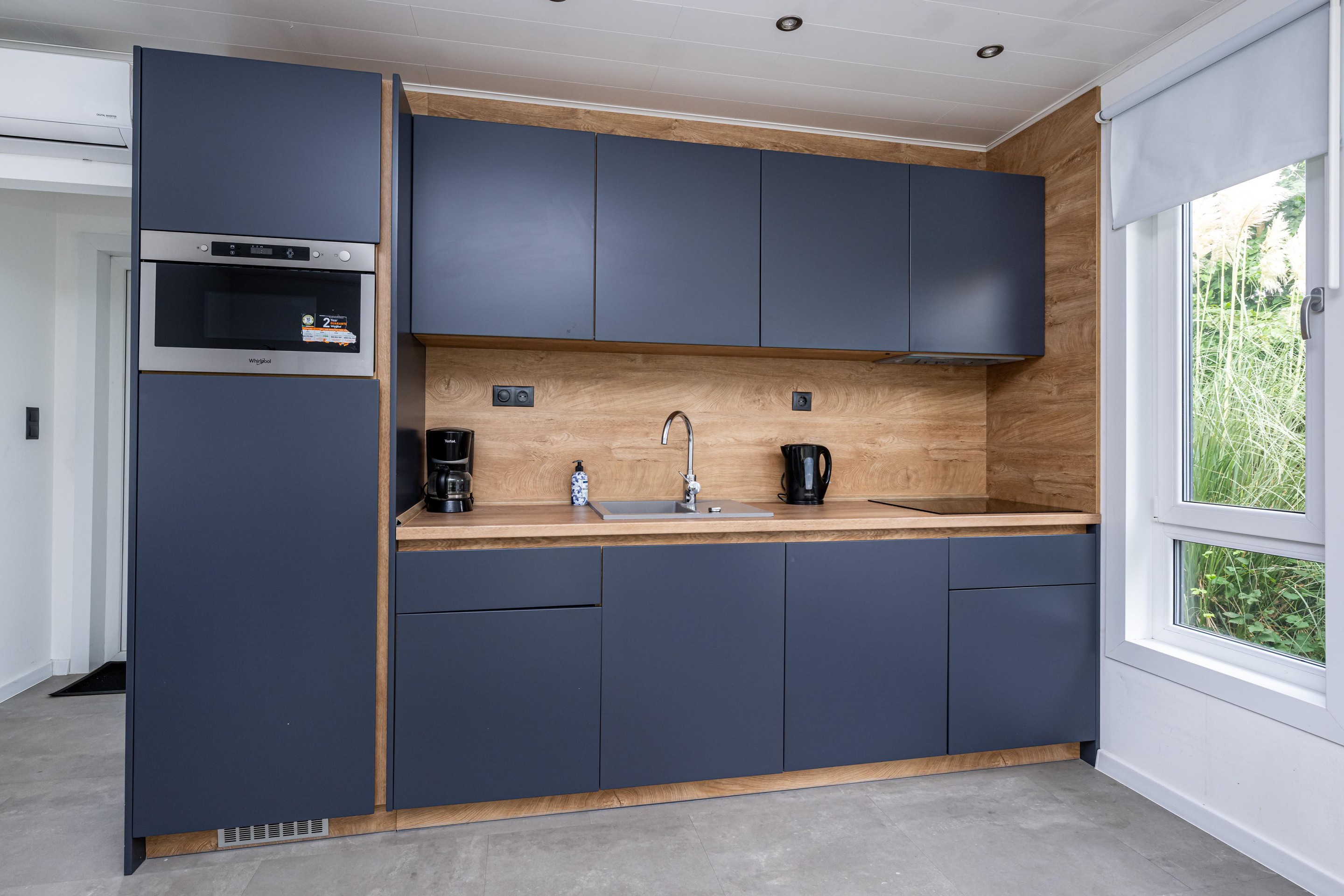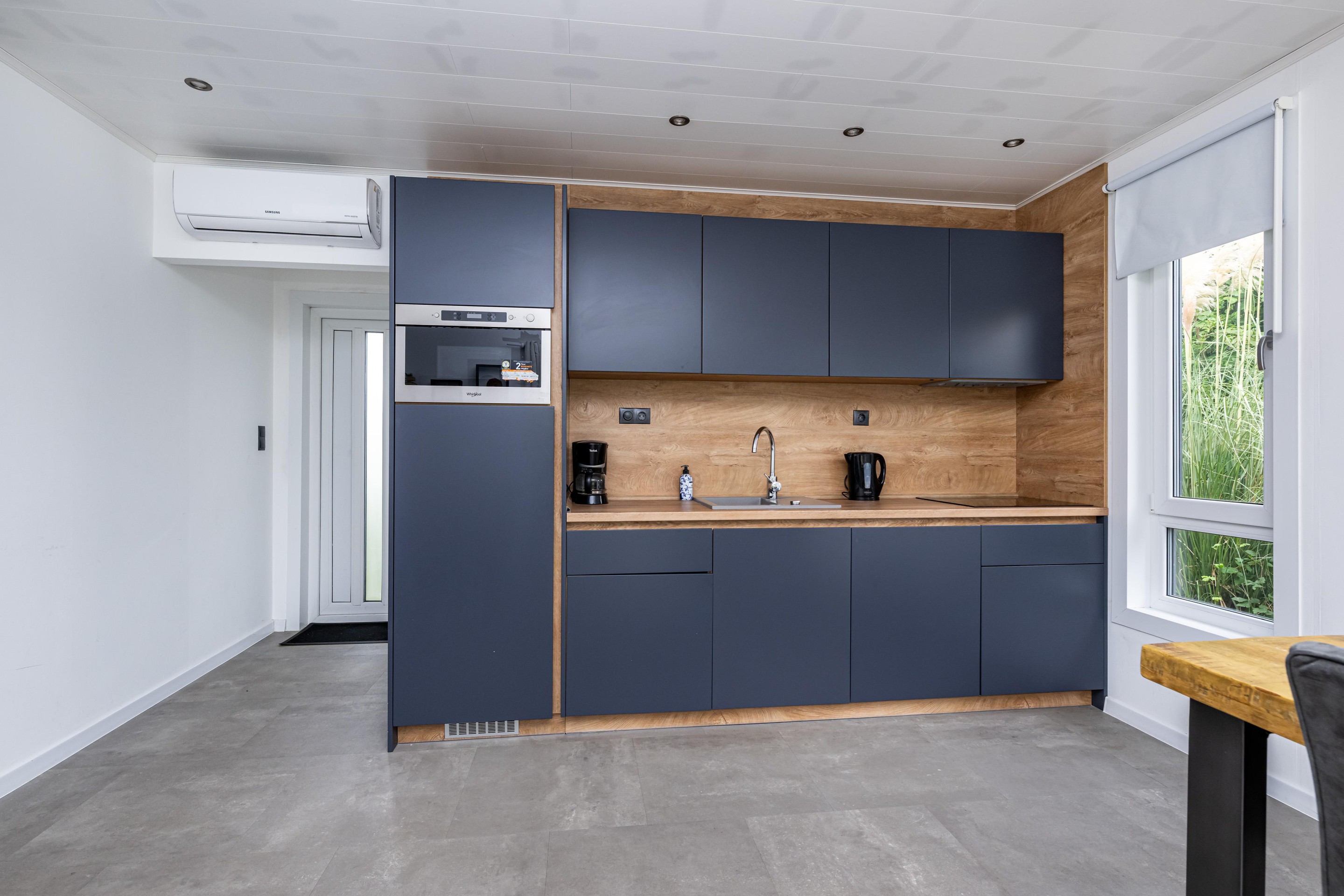 Vinyl vloer, inductiekookplaat, afzuigkap, koelkast, combi-oven, vaatwasser, enkele spoelbak en spots in het plafond.