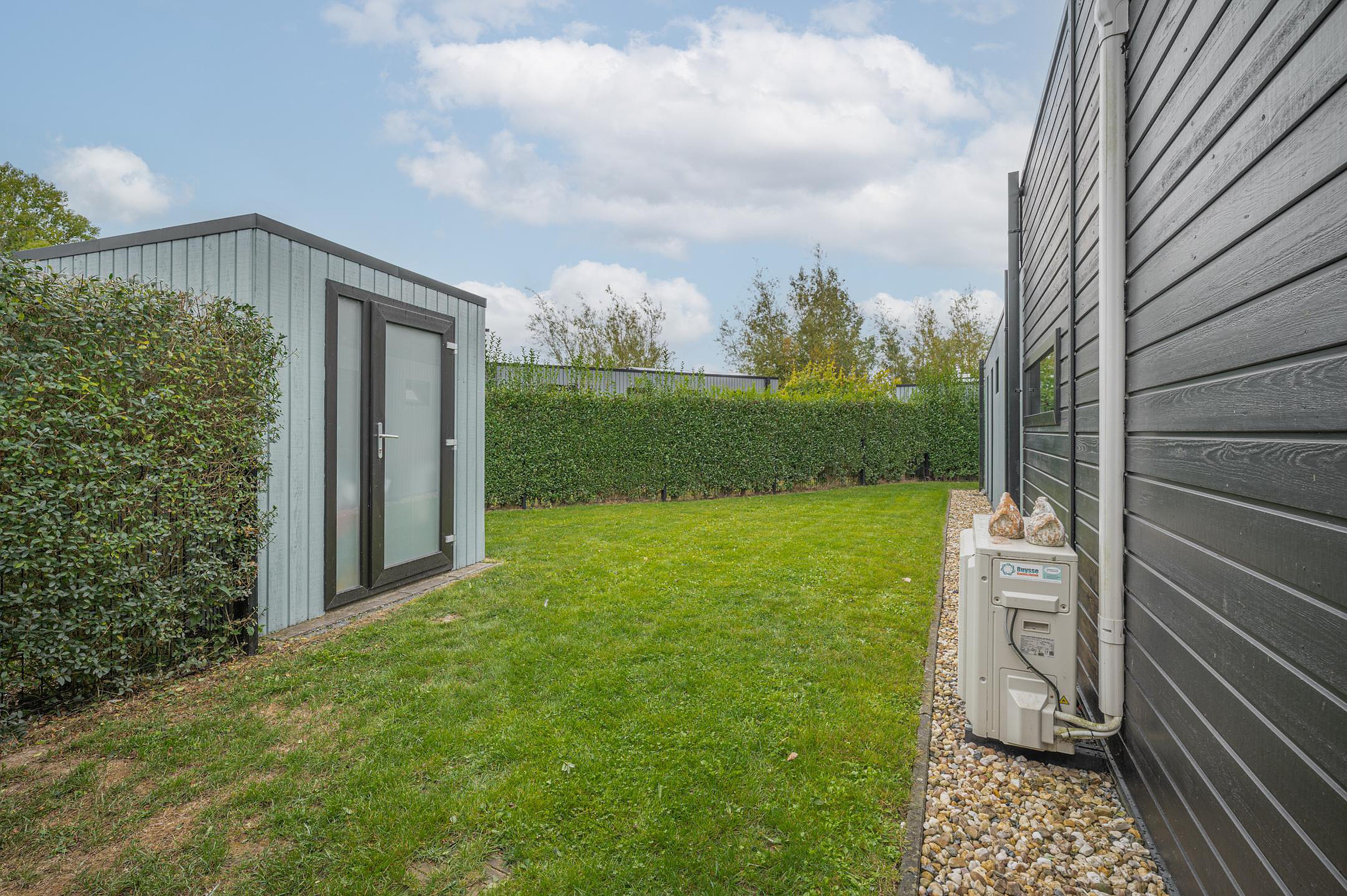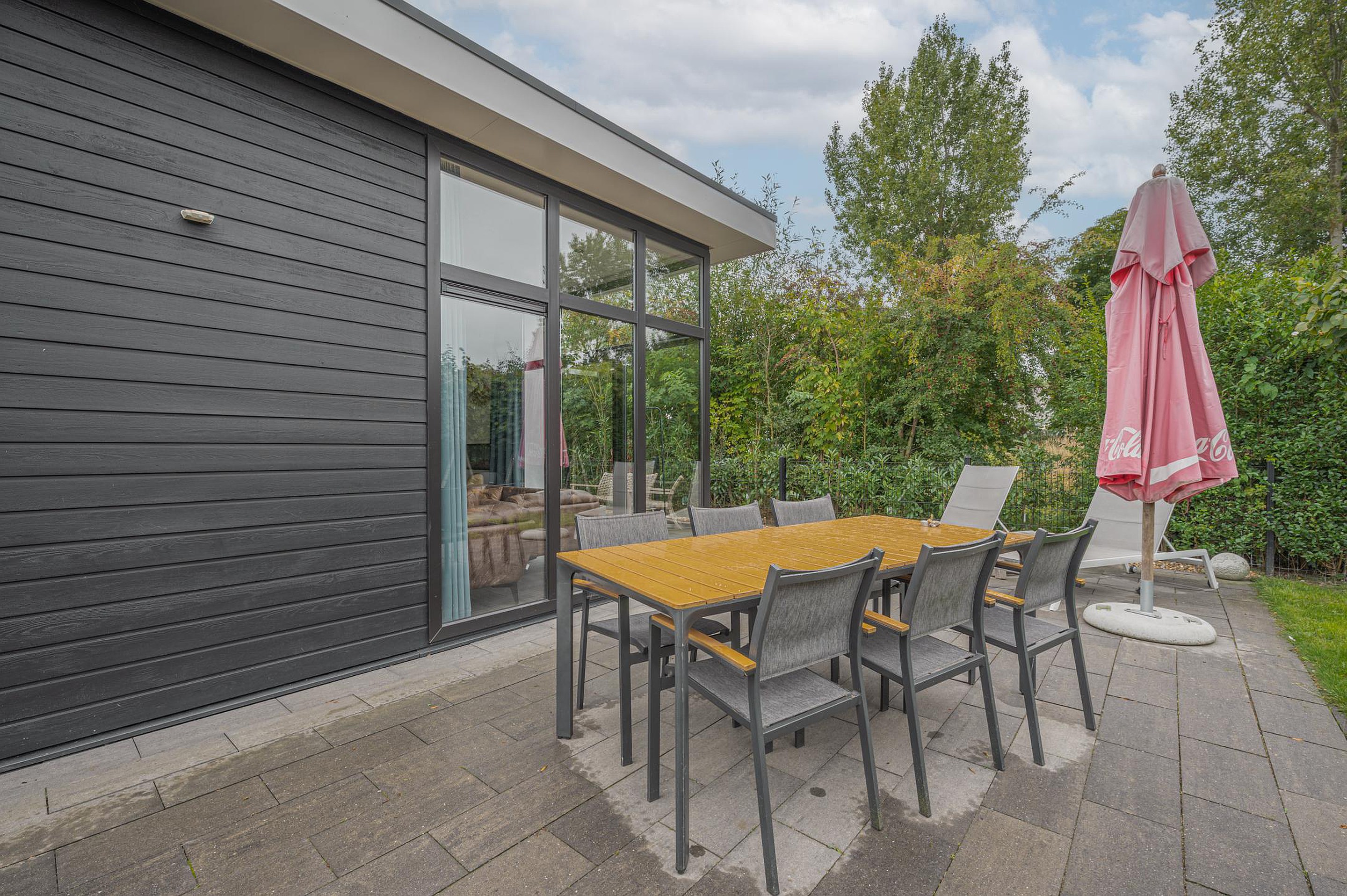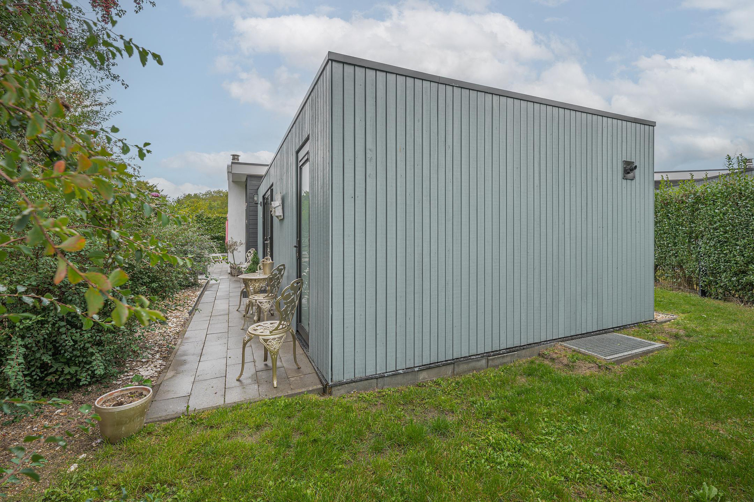Rondom het chalet is een nette tuin met terras en zitgedeelte. Hier kunt u in alle rust genieten van de zon, een goed boek of een gezellige barbecue. Dankzij de ligging en het vele groen ervaart u volop privacy. Daarnaast is er een praktische berging aanwezig voor fietsen, strandspullen of tuinmeubilair.