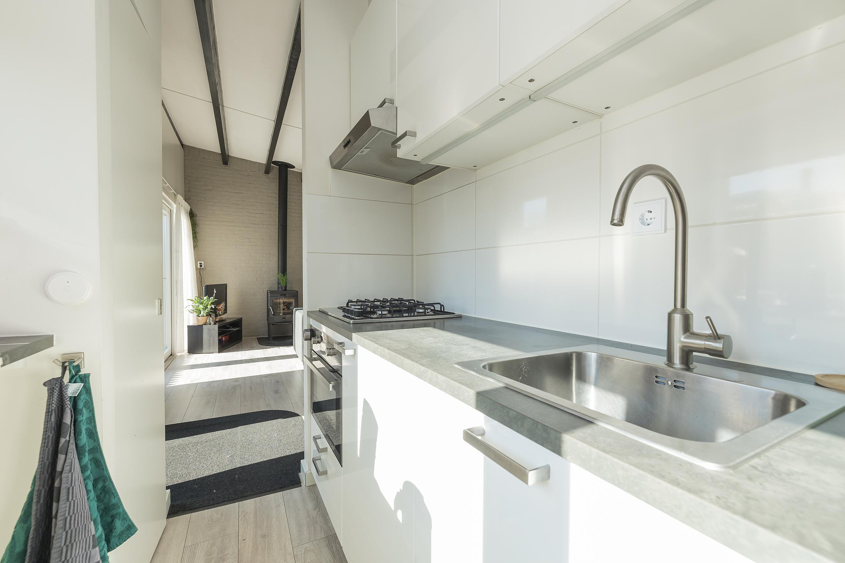 Entree, een sfeervolle en aangenaam lichte woonkamer met een gezellige houtkachel en een schuifdeur naar de tuin. De fraaie en in lichte kleur uitgevoerde keuken is voorzien van diverse inbouwapparatuur zoals een 4-pits gaskookplaat, een afzuigkap, een combimagnetron, een koelkast met vriesvak en een vaatwasser. De volledig en in lichte kleur betegelde badkamer heeft een wastafelmeubel, een toilet, een inloopdouche en de aansluitingen voor de wasapparatuur. Via een dakraam kan de badkamer prima worden geventileerd. De bungalow heeft twee volwaardige slaapkamers, beide met een smaakvolle laminaatvloer.