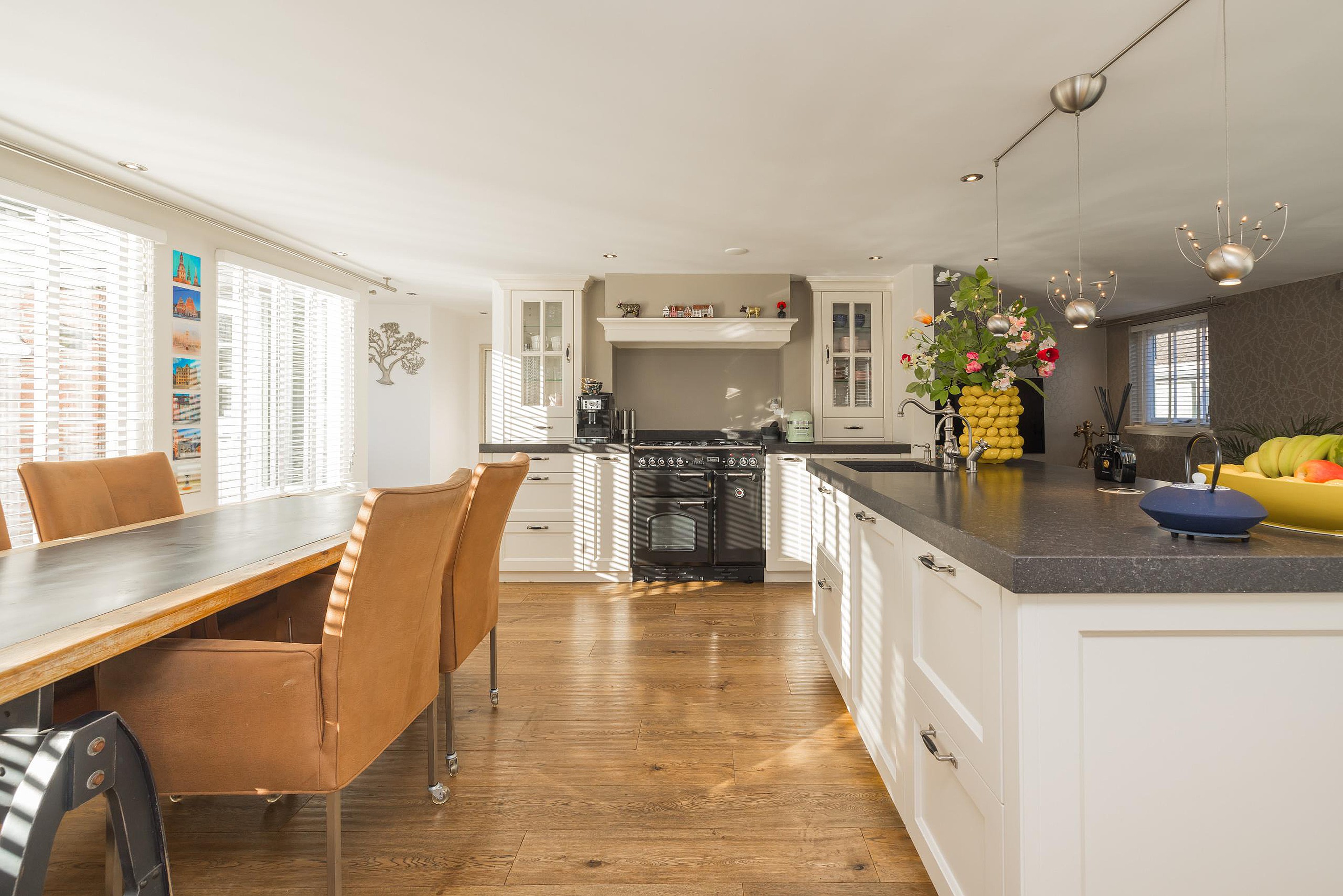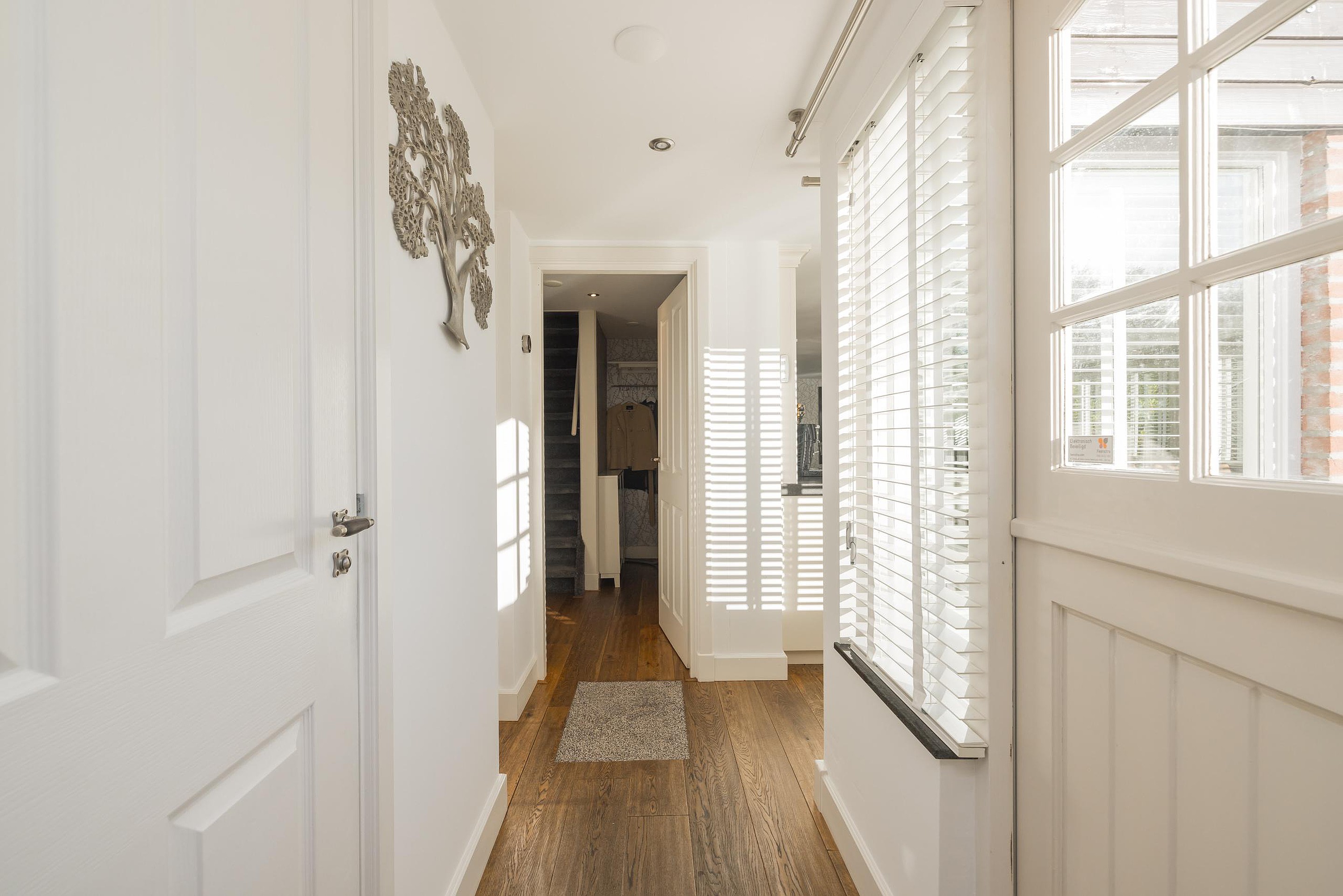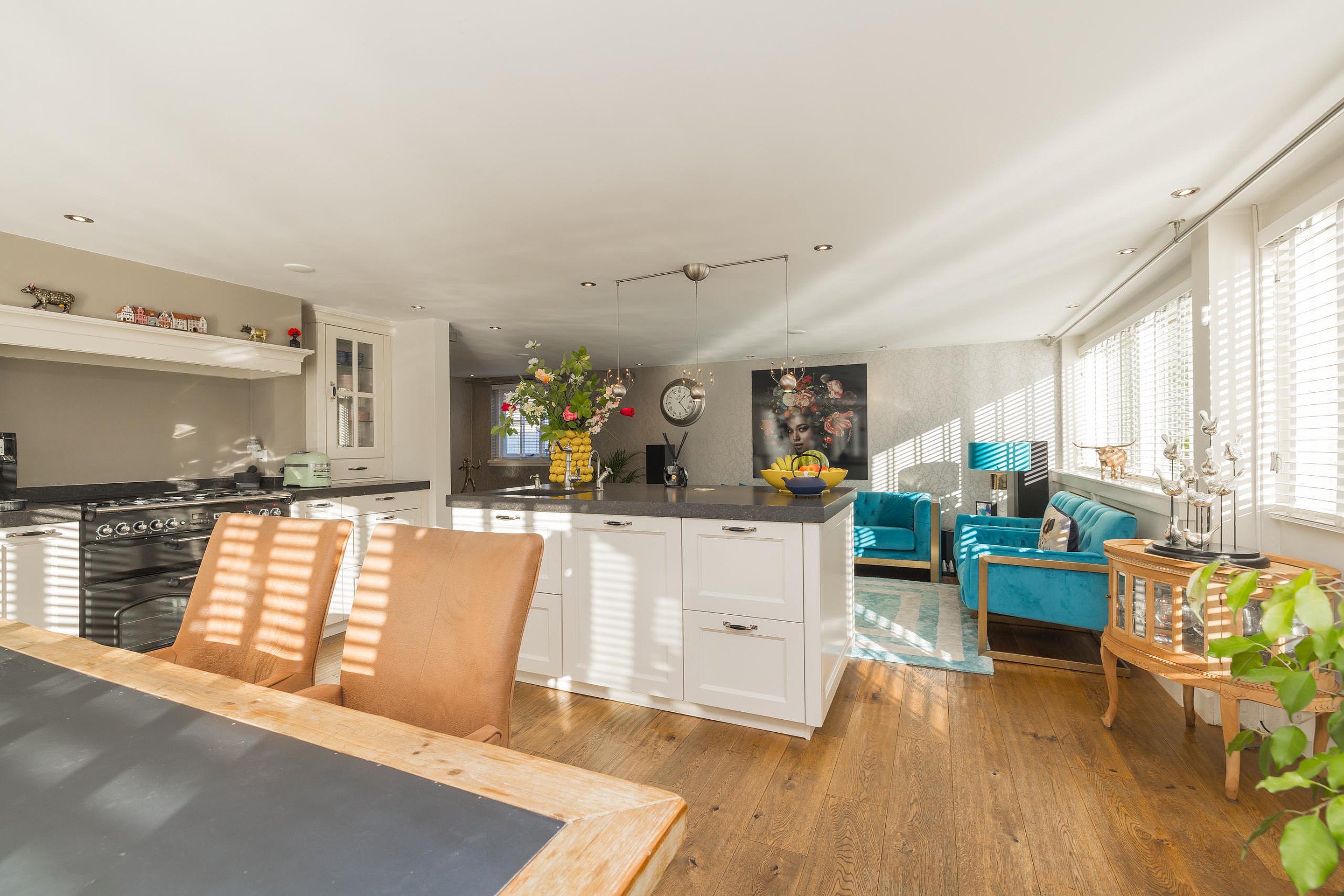Entree, hal met de meterkast en de toiletruimte met een fonteintje en ventilatie. In de uitbouw bevindt zich de prachtige badkamer met een halfronde douchcabine, ingebouwde verlichting, een dubbel wastafelmeubel en een verhoogd gelegen en zeer luxueus ligbad. De woonkamer en de eetkeuken zijn uitermate sfeervol, het is werkelijk een lust voor het oog! De in lichte kleur uitgevoerde en met de hand gemaakte keuken heeft een prachtig keukenblad van Belgische natuursteen en diverse inbouwapparatuur zoals een 4-pits gasfornuis (Falcon) met een wok brander met daaronder 3 ovens. Er is een keukeneiland met de vaatwasser (Miele), veel extra kastruimte, een spoelbak en een Quooker kraan. Er staat een losse koel/vries combinatie deze kan worden overgenomen. Via de openslaande deuren is de keurig verzorgde tuin te bereiken. De woonkamer heeft een fraaie houten vloer en ingebouwde sfeerverlichting, via de woonkamer is de kast onder de trap bereikbaar met de opstelling van de wasmachine.