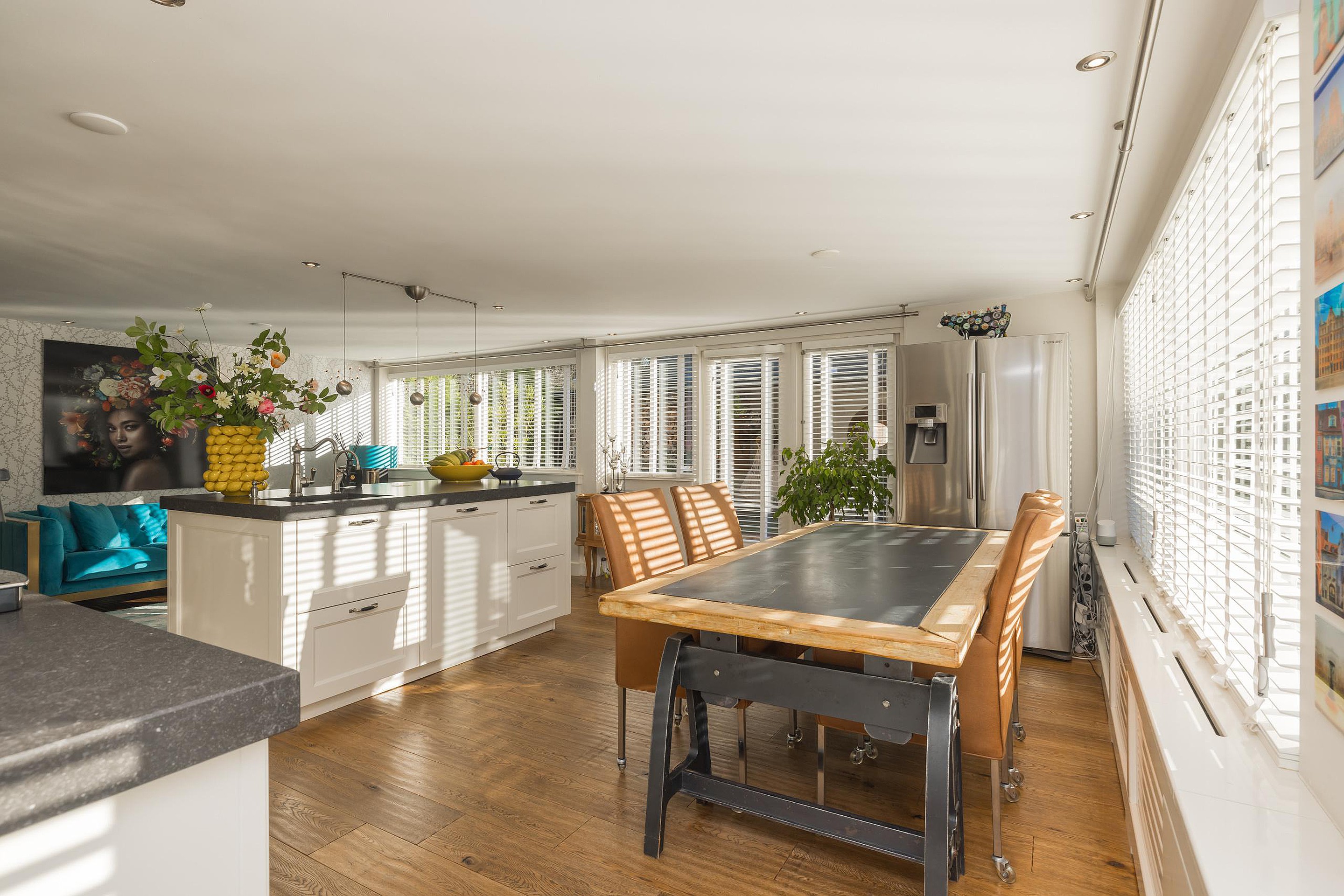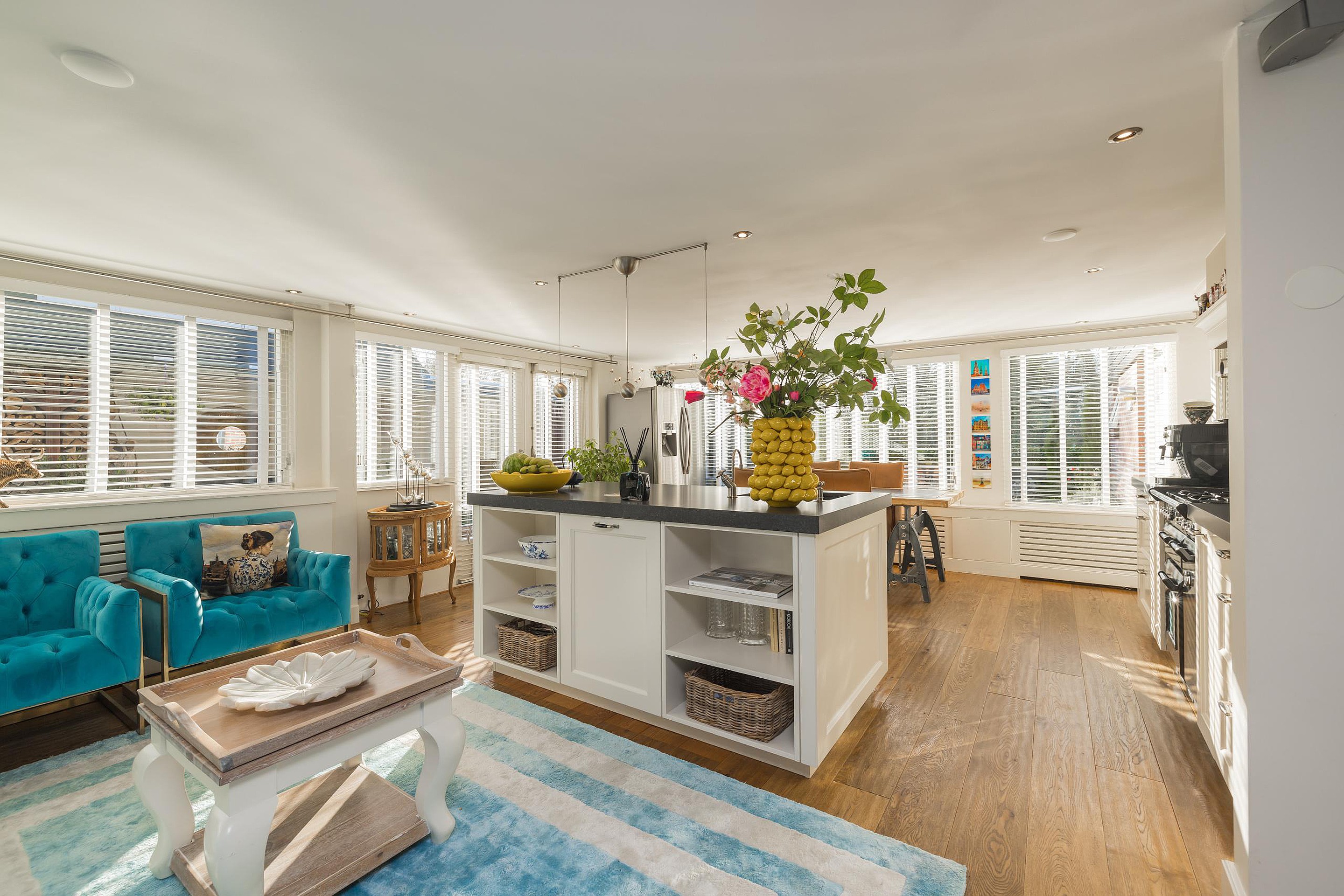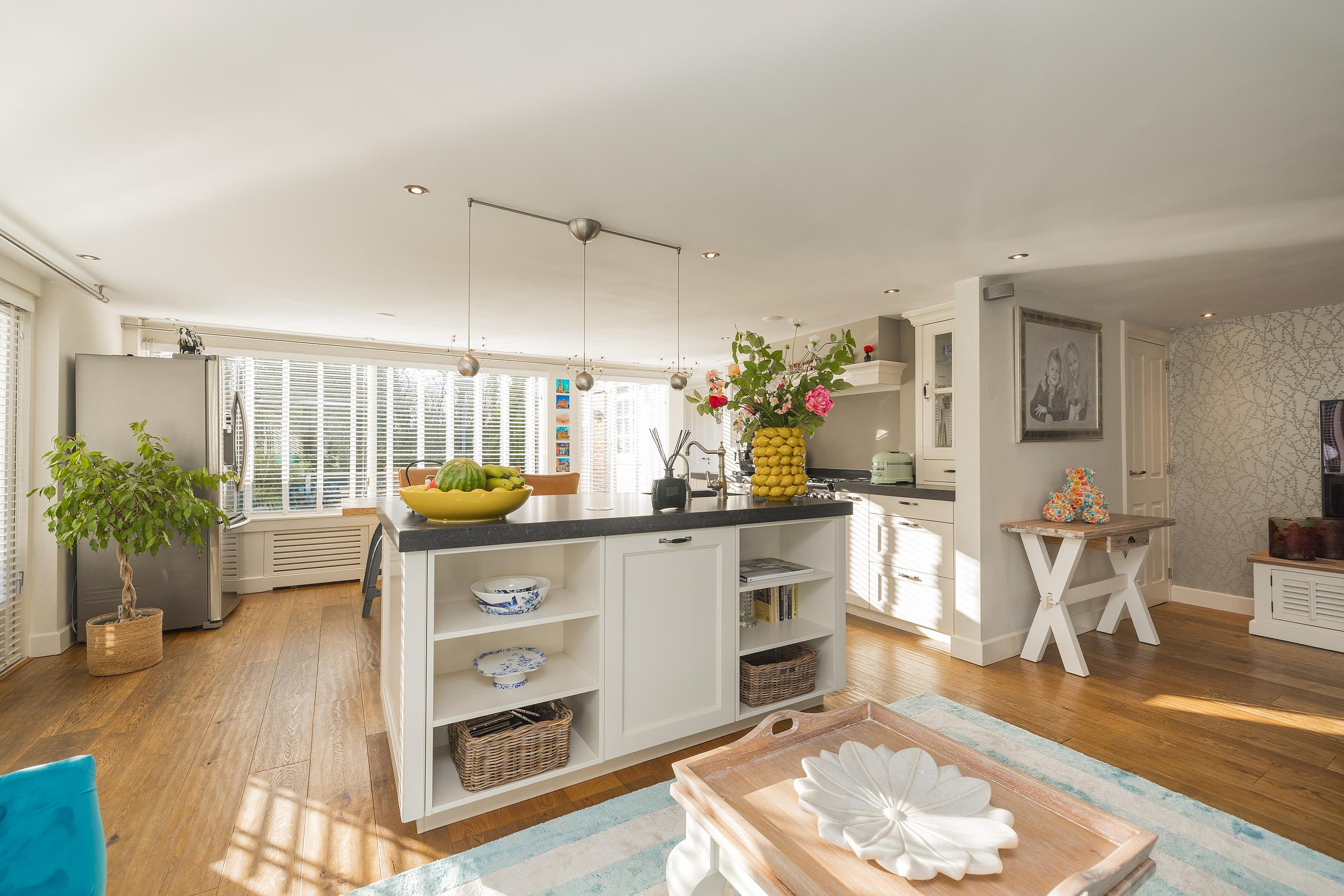 Entree, hal met de meterkast en de toiletruimte met een fonteintje en ventilatie. In de uitbouw bevindt zich de prachtige badkamer met een halfronde douchcabine, ingebouwde verlichting, een dubbel wastafelmeubel en een verhoogd gelegen en zeer luxueus ligbad. De woonkamer en de eetkeuken zijn uitermate sfeervol, het is werkelijk een lust voor het oog! De in lichte kleur uitgevoerde en met de hand gemaakte keuken heeft een prachtig keukenblad van Belgische natuursteen en diverse inbouwapparatuur zoals een 4-pits gasfornuis (Falcon) met een wok brander met daaronder 3 ovens. Er is een keukeneiland met de vaatwasser (Miele), veel extra kastruimte, een spoelbak en een Quooker kraan. Er staat een losse koel/vries combinatie deze kan worden overgenomen. Via de openslaande deuren is de keurig verzorgde tuin te bereiken. De woonkamer heeft een fraaie houten vloer en ingebouwde sfeerverlichting, via de woonkamer is de kast onder de trap bereikbaar met de opstelling van de wasmachine.