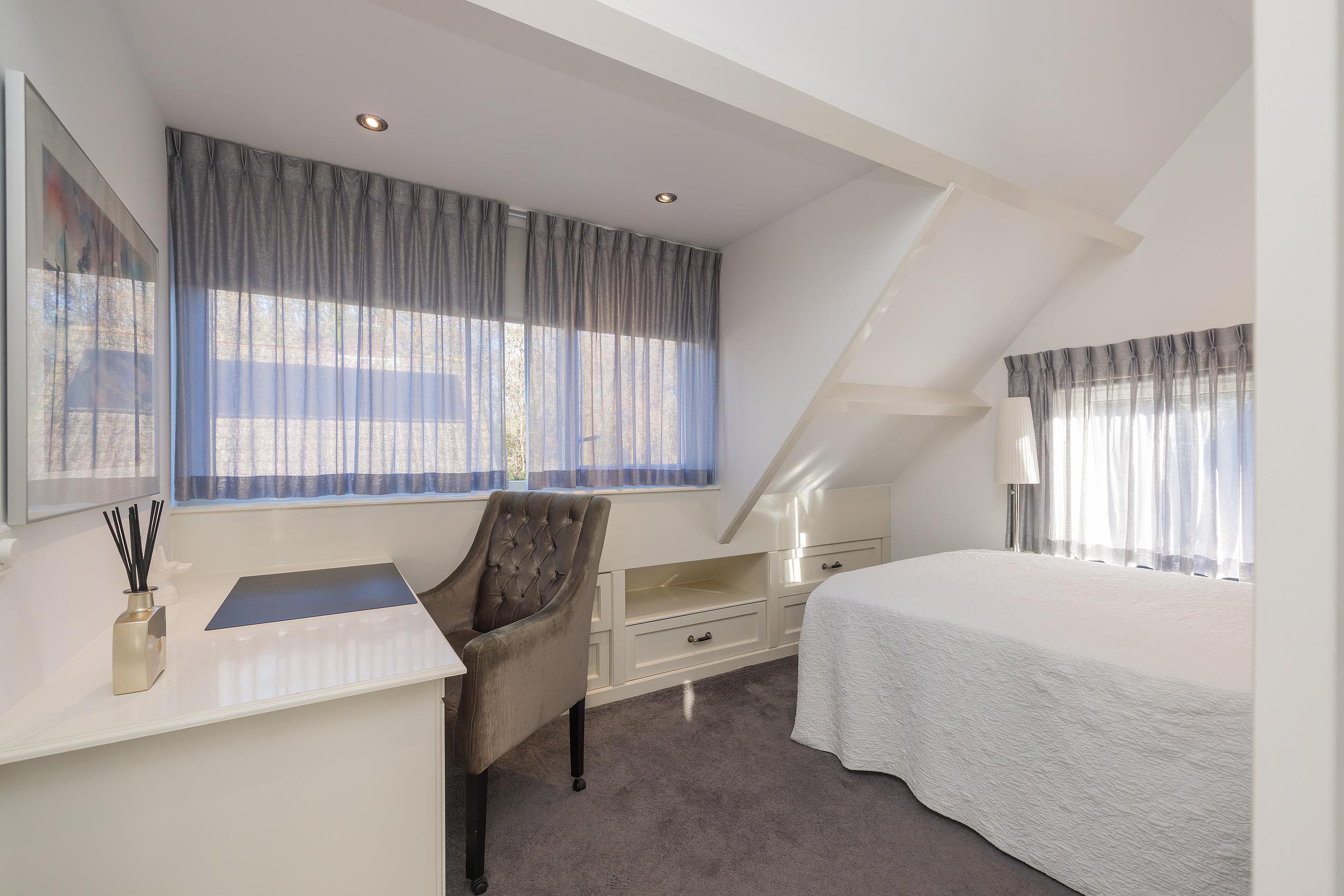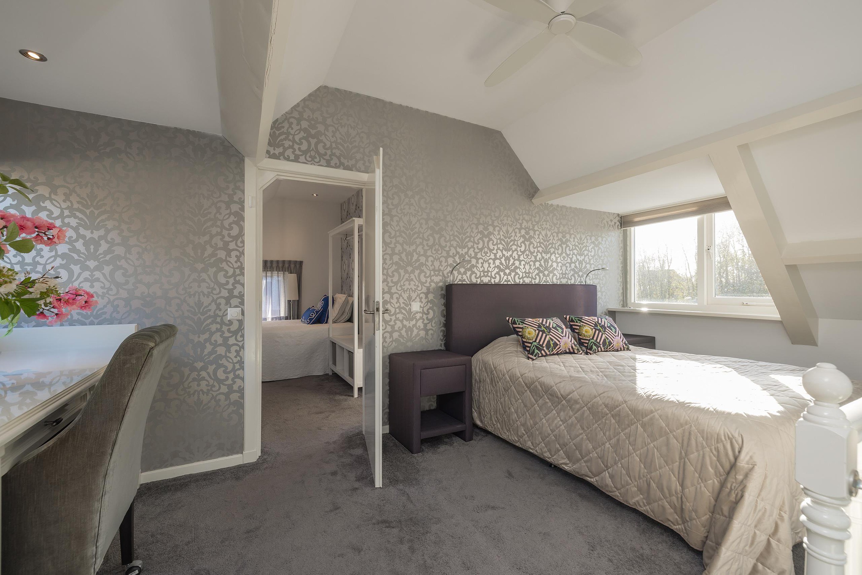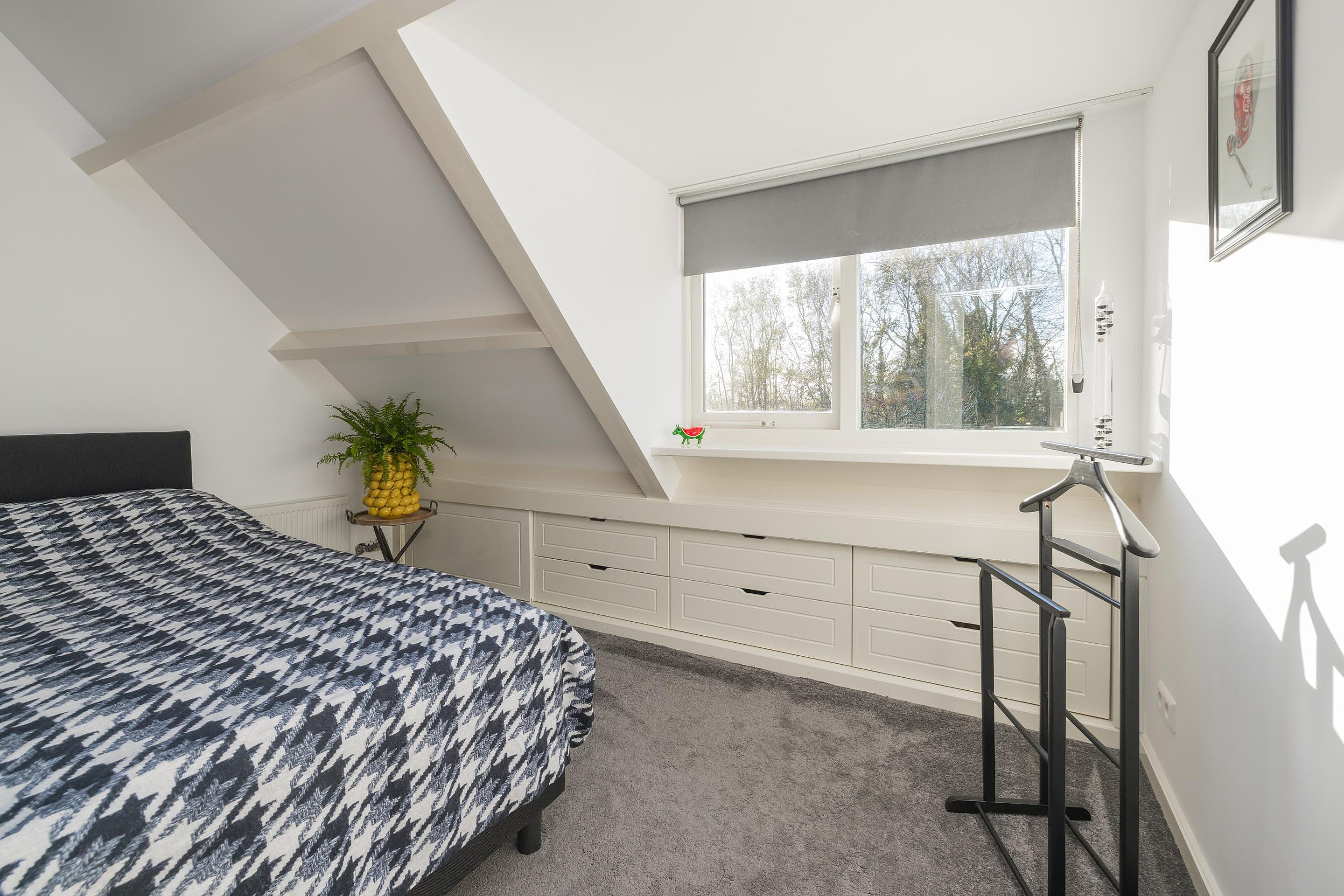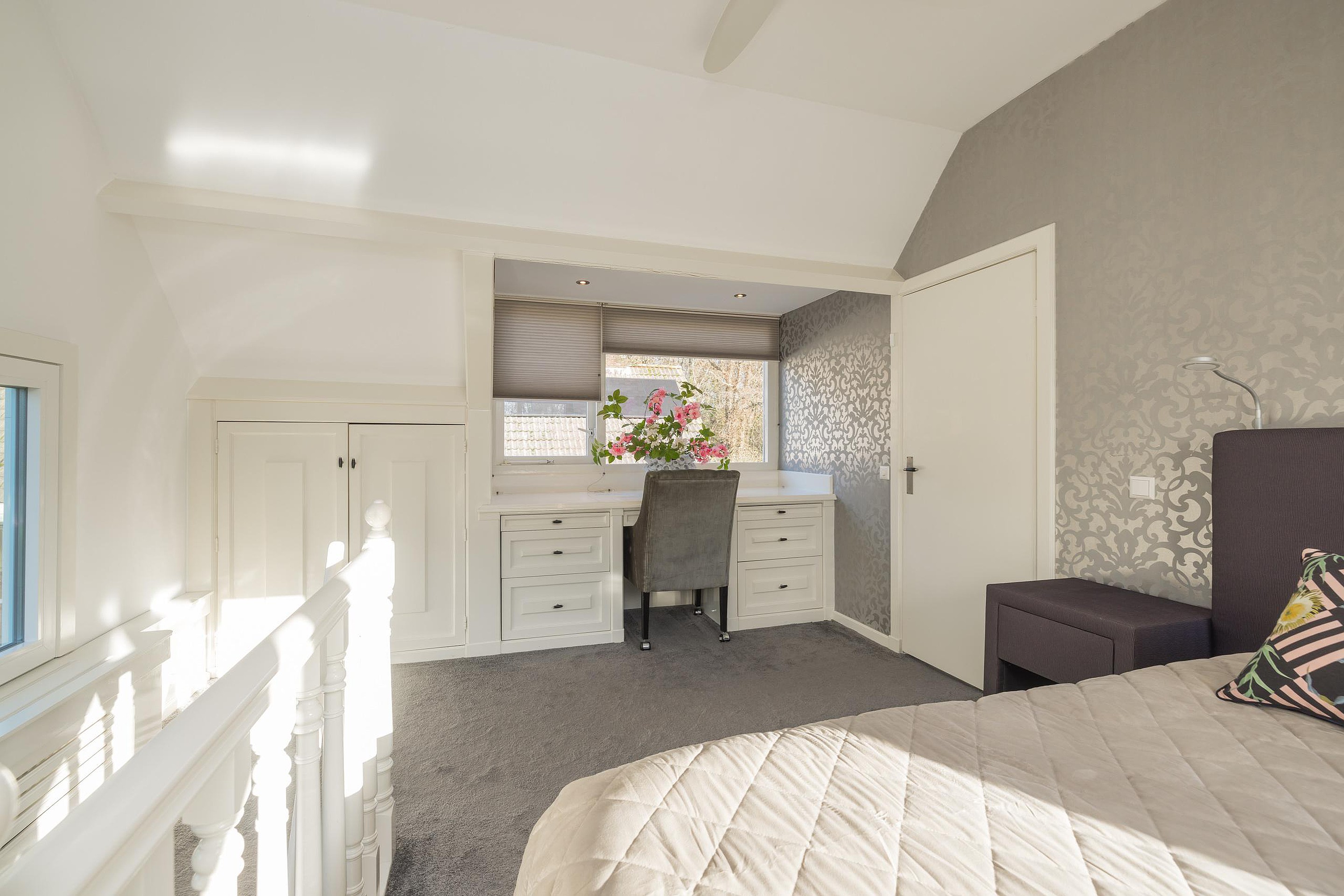 In de tweede hal is de garderobe en keurig weggewerkt in een kast de cv-ketel (Intergas 2010). Via de trap is de eerste verdieping te bereiken en ook hier kijkt u echt uw ogen uit! De eerste slaapkamer heeft aan de voor- en de achterzijde een dakkapel en zowel de kastruimte als het bureau zijn op maat gemaakt, vanuit het dakkapel aan de voorzijde heeft u vrij uitzicht over het voor de woning gelegen veldje. Ook de tweede slaapkamer is een plaatje en ook hier is de kastruimte en het bureau op maat gemaakt, via deze kamer is de bergruimte in de nok bereikbaar. Tenslotte de derde en aangenaam lichte slaapkamer en ik val in herhaling want ook in deze kamer is alles op maat gemaakt. Ook vanuit deze kamer heeft u uitzicht over het naast de woning gelegen veldje.