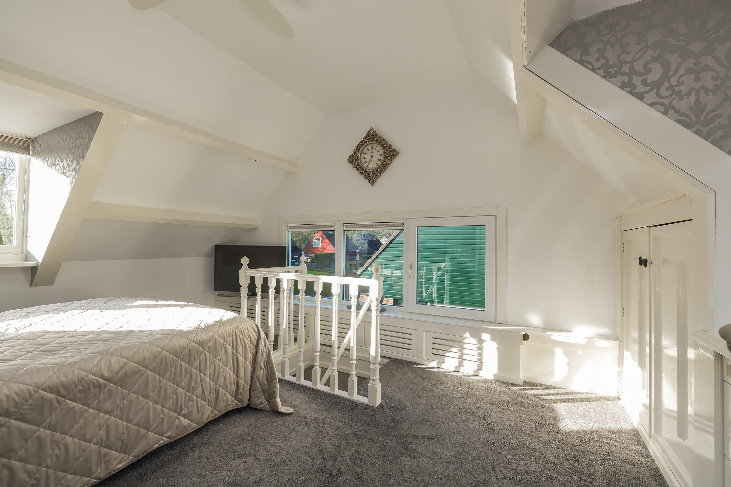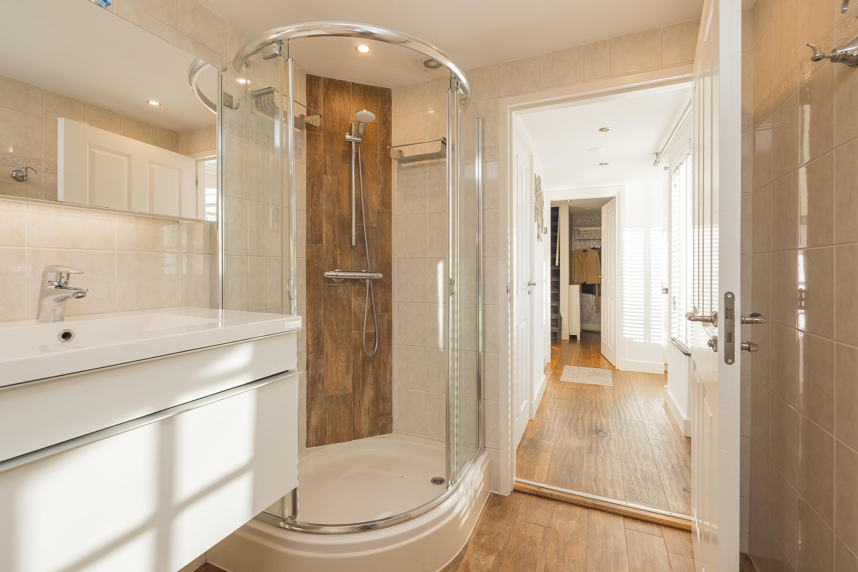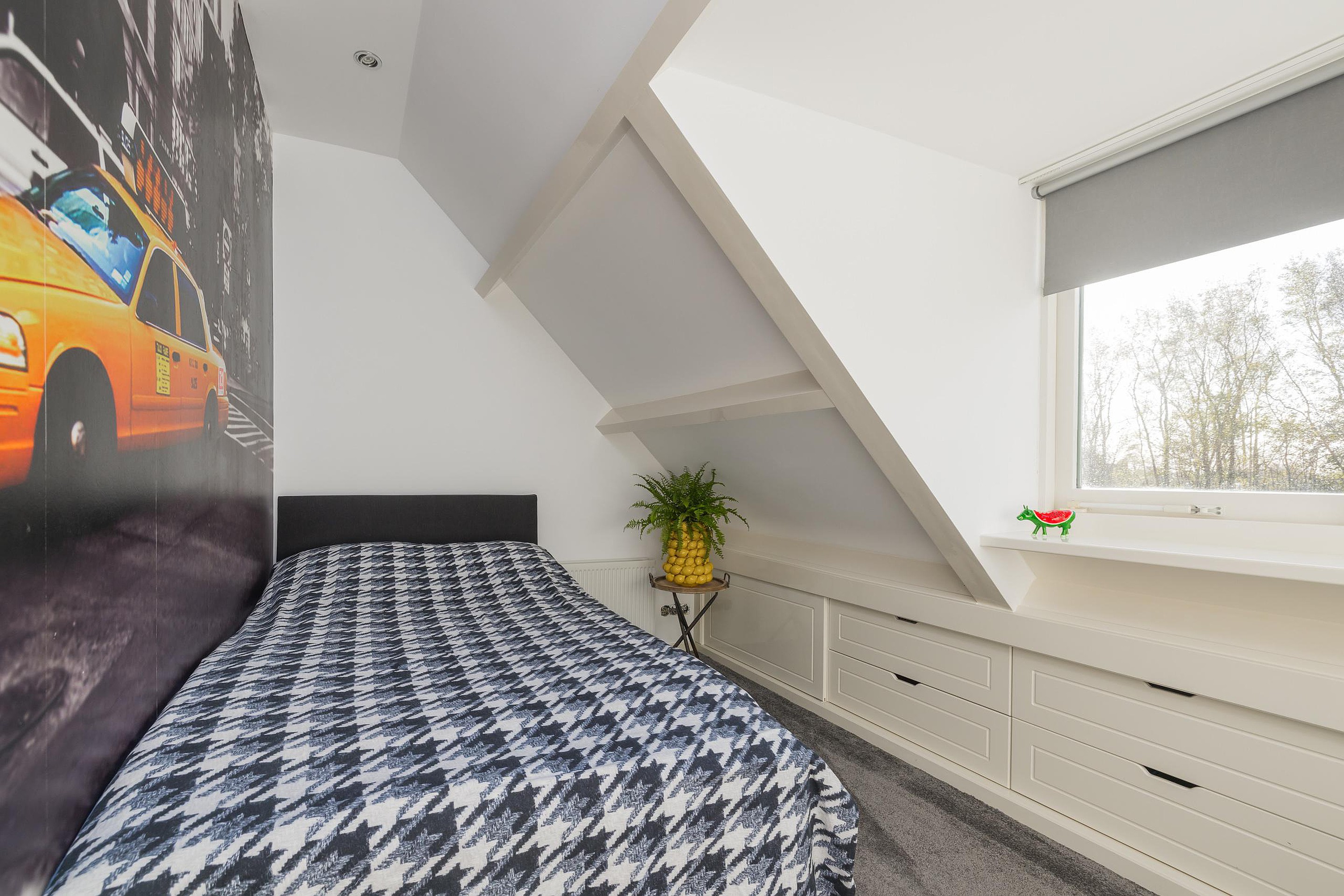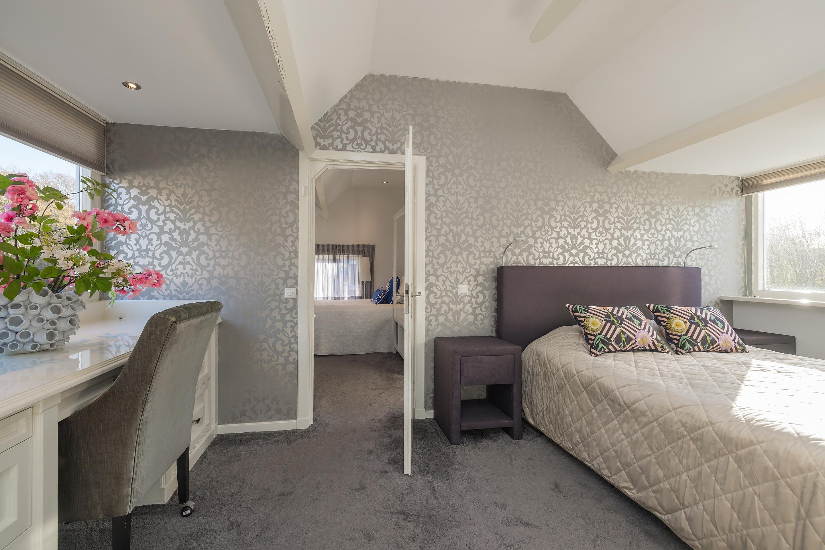 In de tweede hal is de garderobe en keurig weggewerkt in een kast de cv-ketel (Intergas 2010). Via de trap is de eerste verdieping te bereiken en ook hier kijkt u echt uw ogen uit! De eerste slaapkamer heeft aan de voor- en de achterzijde een dakkapel en zowel de kastruimte als het bureau zijn op maat gemaakt, vanuit het dakkapel aan de voorzijde heeft u vrij uitzicht over het voor de woning gelegen veldje. Ook de tweede slaapkamer is een plaatje en ook hier is de kastruimte en het bureau op maat gemaakt, via deze kamer is de bergruimte in de nok bereikbaar. Tenslotte de derde en aangenaam lichte slaapkamer en ik val in herhaling want ook in deze kamer is alles op maat gemaakt. Ook vanuit deze kamer heeft u uitzicht over het naast de woning gelegen veldje.