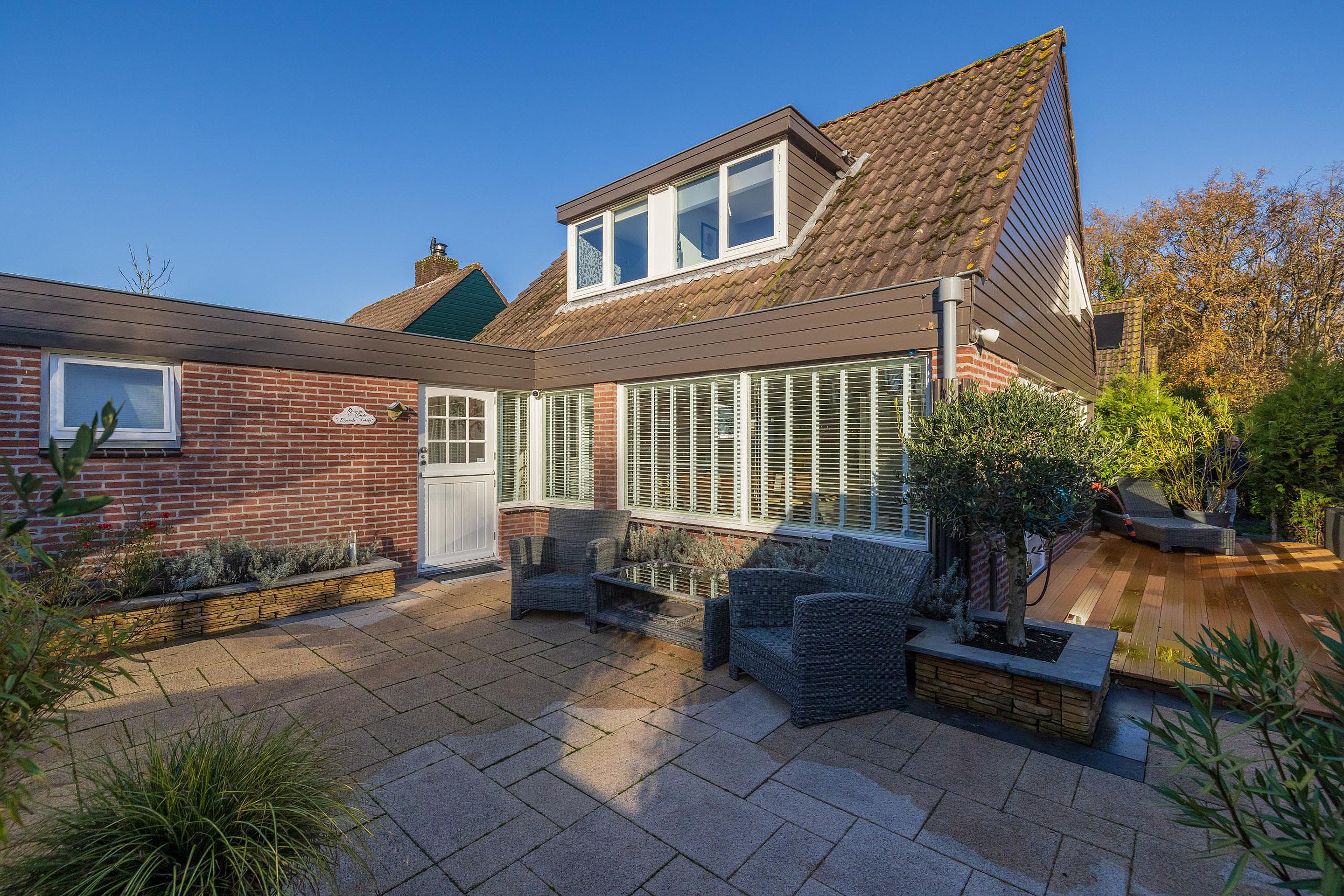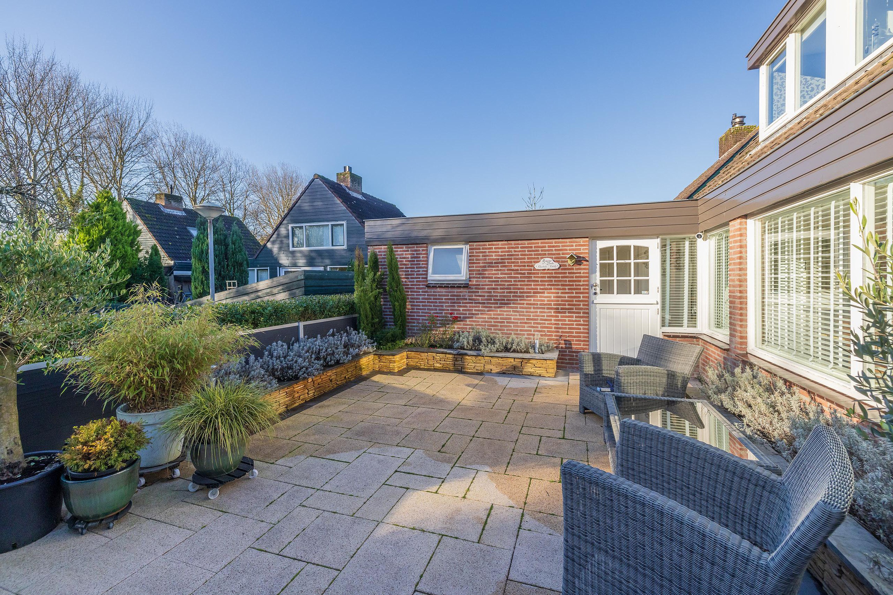 Een keurig verzorgde achtertuin met vrij uitzicht over het veldje en de optimale zonligging op het zuidwesten.