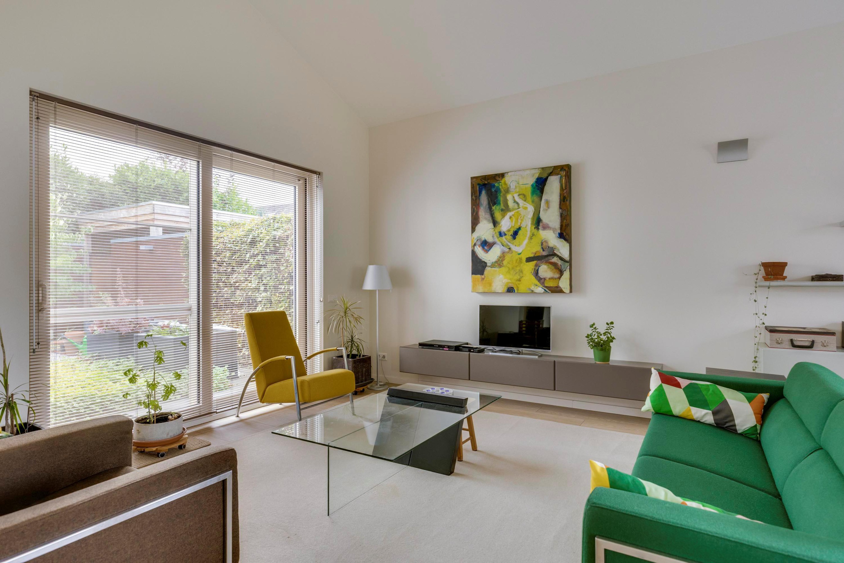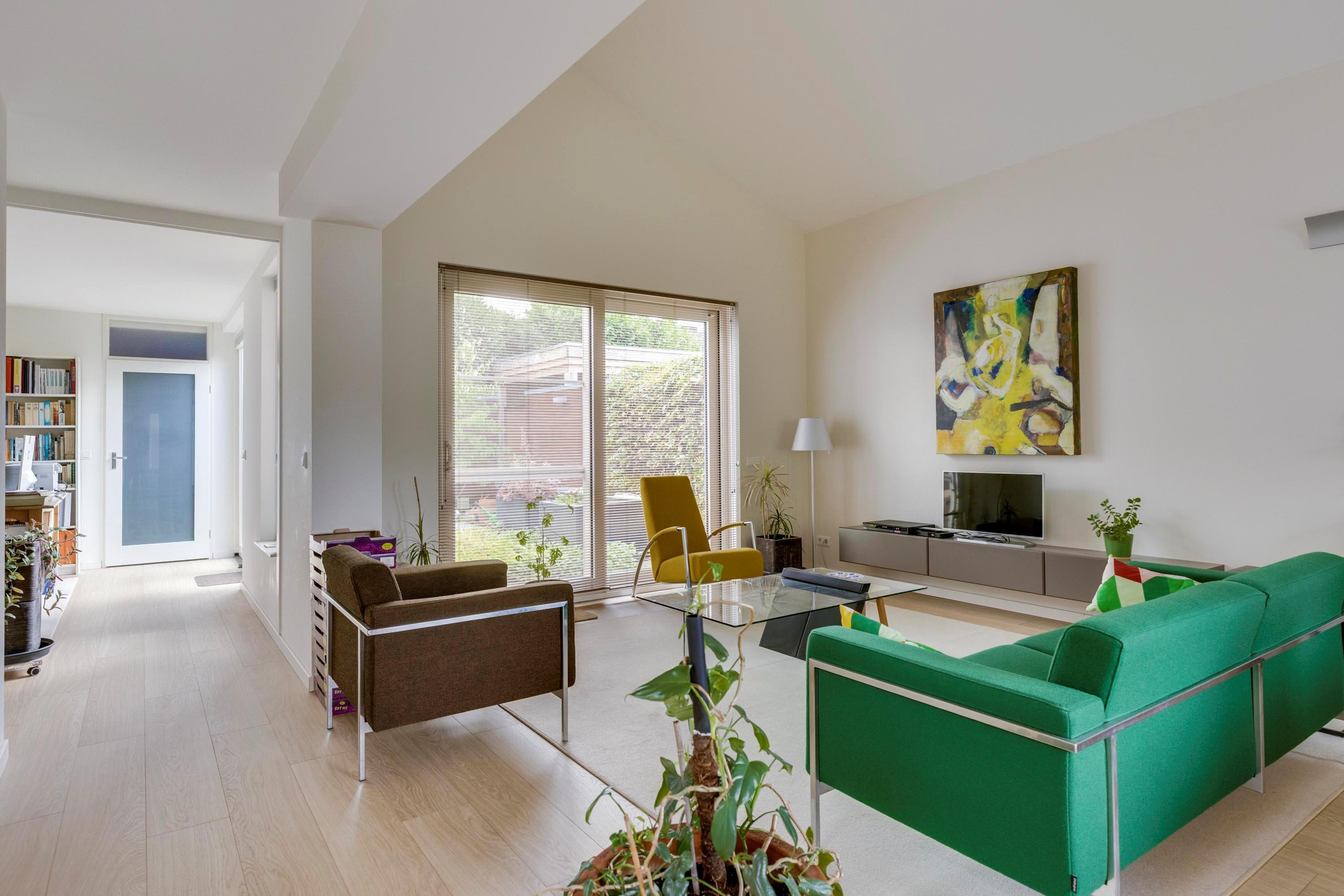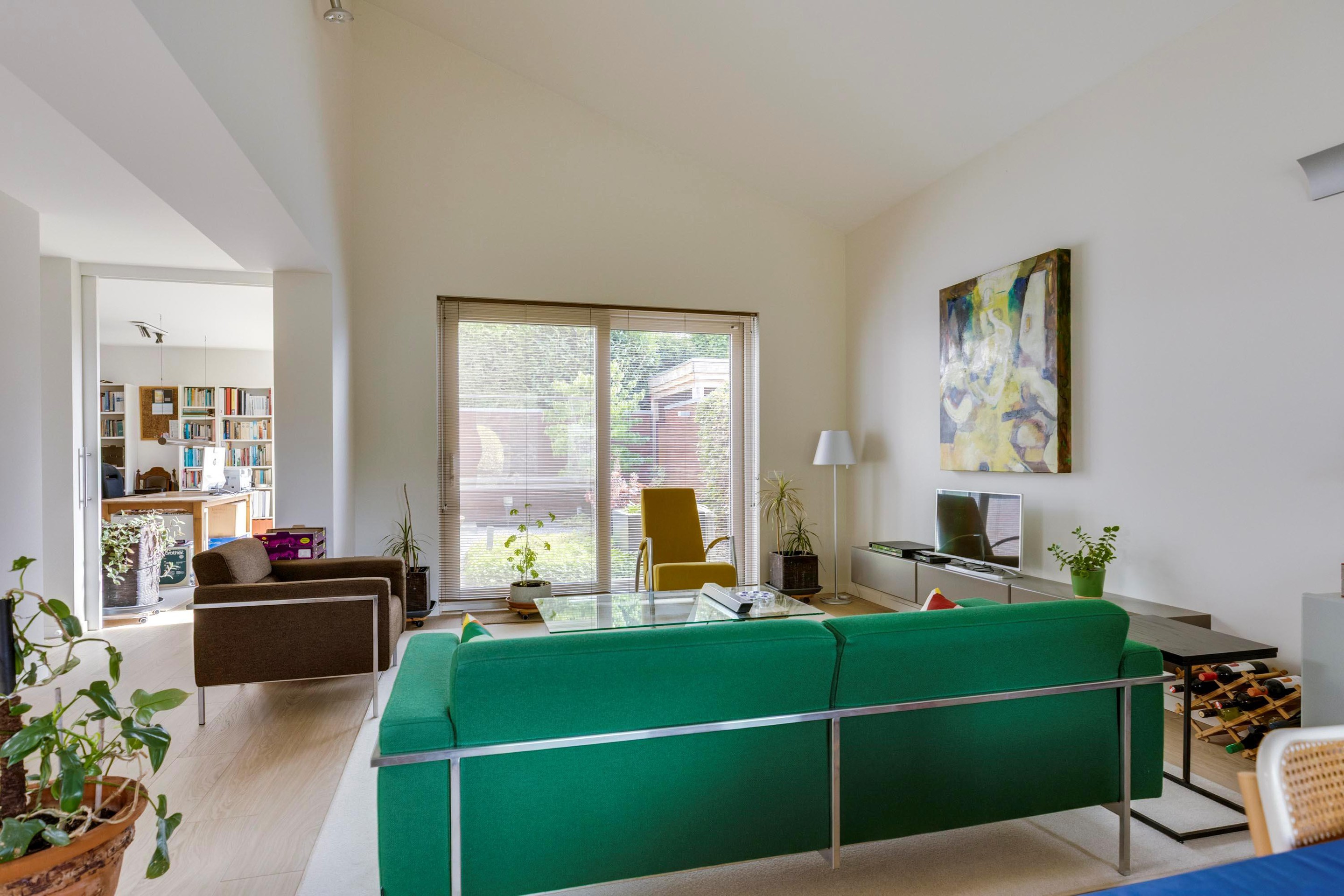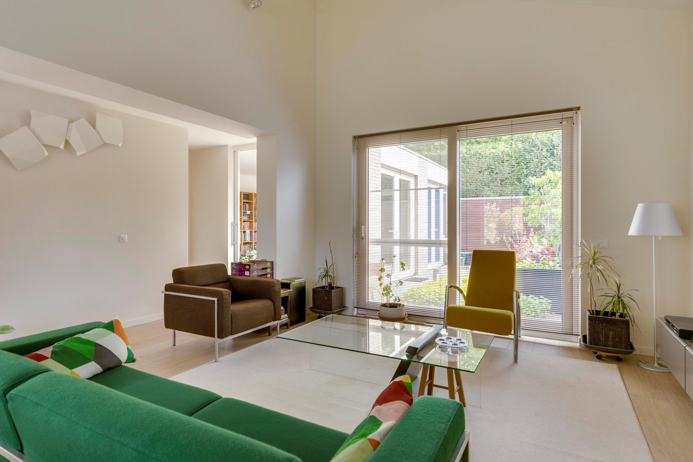 De woonkamer is een echte eyecatcher met zijn schuin omhooglopend plafond (tot wel 4,46 meter!) en grote raampartijen aan zowel de voor- als achterzijde. Dit zorgt voor een zee aan licht en ruimte. Aan de achterzijde vindt u een schuifpui met hordeur naar de tuin. Tevens is hier een elektrisch bedienbare zonneluifel aanwezig.