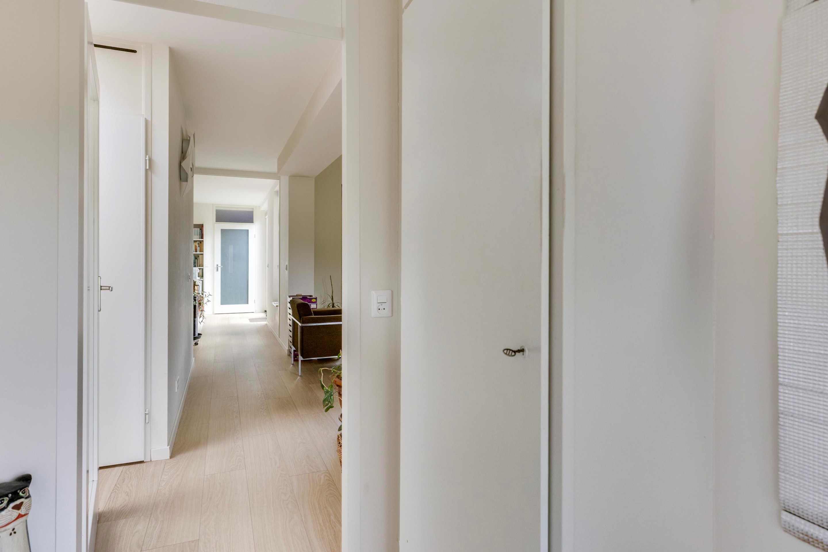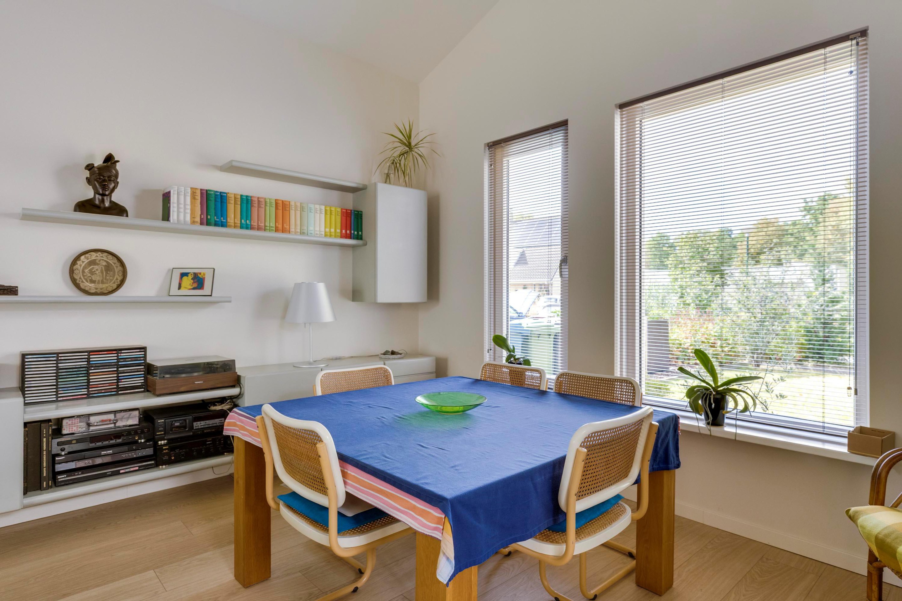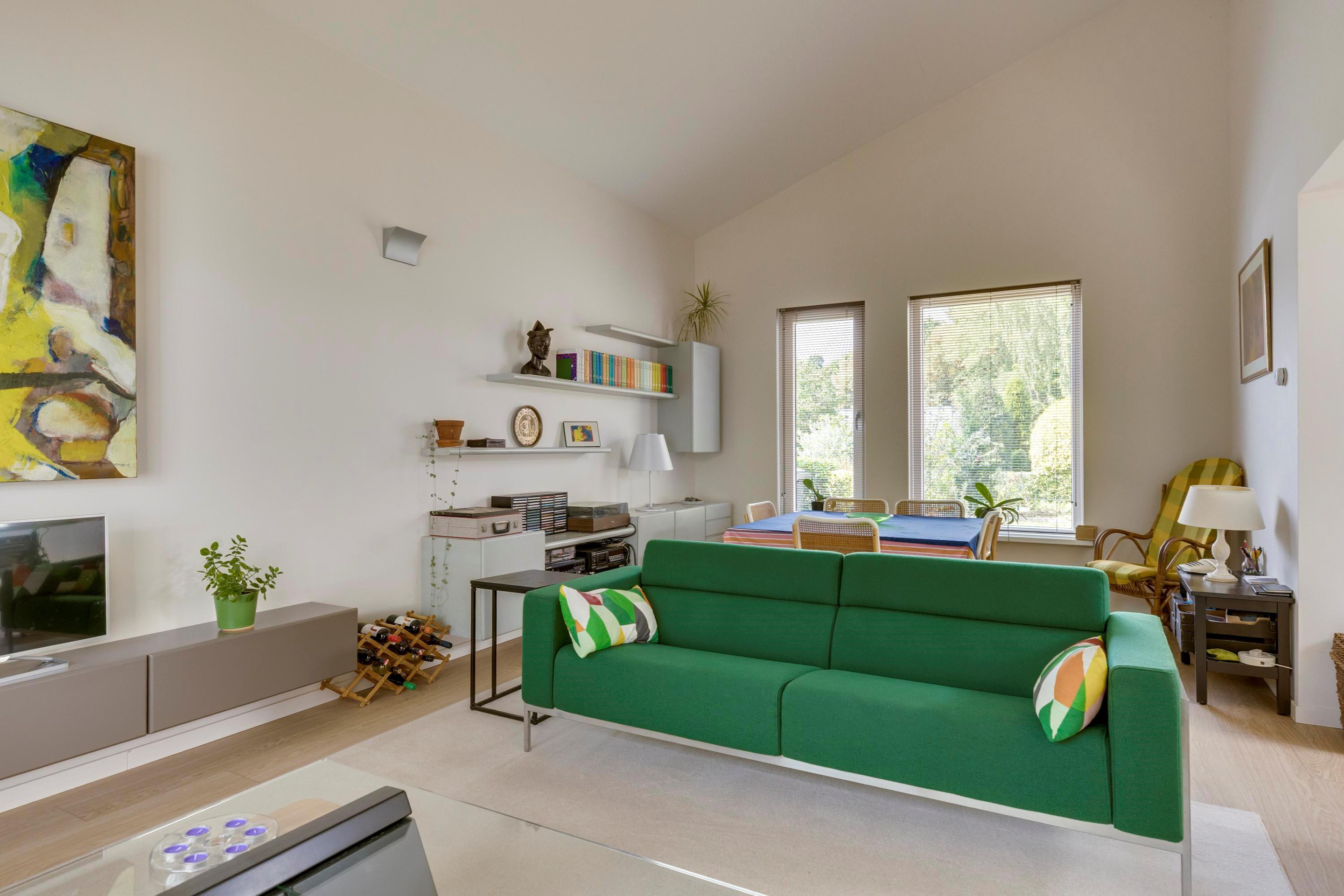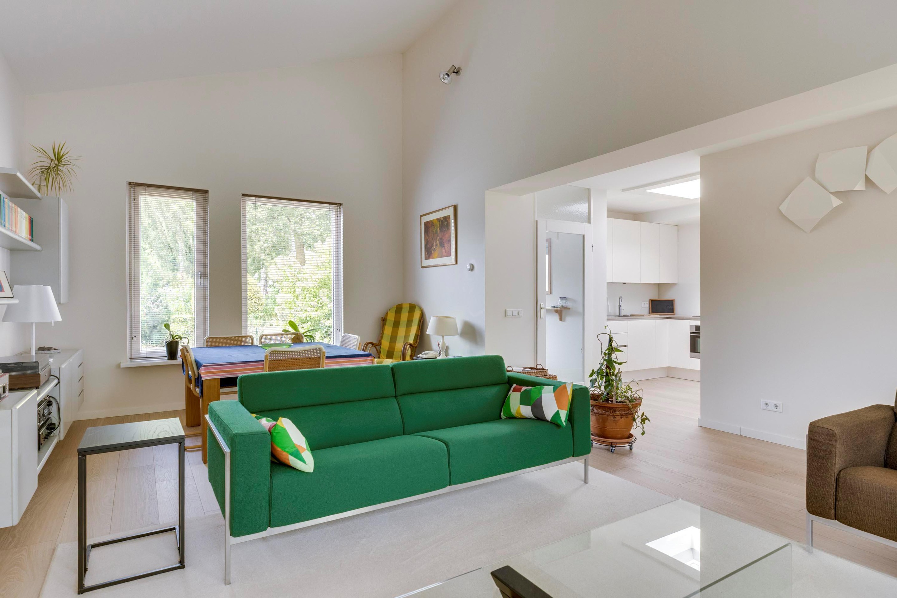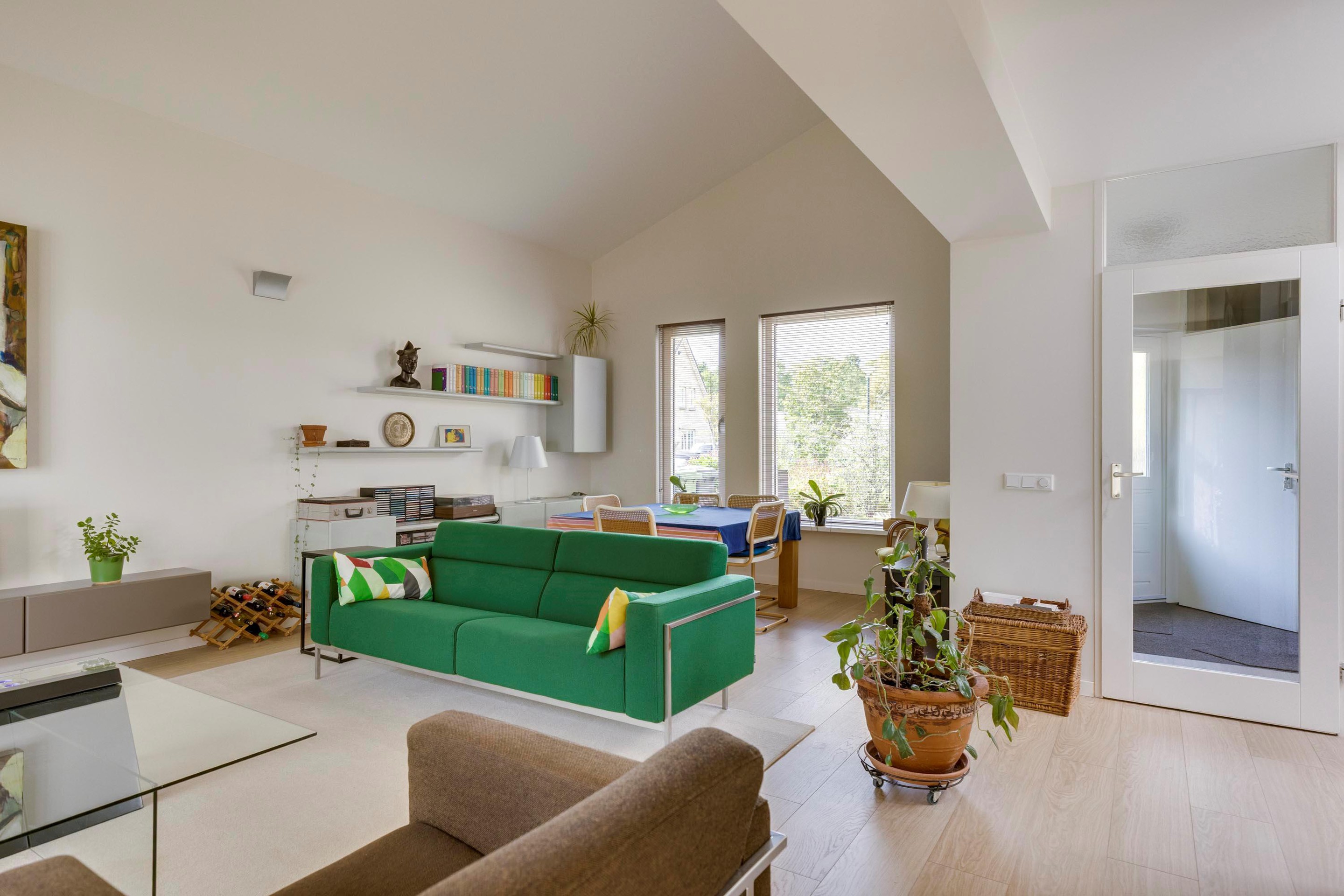 De woonkamer is een echte eyecatcher met zijn schuin omhooglopend plafond (tot wel 4,46 meter!) en grote raampartijen aan zowel de voor- als achterzijde. Dit zorgt voor een zee aan licht en ruimte. Aan de achterzijde vindt u een schuifpui met hordeur naar de tuin. Tevens is hier een elektrisch bedienbare zonneluifel aanwezig.