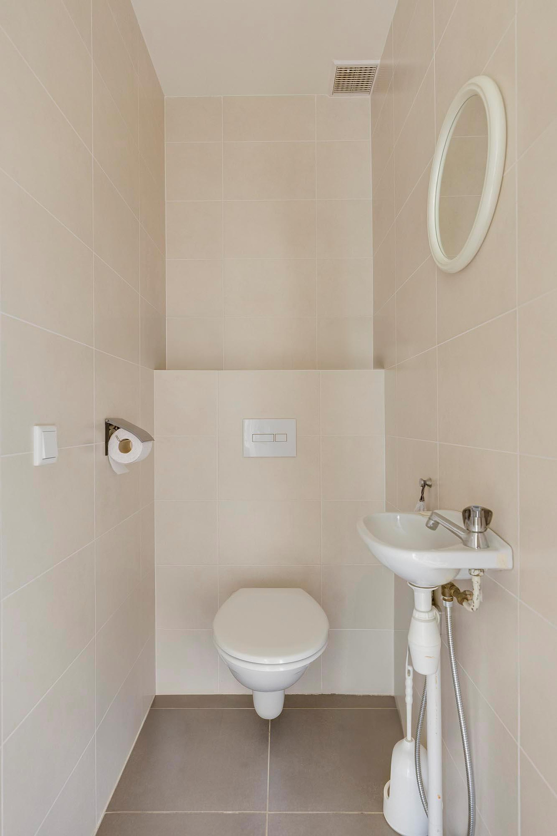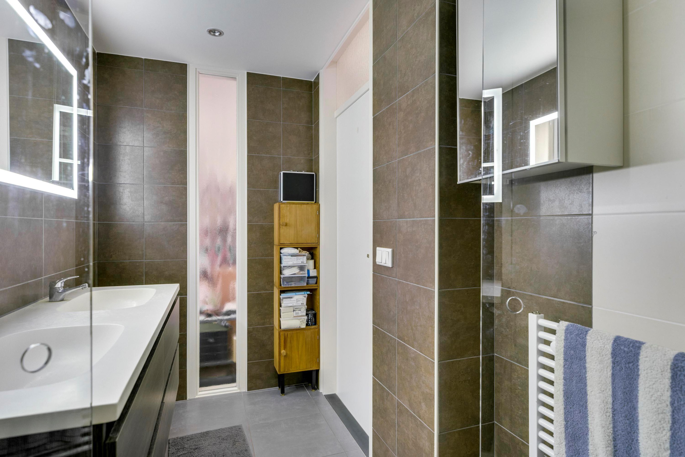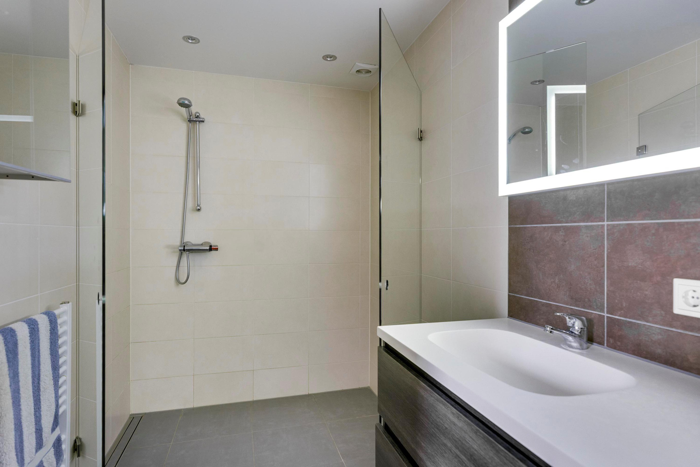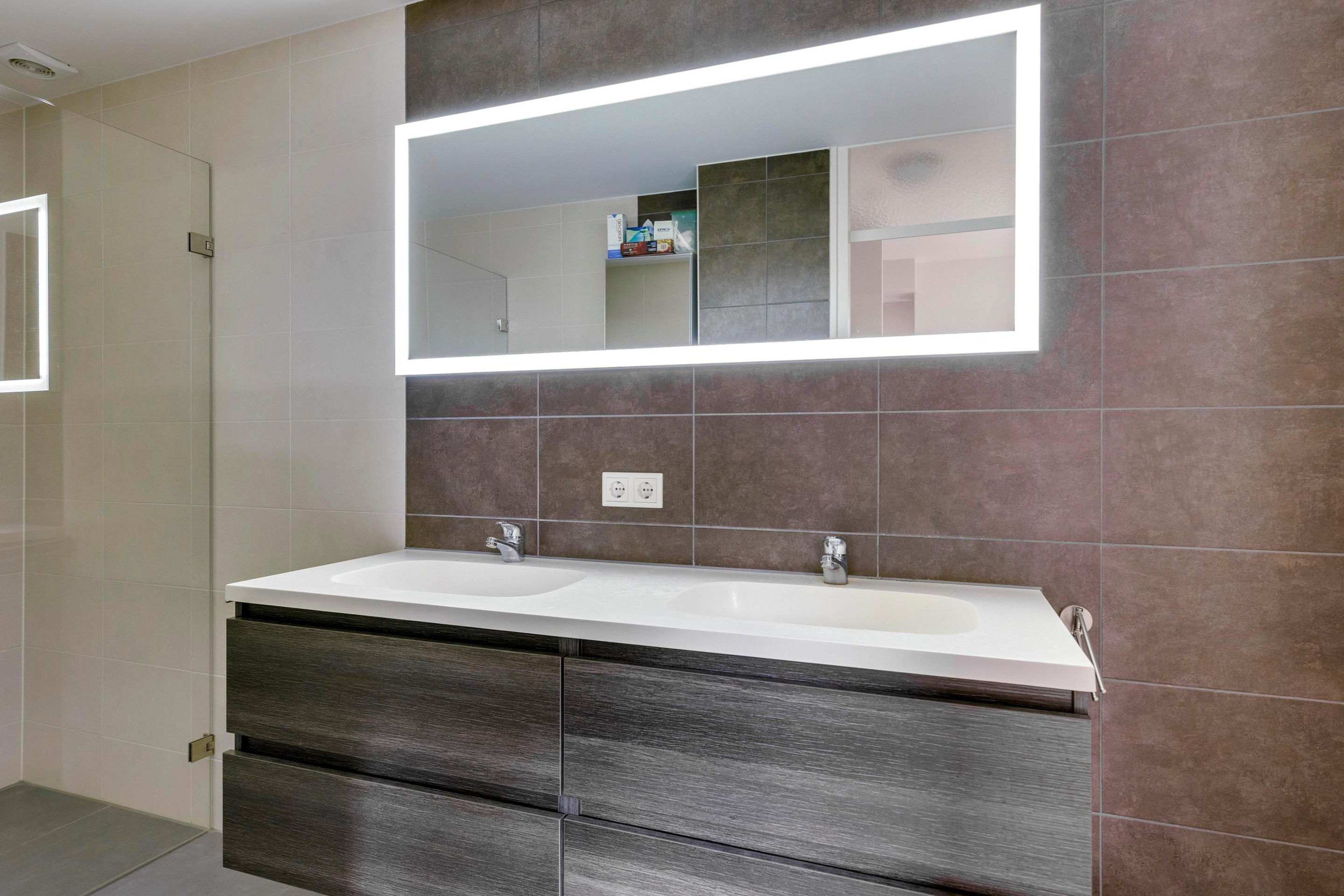 Middels een portaaltje is er toegang tot de badkamer en de toiletruimte. De toiletruimte is modern, volledig betegeld en uitgerust met een vrijdragend toilet met handdouche en fonteintje. De badkamer is eveneens stijlvol afgewerkt en beschikt over een royale inloopdouche, een badkamermeubel met duo wastafel, inbouwspots en een handdoekenradiator.