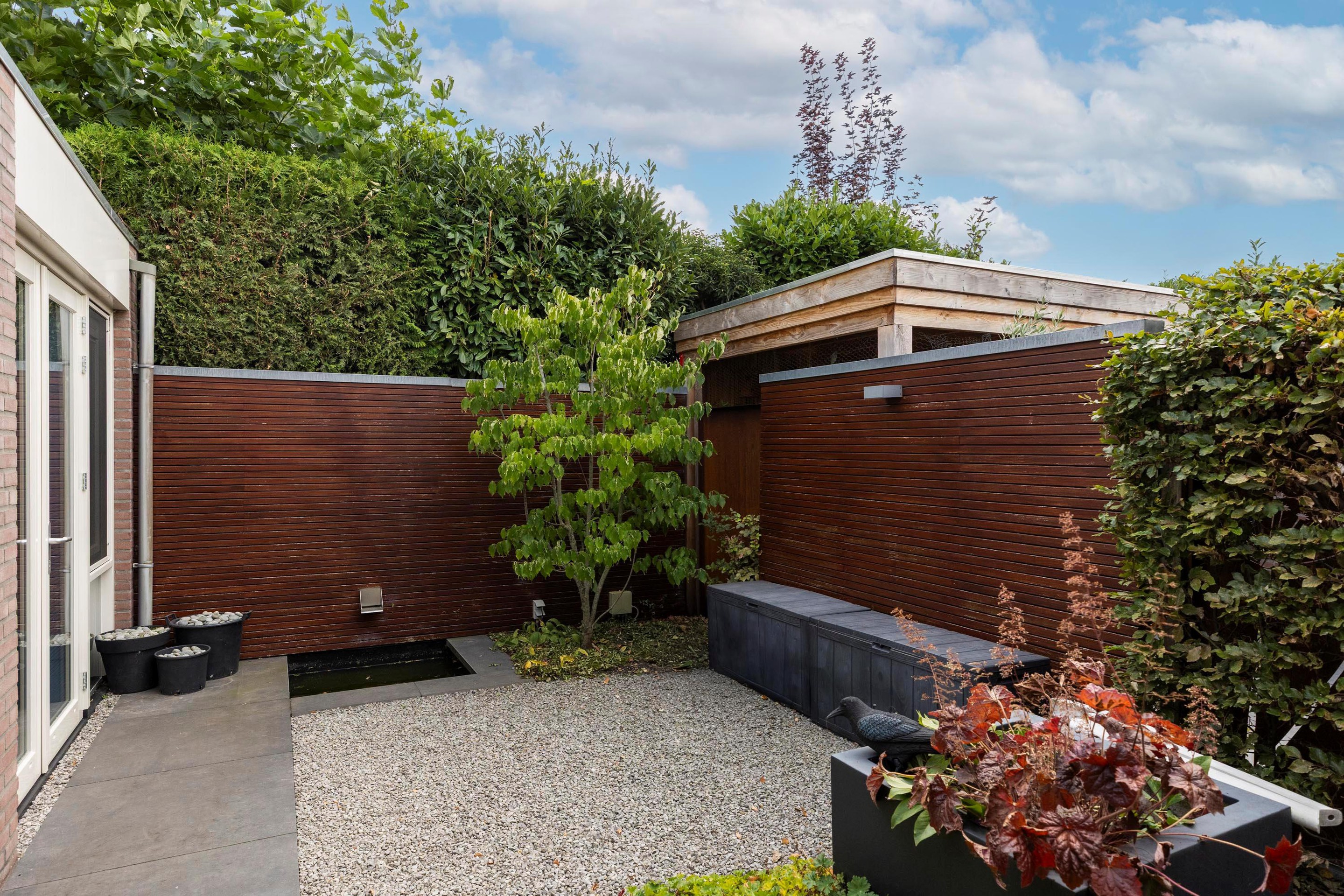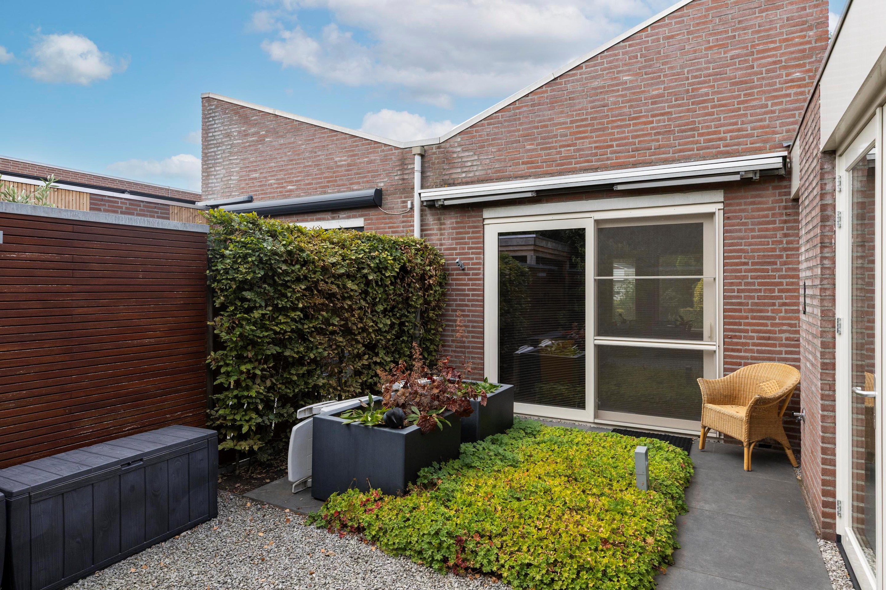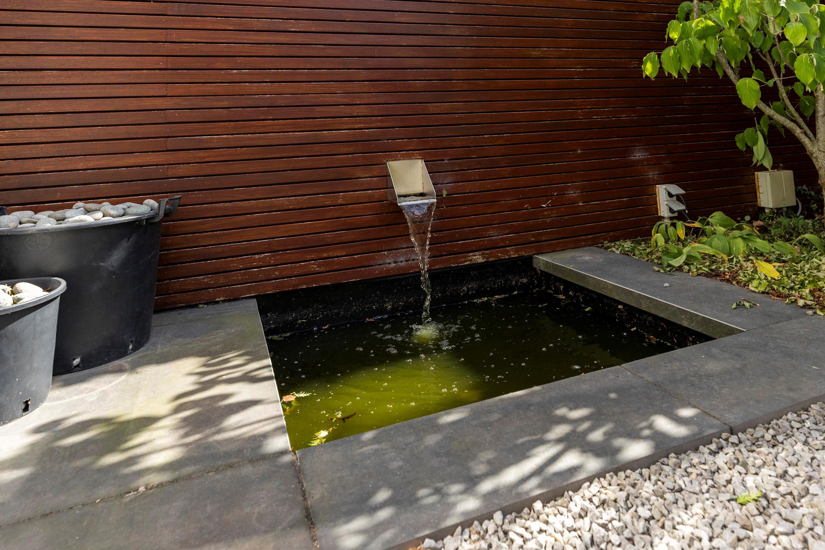 De knusse, onderhoudsvriendelijke patiotuin (7,40 x 4,02 m) is sfeervol aangelegd met bestrating, kiezels, vaste beplanting en een waterpartij. Ook zijn er een buitenkraan (eveneens in de voortuin) en verlichting aanwezig. Een heerlijke plek om in alle rust te genieten.