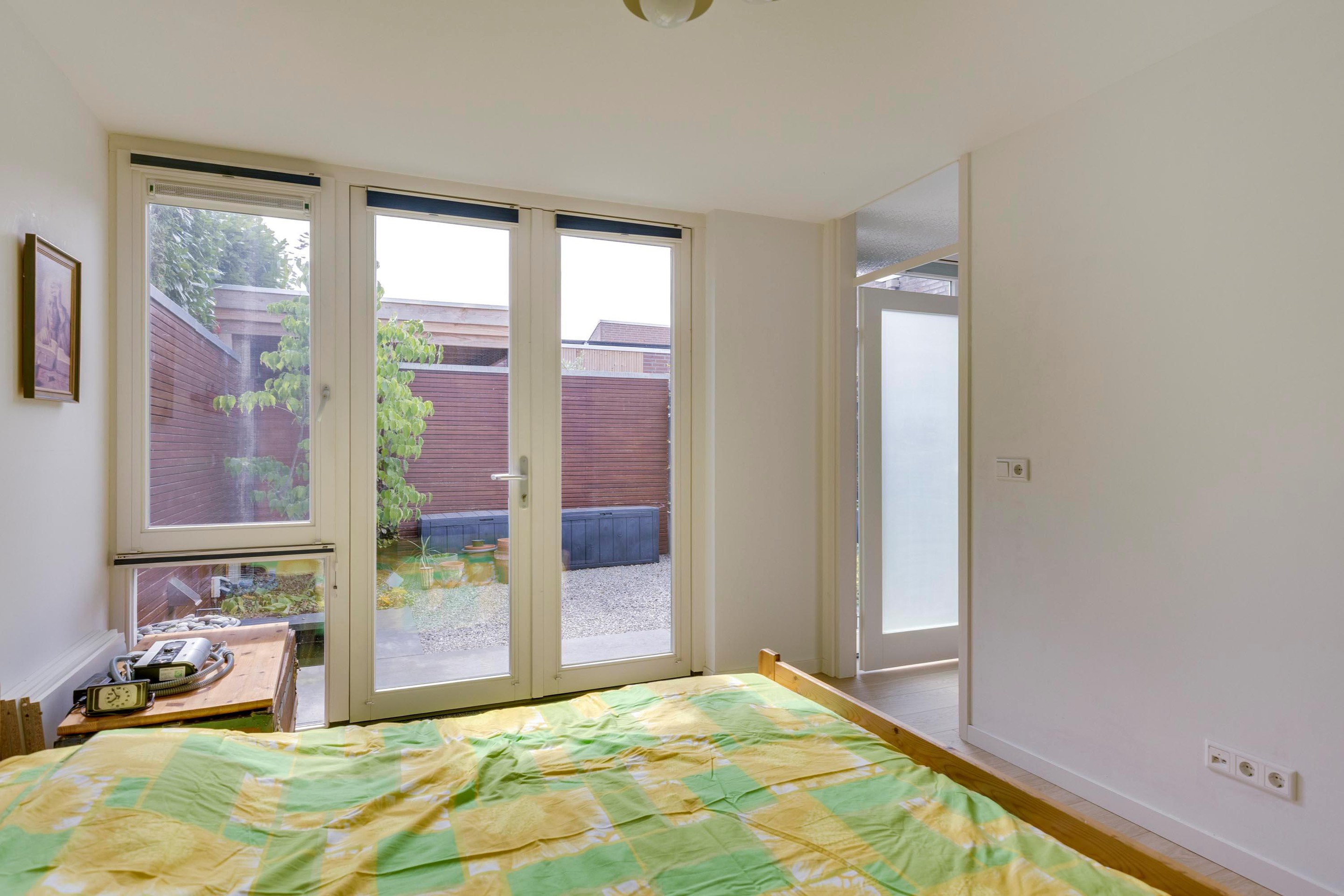 Aansluitend de ruime en lichte slaapkamer (3.91m bij 3.12m) met eveneens openslaande deuren naar de tuin en nog een extra tuimelraam.